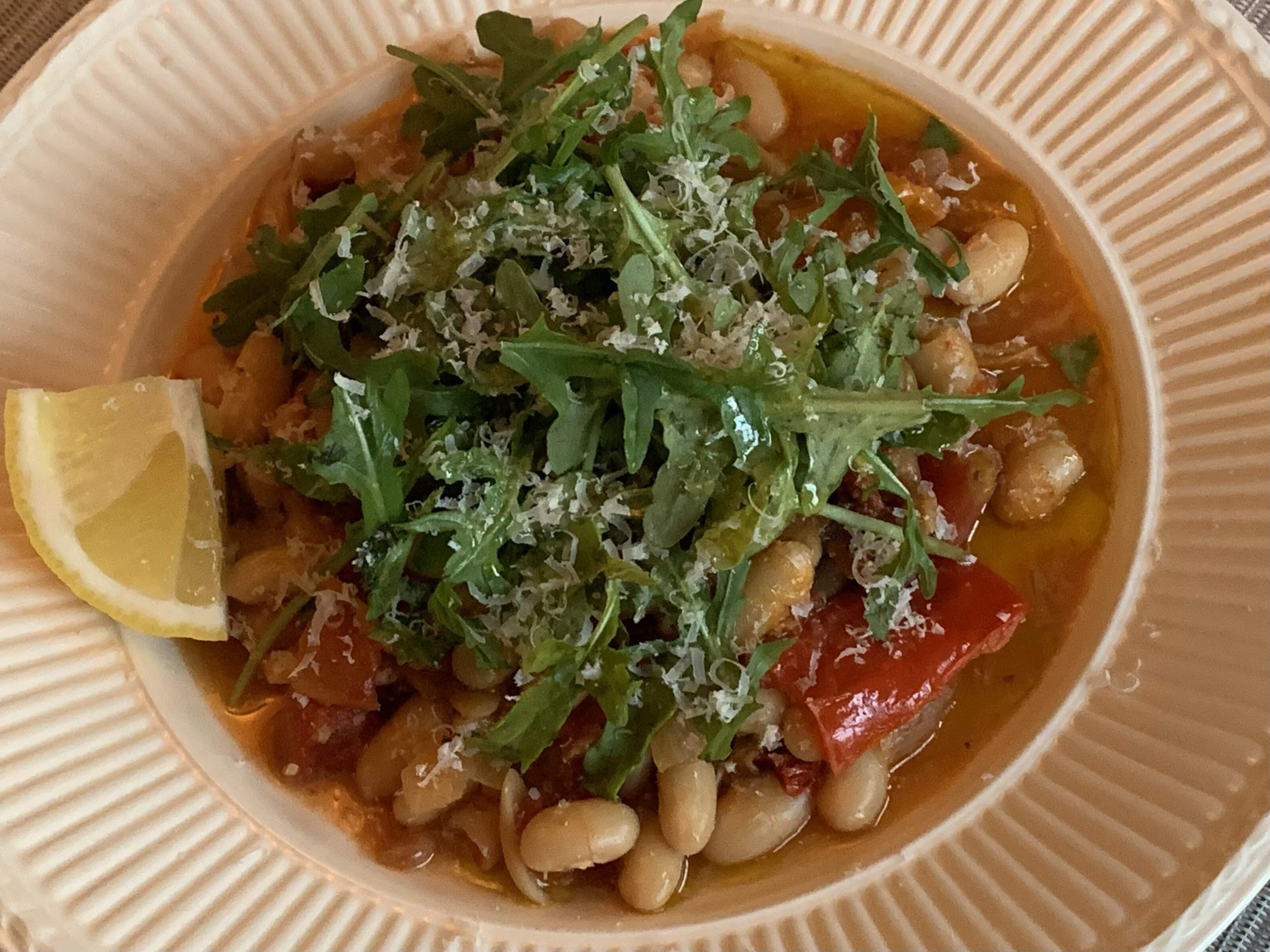 Last of the sausage/bean and vegetable soup from the freezer dusted with Parm/Regg.