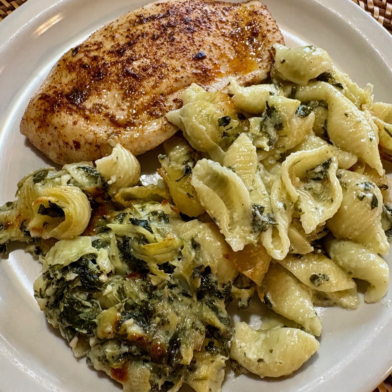 I made a half-recipe, using frozen spinach, canned artichokes, and subbing half the cream with milk. To go along with, there were brined and baked chicken breasts, prepped with EVOO and Penzeys Galina Street seasoning.