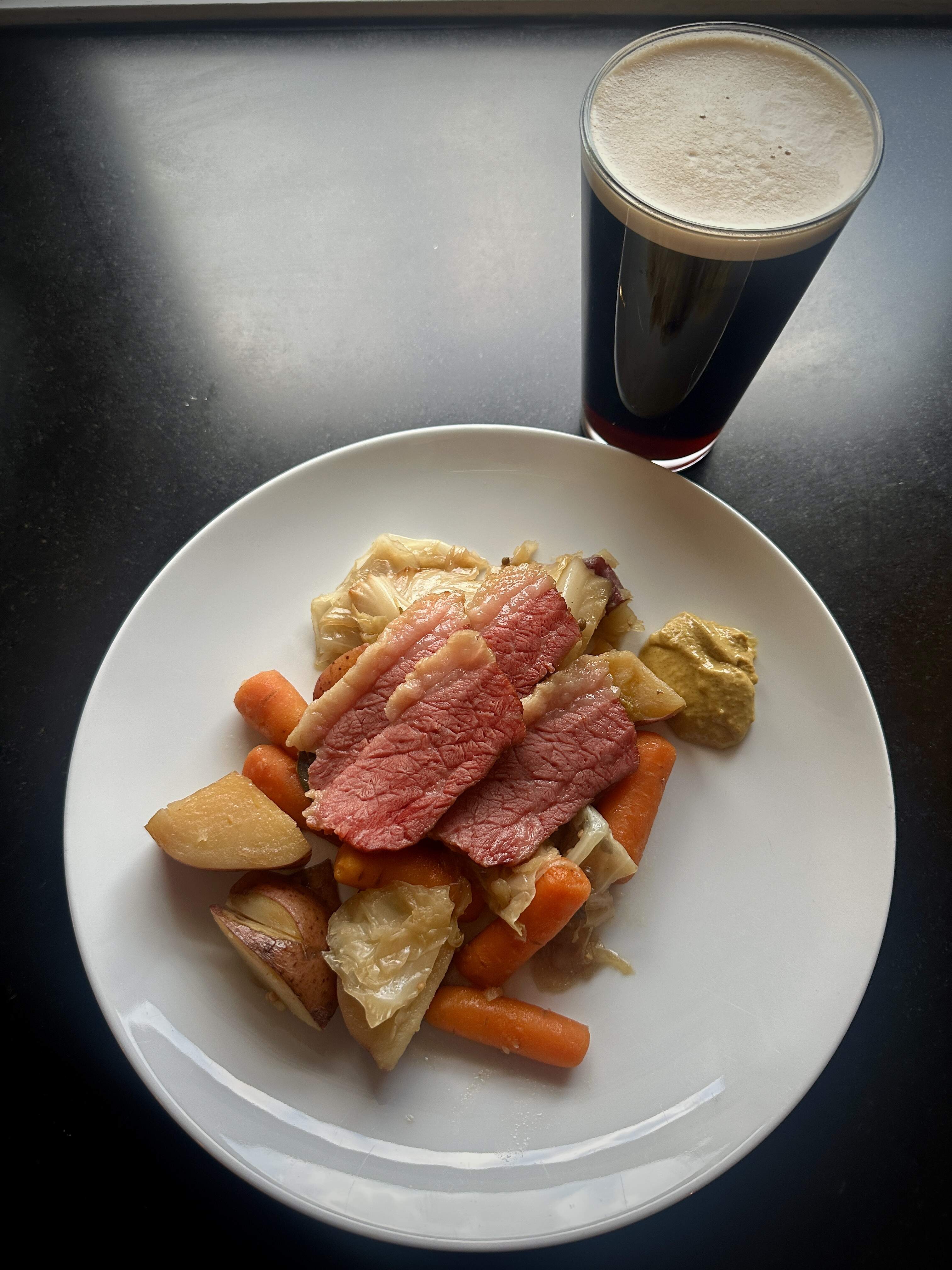 Classic corned beef and cabbage. It took 2 Guinesses to make - one for simering and one for drinking.