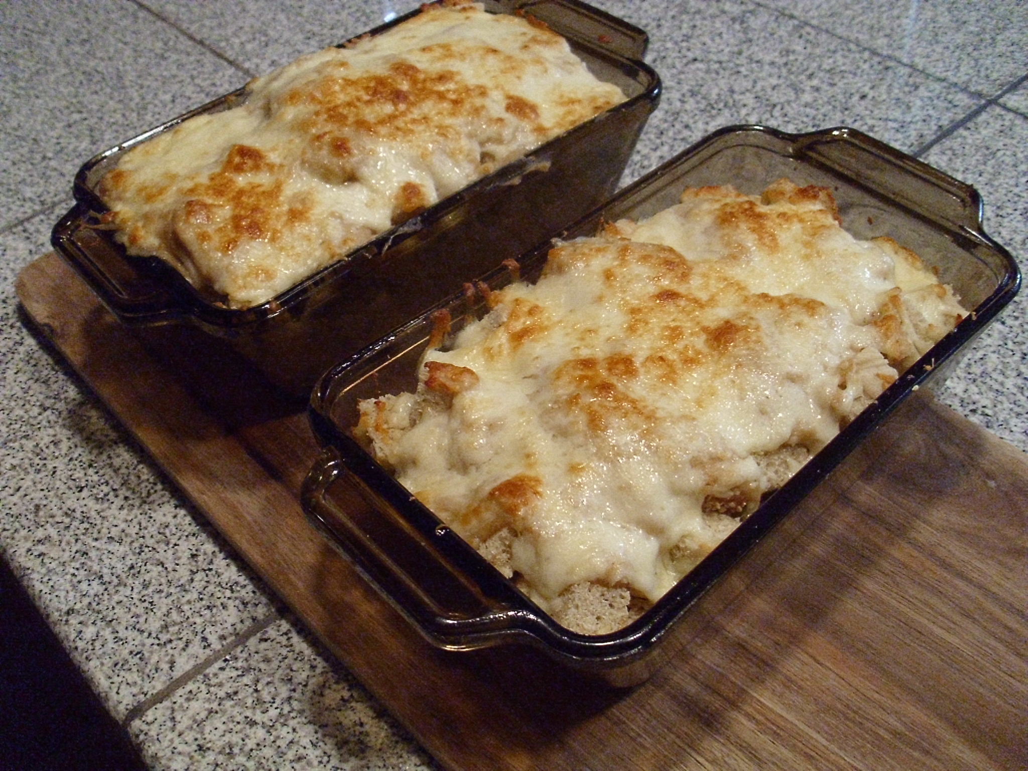 Homemade Bread (cubed), bechamel sauce, shredded chicken and peas topped with cheese. I made two of them, so I could freeze one for a later date.
