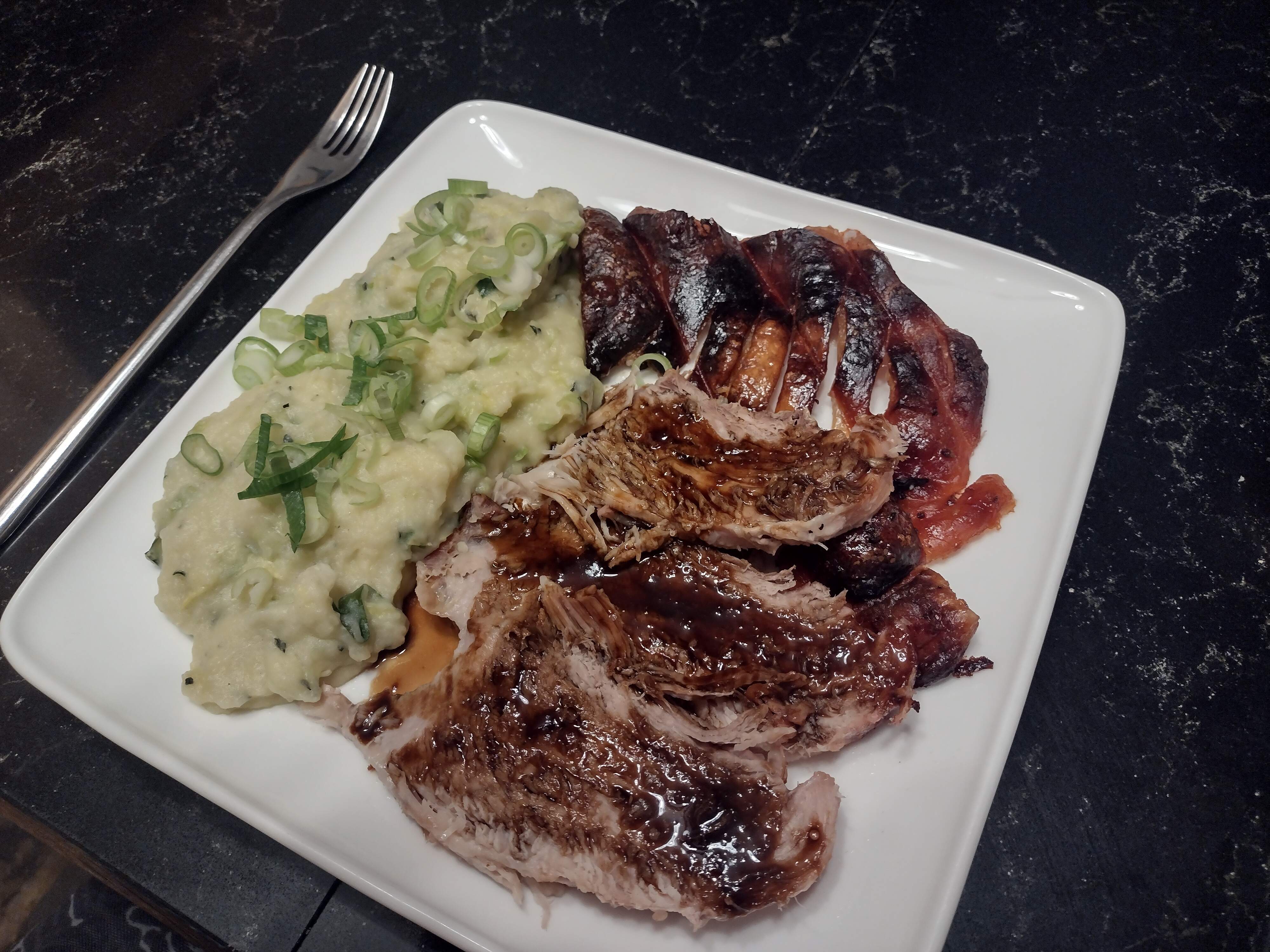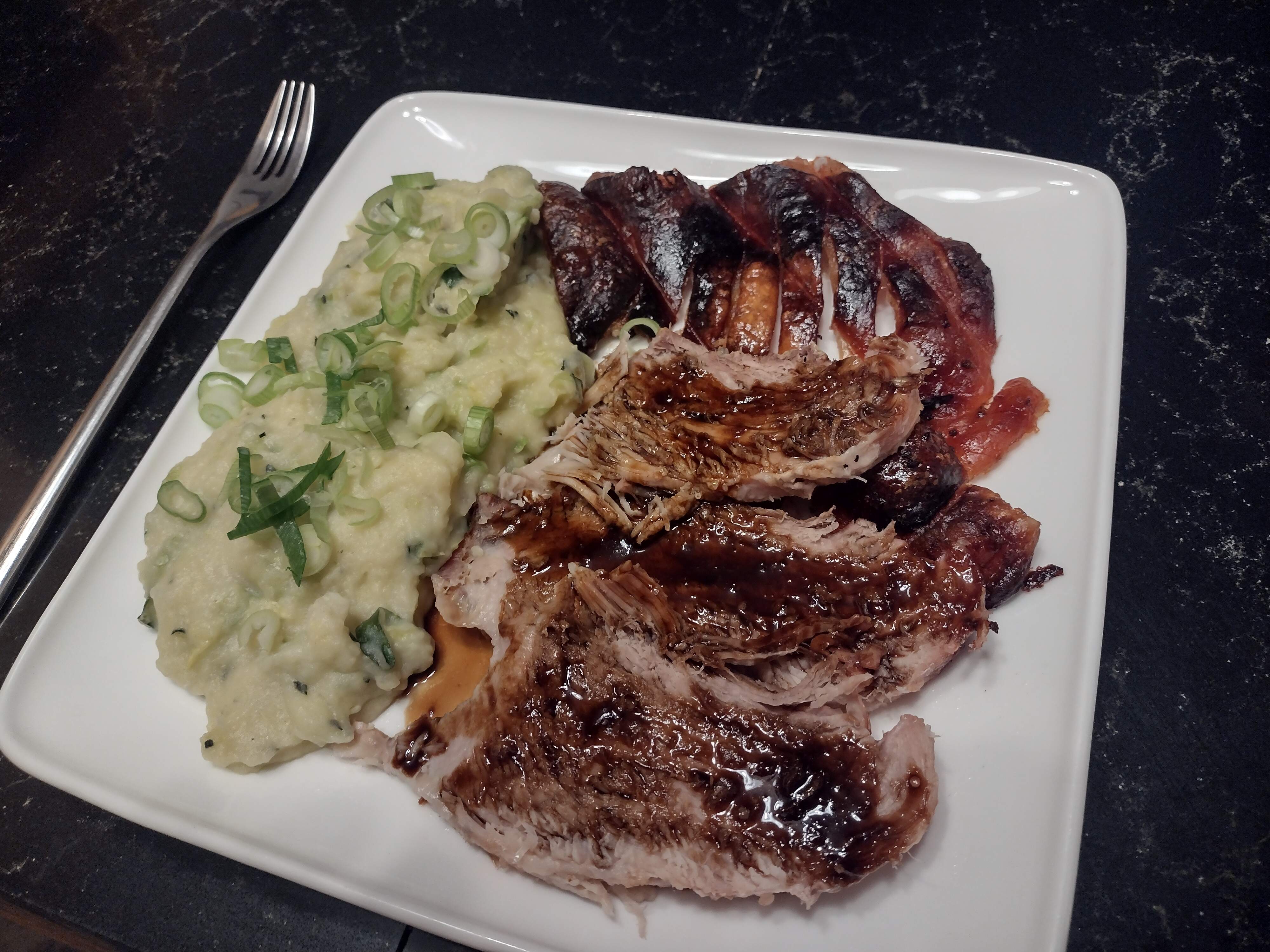 Tarragon and mustard colcannon, roast pork and crackling, Guinness gravy