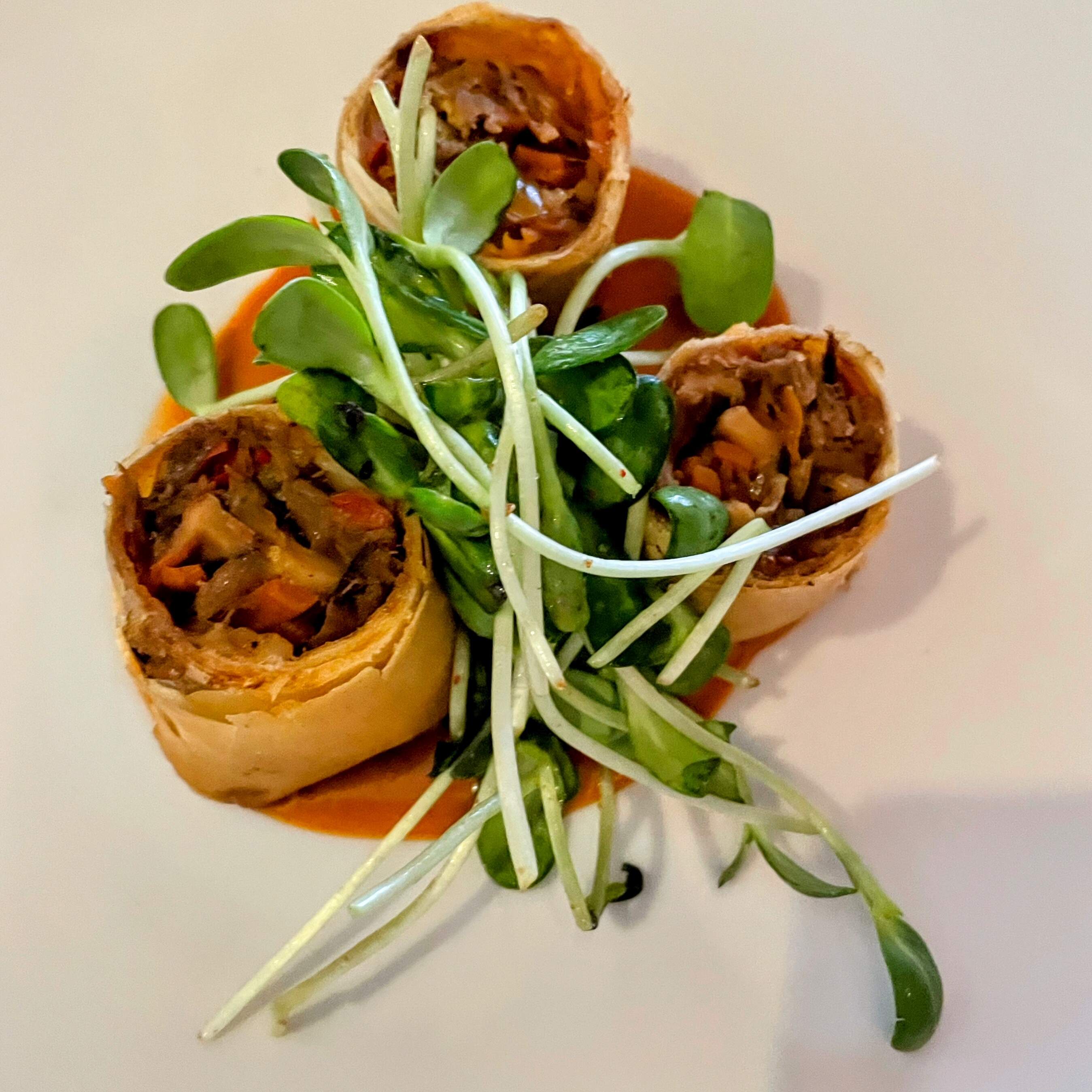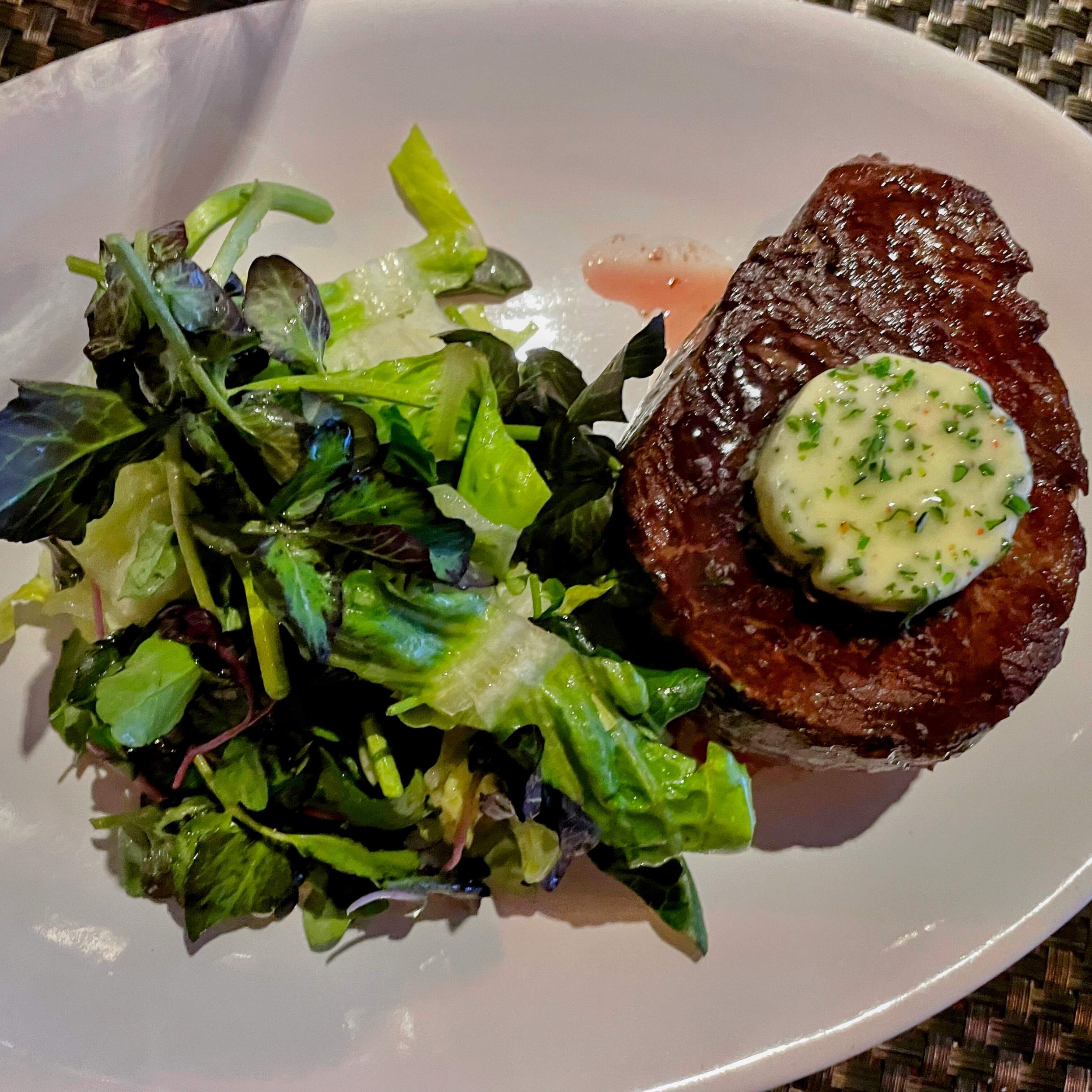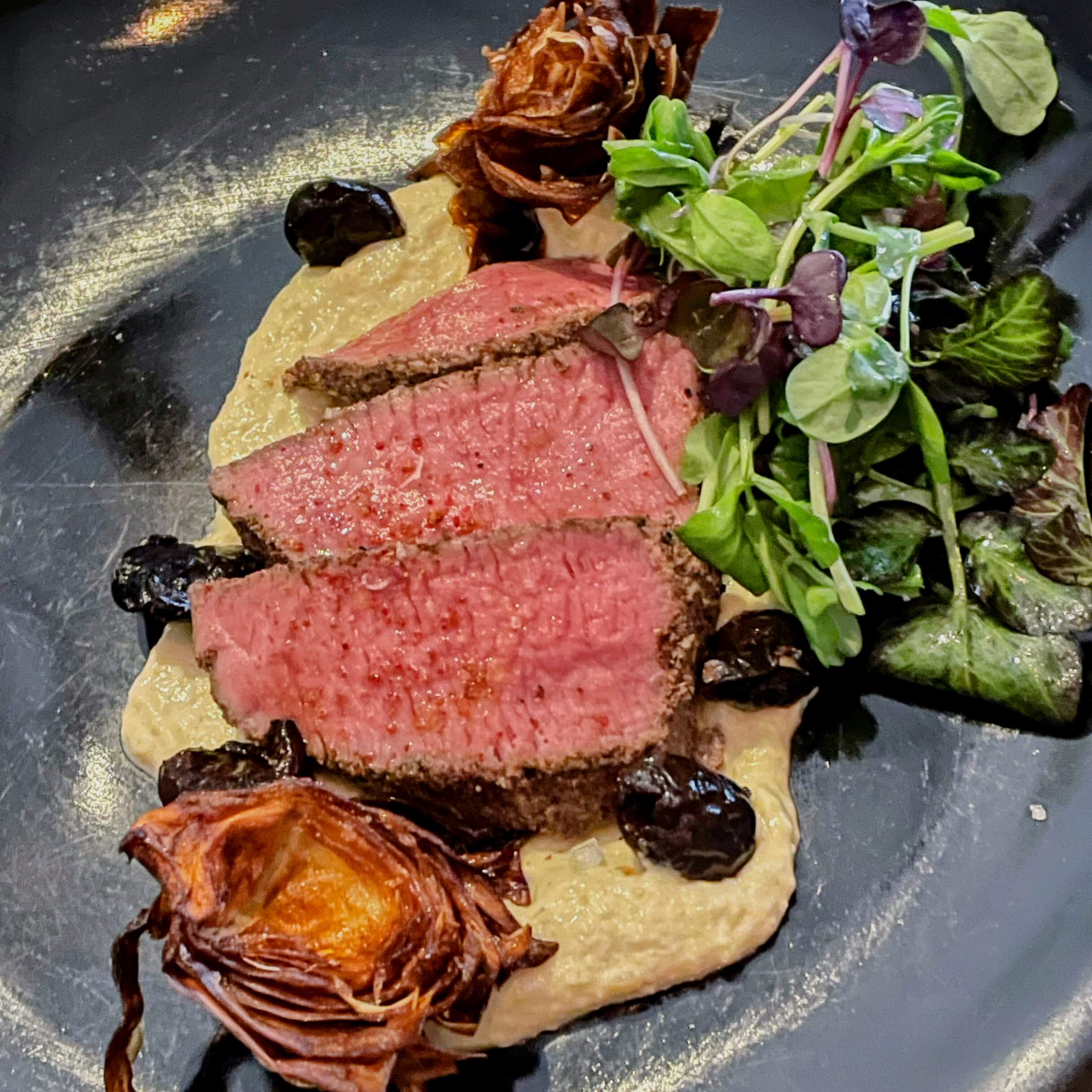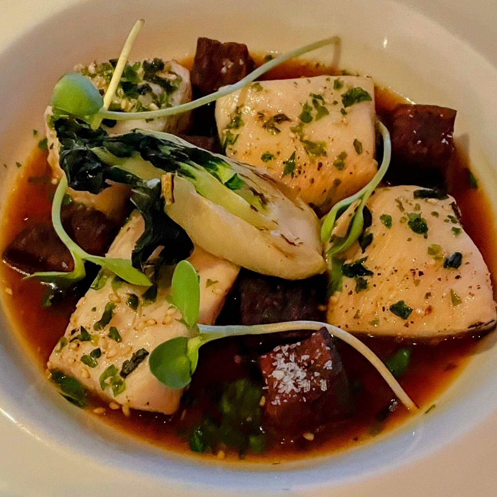We enjoyed wood fired wild shrimp with ginger glazed gulf shrimp, aerated lobster cream, micro shiso; crispy duck spring rolls with peanut sauce; yellow curry and forbidden rice with napa cabbage, japanese eggplant, kabocha squash, micro shiso, spiced pumpkin seeds; seared sumac rubbed domestic lamb loin, soft herb hummus, crispy artichokes & beldi olives; excellent certified Angus filet mignon special; sablefish with lemongrass, ginger & red miso poached, wood fired baby bok choy & purple sweet potato; farro salad; crispy hand-cut fries. We took home an excellent chocolate cake with tahini mousse, pomegranate syrup, sesame tuile. It all went great with an excellent Malbec and red blend. The personalized menu at the end gives more details.