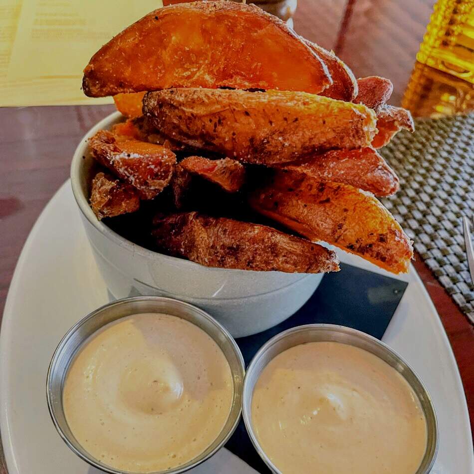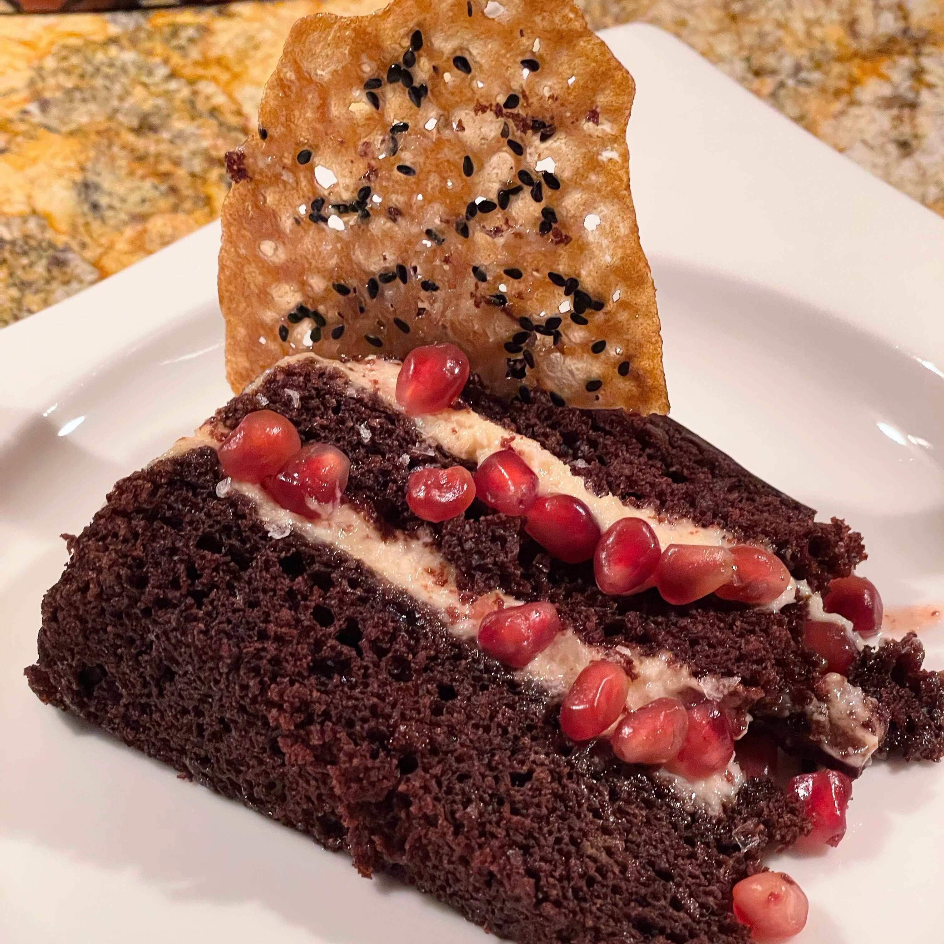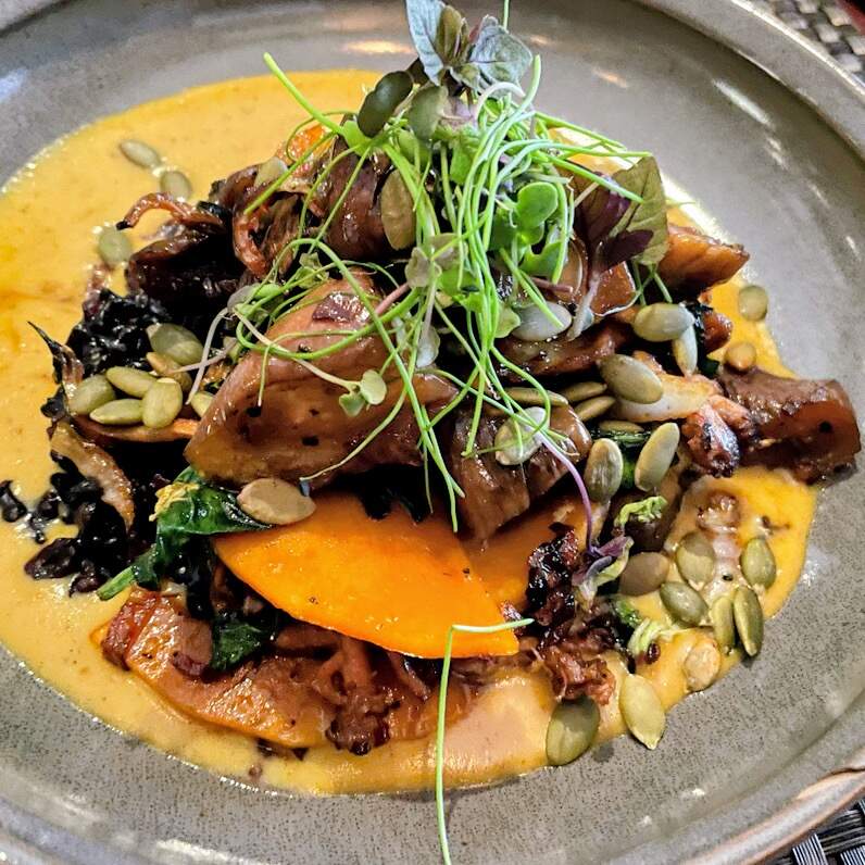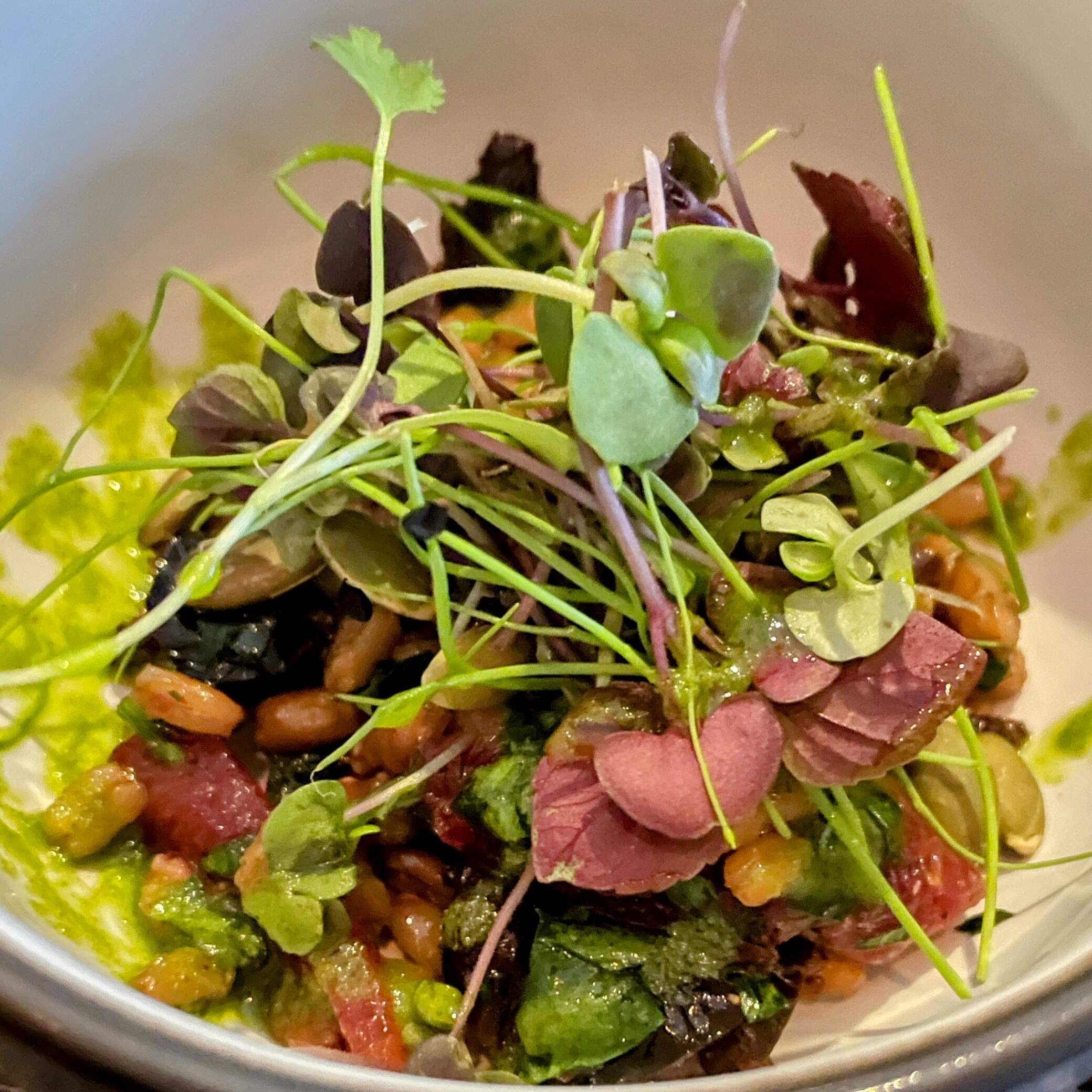 We enjoyed wood fired wild shrimp with ginger glazed gulf shrimp, aerated lobster cream, micro shiso; crispy duck spring rolls with peanut sauce; yellow curry and forbidden rice with napa cabbage, japanese eggplant, kabocha squash, micro shiso, spiced pumpkin seeds; seared sumac rubbed domestic lamb loin, soft herb hummus, crispy artichokes & beldi olives; excellent certified Angus filet mignon special; sablefish with lemongrass, ginger & red miso poached, wood fired baby bok choy & purple sweet potato; farro salad; crispy hand-cut fries. We took home an excellent chocolate cake with tahini mousse, pomegranate syrup, sesame tuile. It all went great with an excellent Malbec and red blend. The personalized menu at the end gives more details.