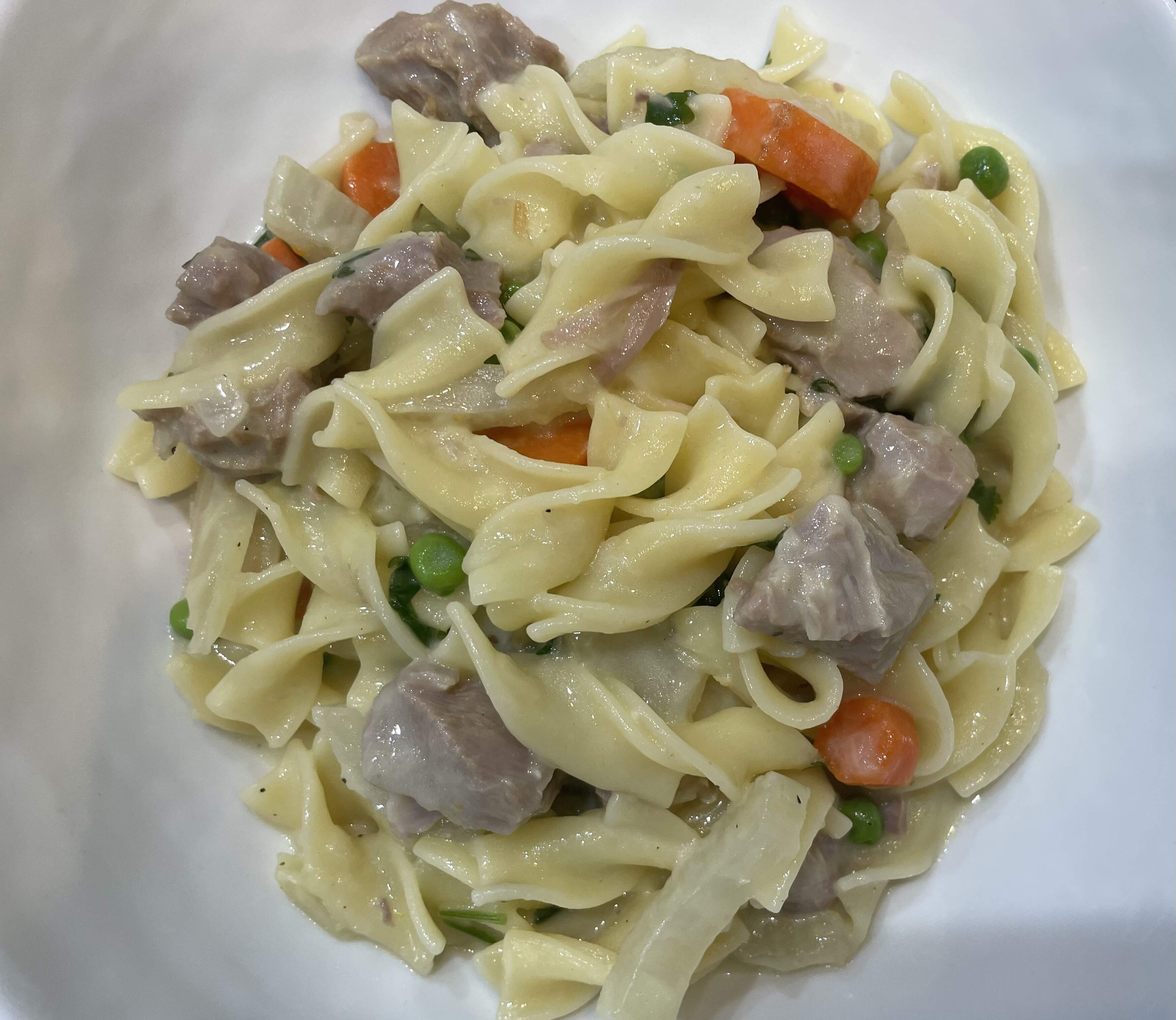 Veal Stew with Fennel, Tarragon, and Cream (Blanquette de Veau) from an ATK recipe - normally the goal in many stews is to create flavors through browning the meat. With blanquette you aim to let the “natural” flavors of the ingredients shine through by more gently stewing everything. Veal gets first blanched to remove all impurities and gets afterwards braised with shallots, garlic, flour, bay leaves in white wine and chicken broth. After an hour, you add carrots and fennel before finishing it with peas, tarragon, parsley, cream and lemon juice. Served over egg noodles
