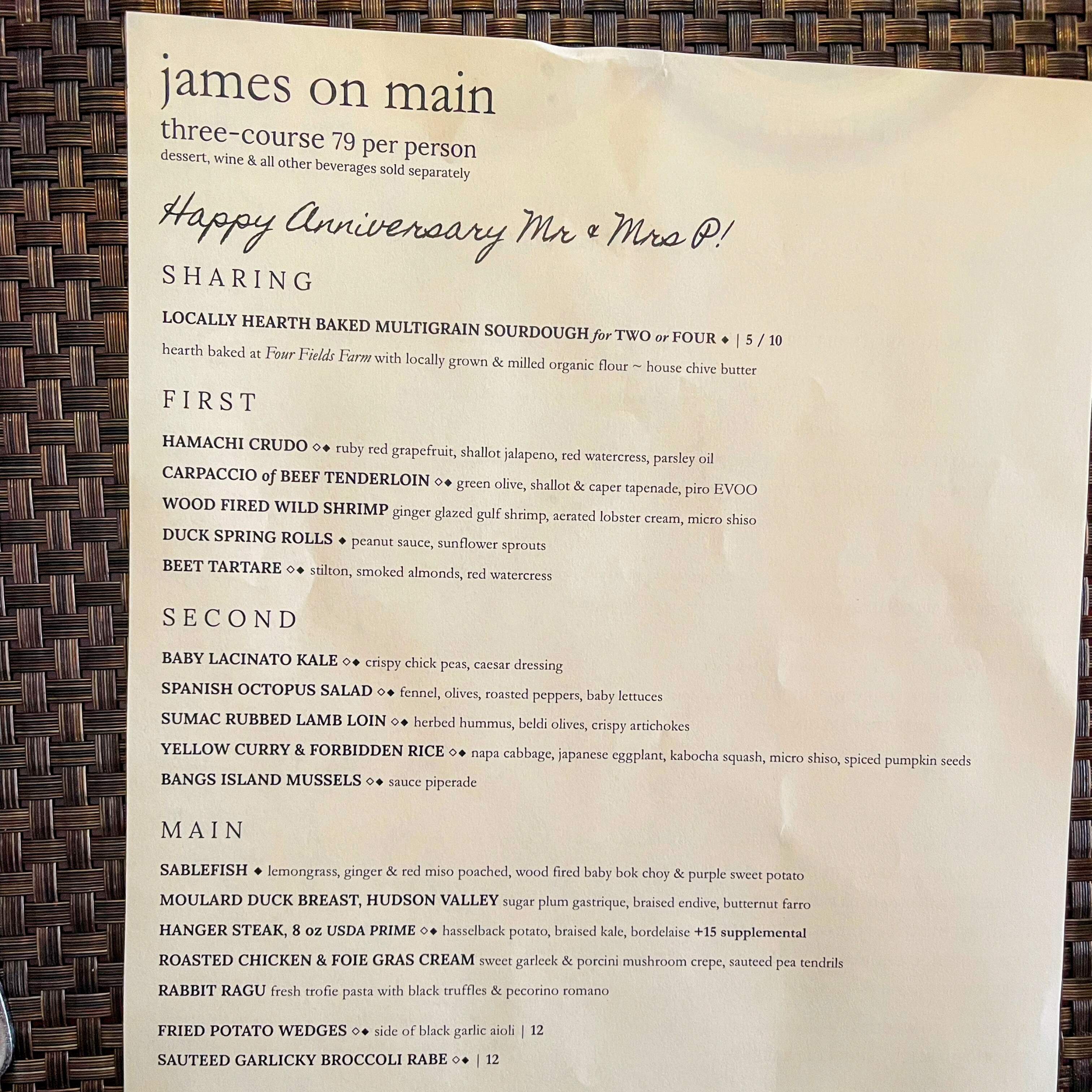 We enjoyed an outstanding pre anniversary dinner at James on Main, in Hackettstown, NJ. Our actual 15th! anniversary will be on the 27th.
