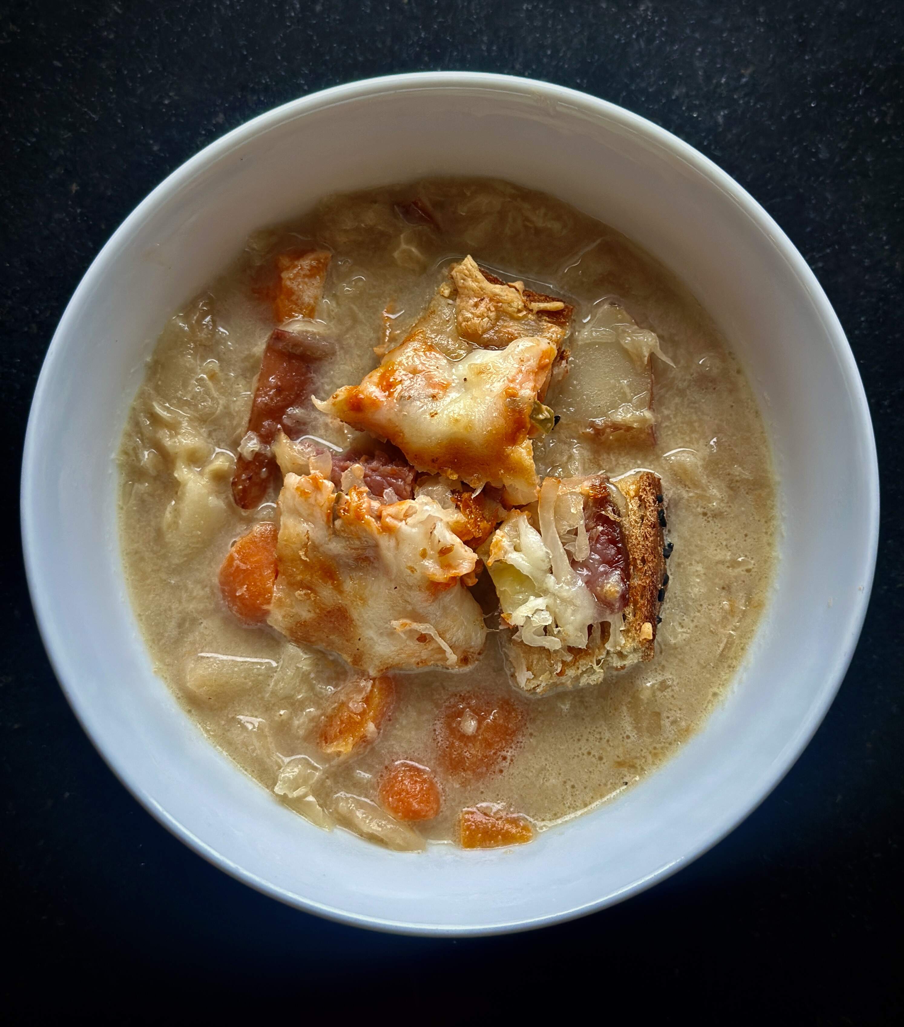I had some leftover corned beef and cabbage so decided to turn it into soup. Chopped cabbage, potatoes and carrots were added to a vegetable broth I had in the freezer. I added sauerkraut, horseradish, dijon mustard, some Caribbean salt mix and a splash of heavy cream. Topped with Reuben croutons.