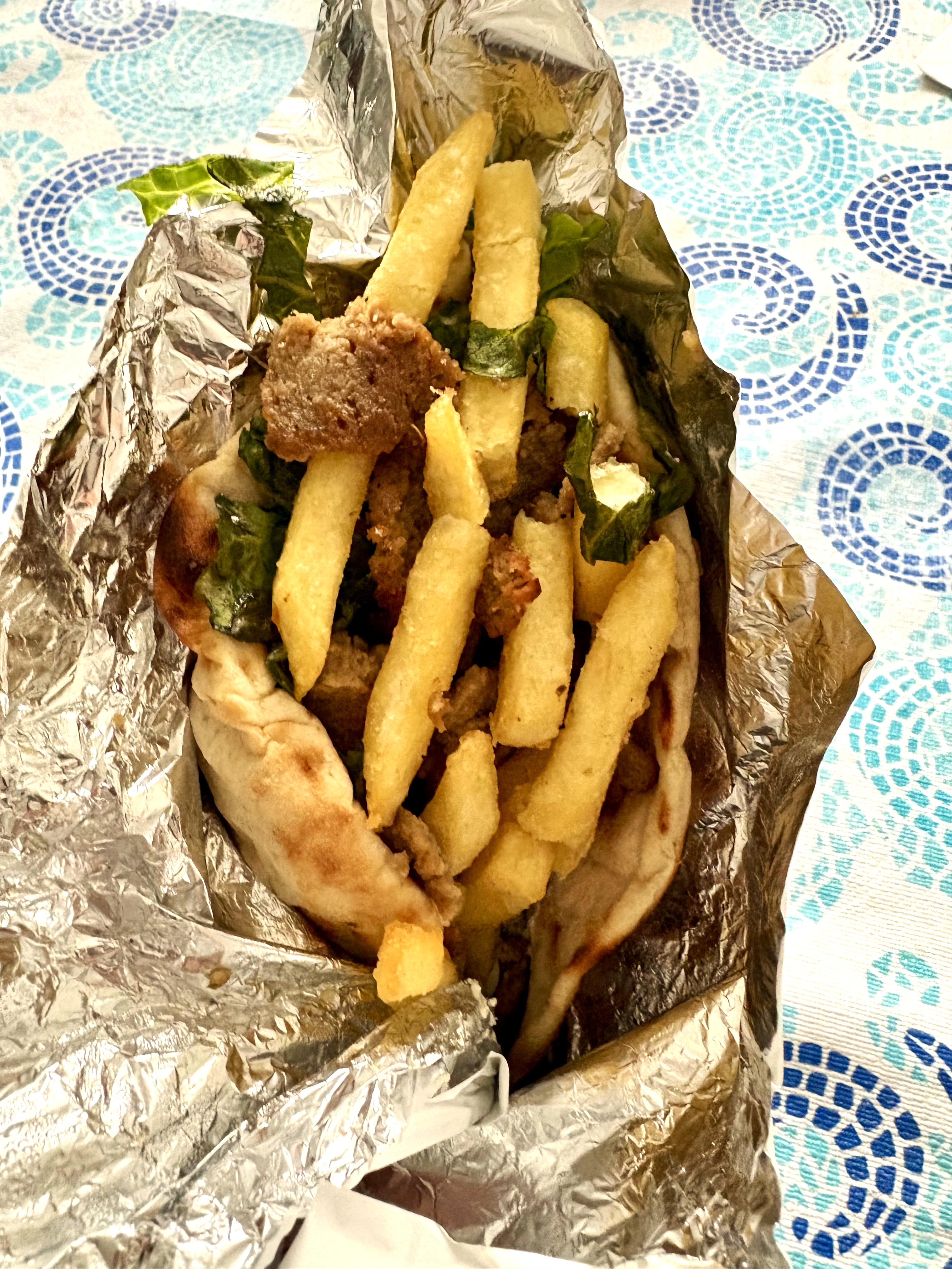 Grabbed a lamb/beef gyros stuffed with fries, and some roasted lemon potatoes for tomorrow.
