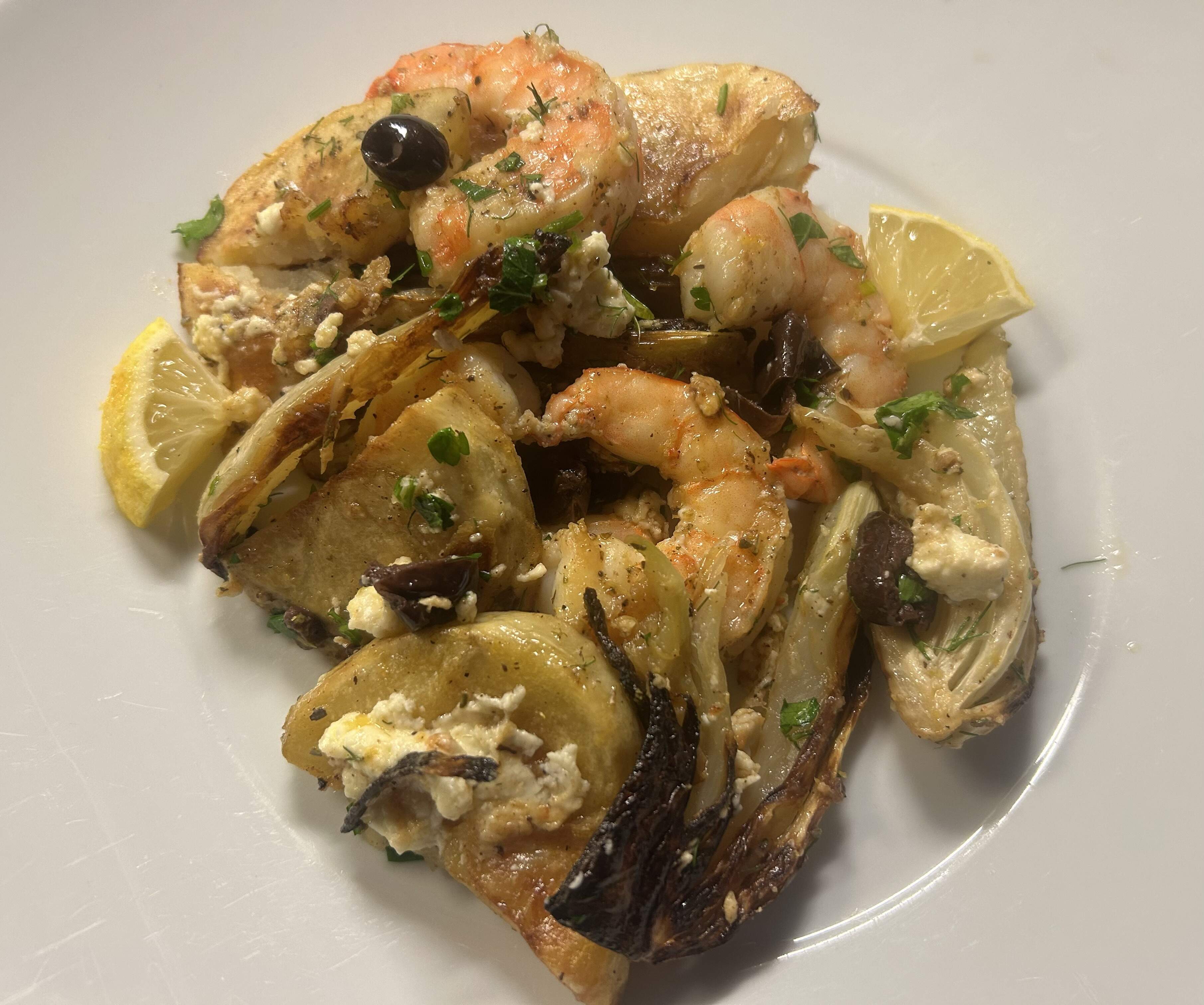 Roast fennel wedges and 1/2 inch slices of potatoes (oo,s&p) 25 mins, shrimp tossed with lemon zest, oregano, oo, s&p, then added to veg with feta cheese crumbles for 5-6 mins. Add parsley, Kalamata olives. OO and lemon to taste.