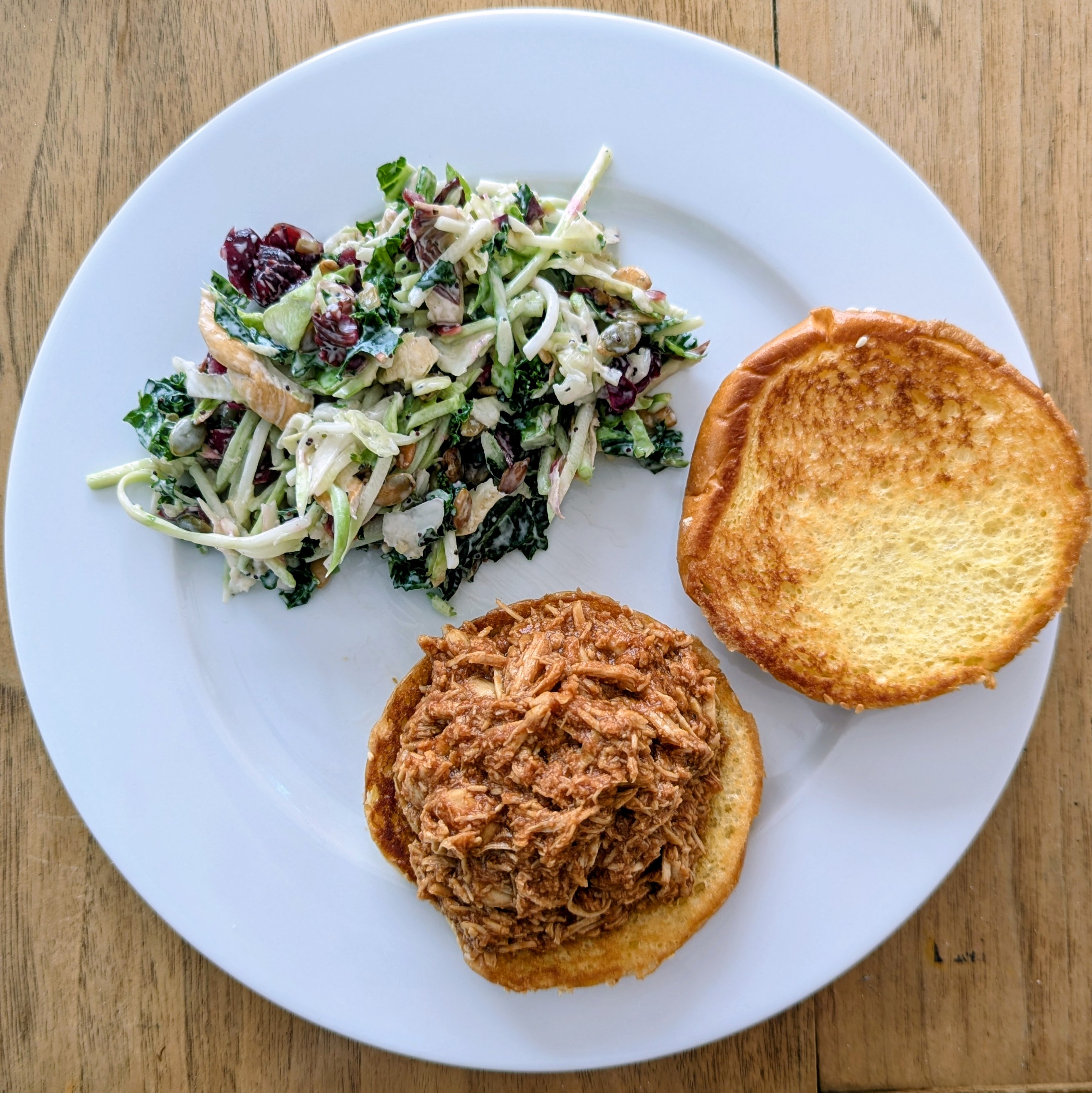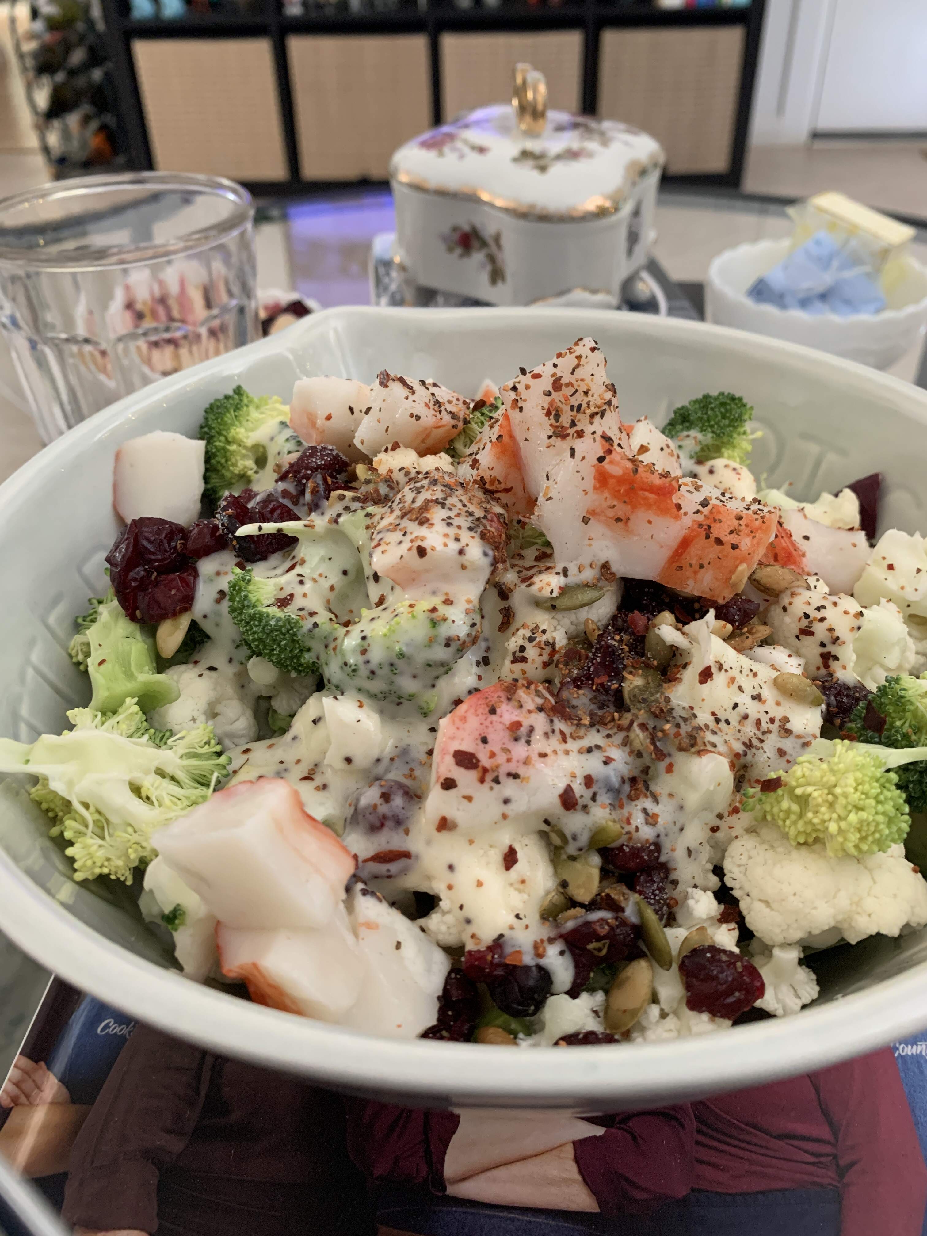 Dinner salad. Seasoned, seared and roasted chopped chicken thigh over a bed of artesian romaine, spring onion, celery, snap peas, radishes, avocado, TJ’s fried shallots, hbe, ranch/blue cheese/bacon dressing and TJ’s ciabatta roll toasted with garlic, parsley butter.