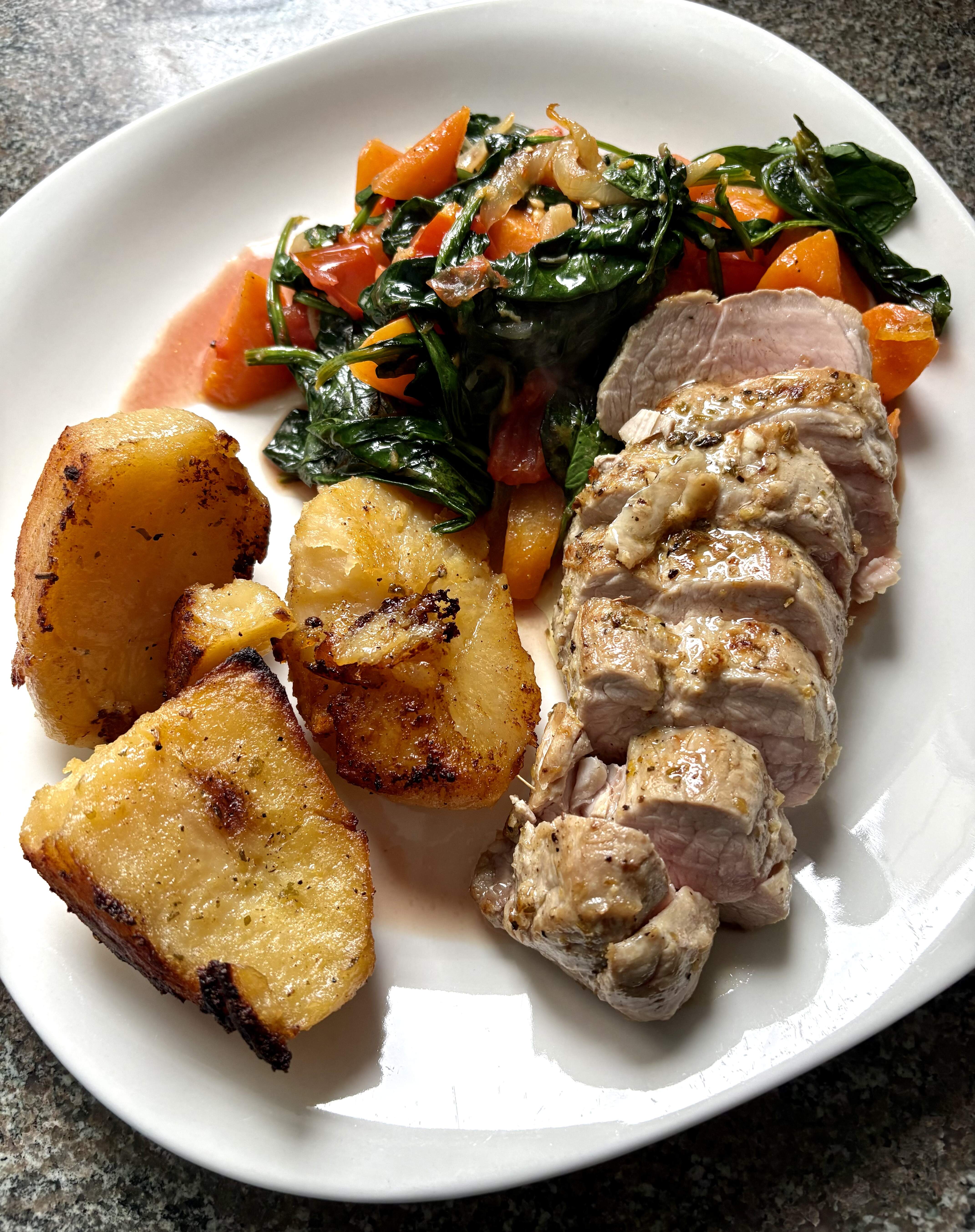 Roasted Greek style pork tenderloin, leftover lemon potatoes that I crisped up with the pork and much needed, sauteed spinach/carrots/onion and chopped tomatoes. Tons of garlic and lemon on everything.