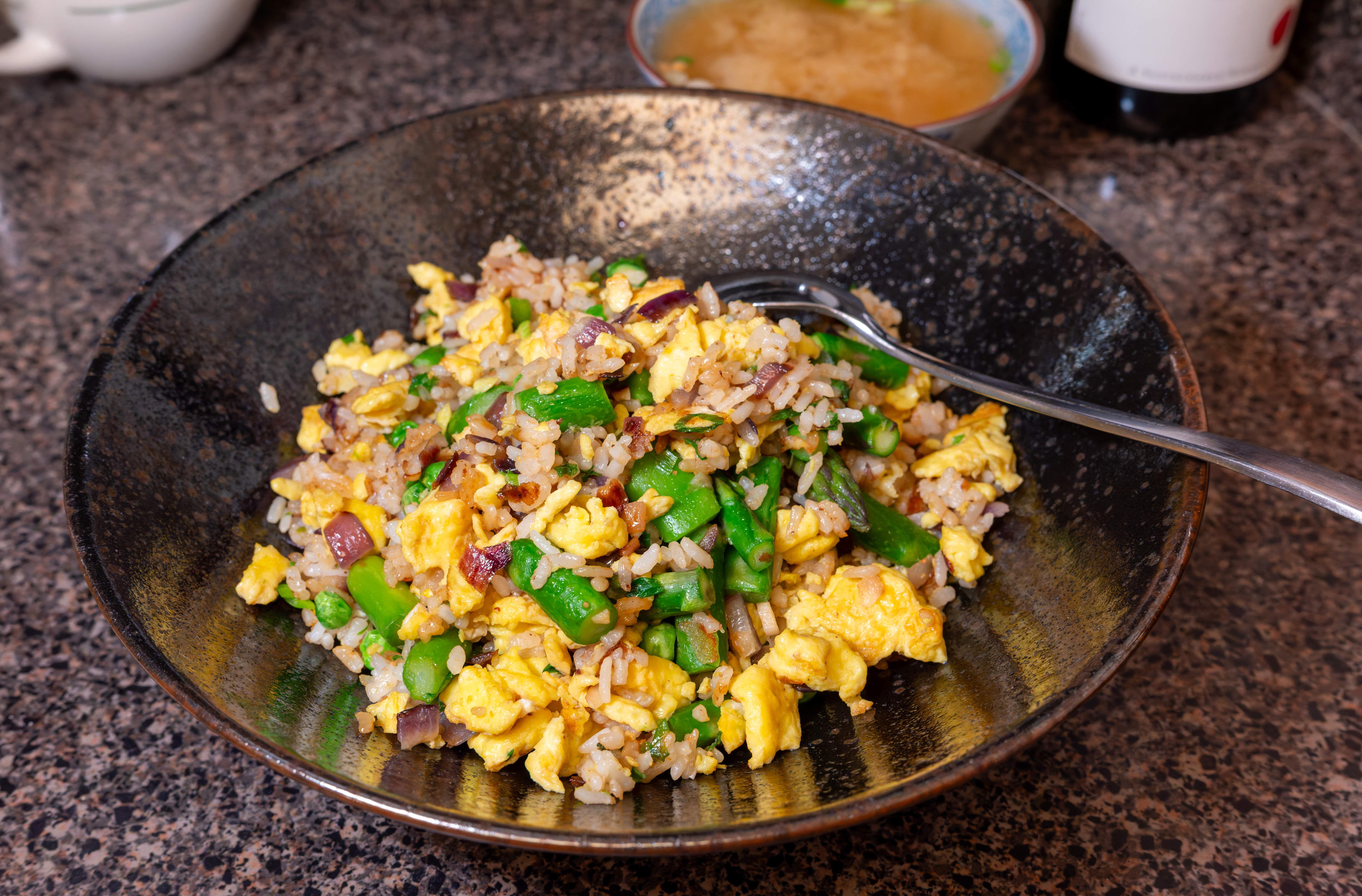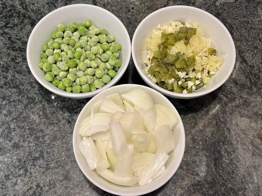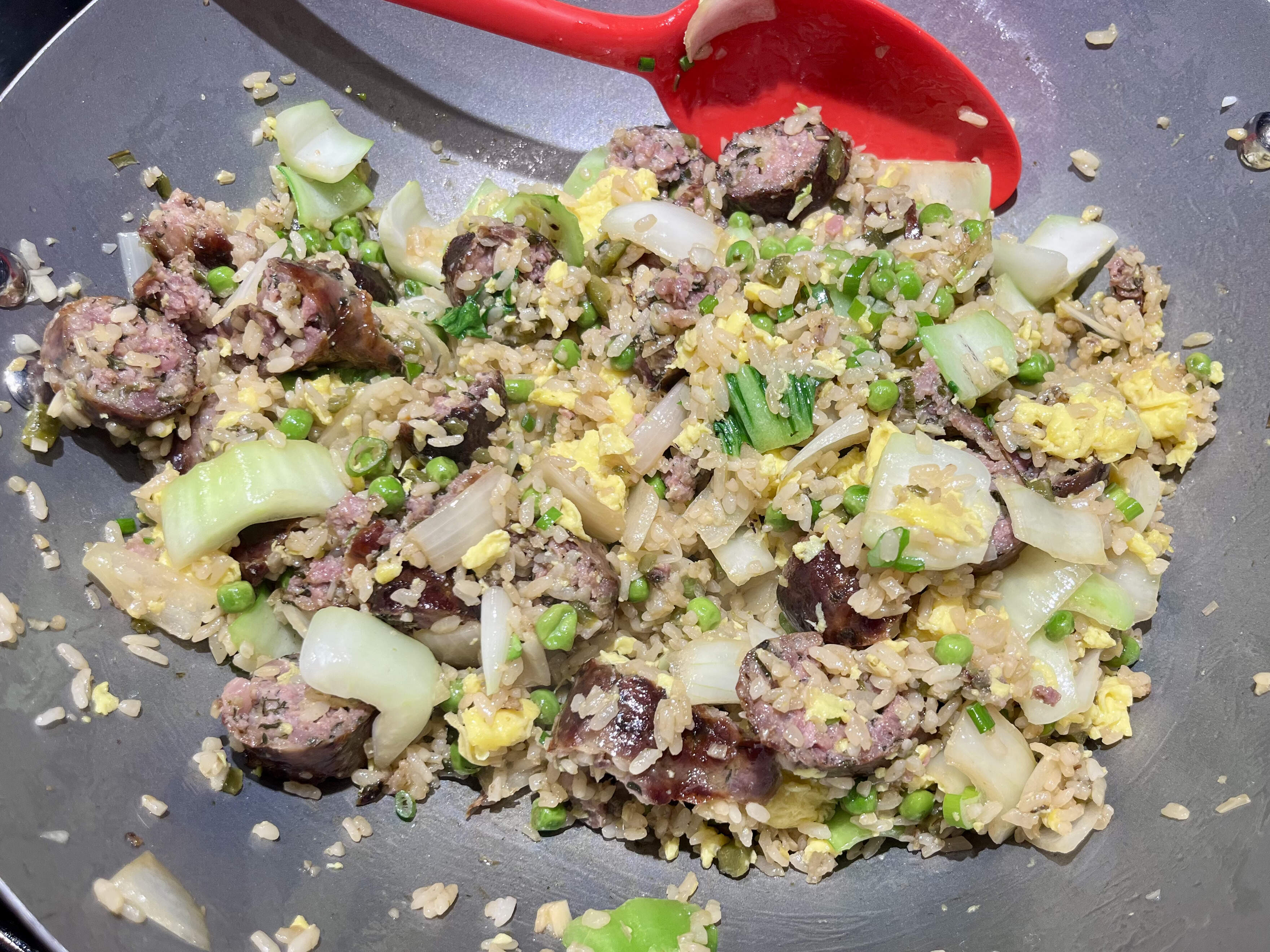 I made egg-fried rice to make a dent in the massive amounts of leftover rice in our fridge — one Sichuan, one Indian meal — with the last 3 of the Lao sausages from Philly, baby bok choy, peas, onion and, of course, TPSTOGAG, plus the 2.5 jalapeños I roasted yesterday to heat our chilly bones.