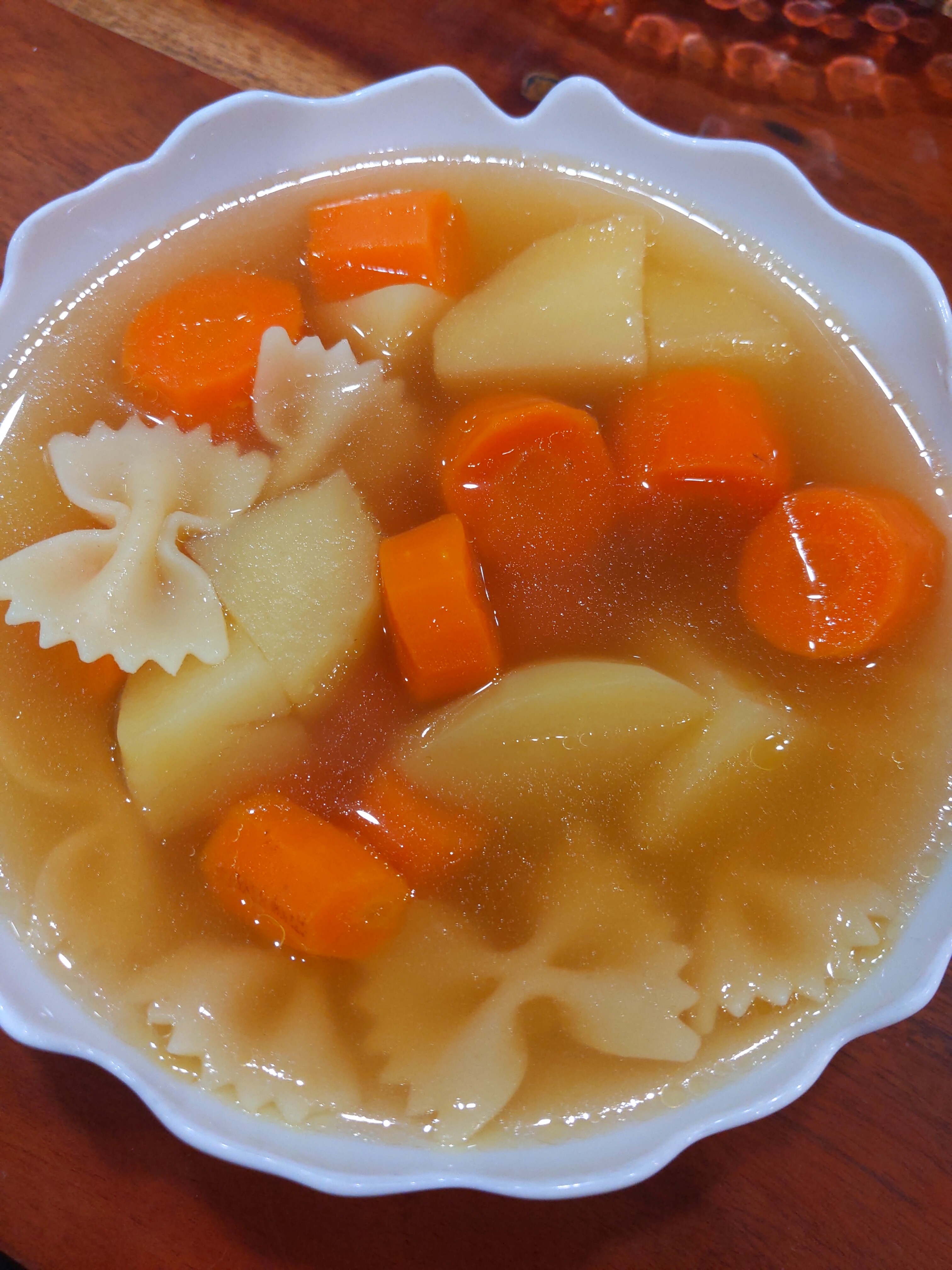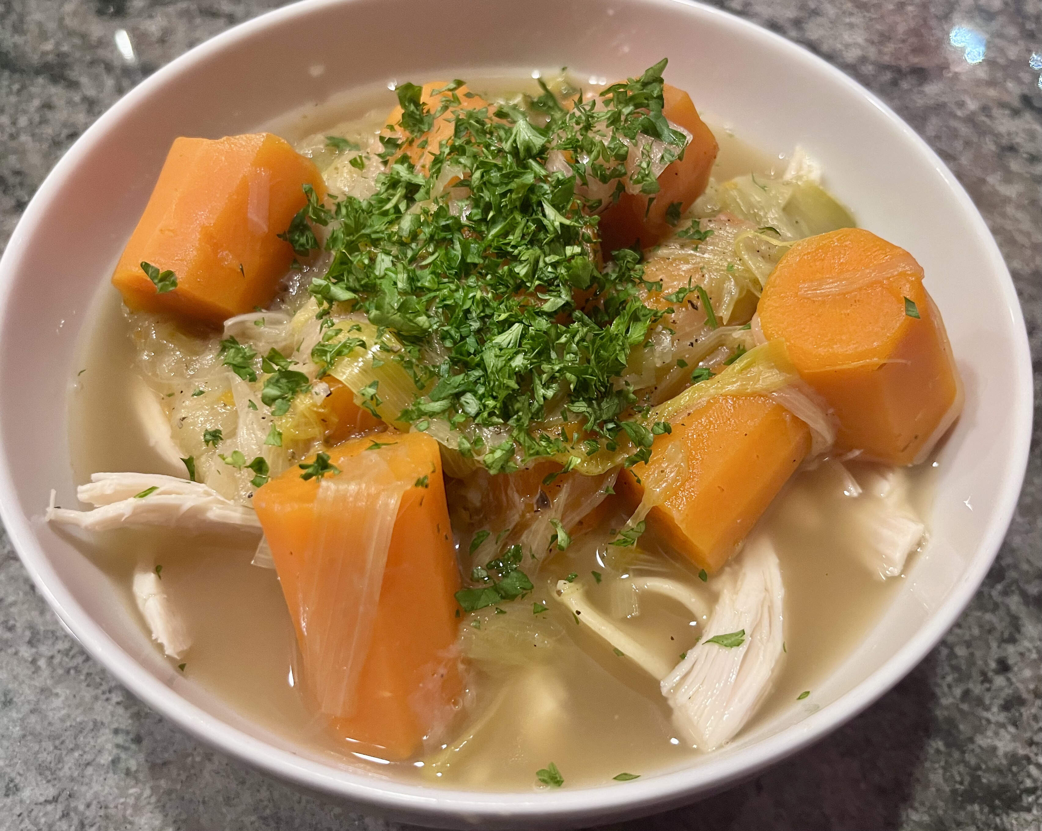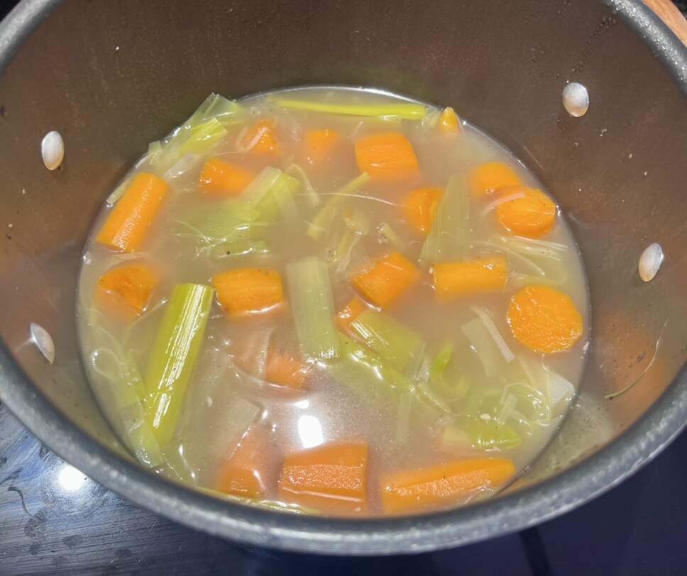 Similar vibe here! Some of us are under the weather so this was a very very simple soup - some chicken bone stock simmered with carrots, creamy potatoes and tough leek greens I had stashed in my freezer which I fished out before serving (not sure I would have remembered the leeks if not for your guess what’s cooking post, and they added a lot of flavor), I added leftover pasta from the fridge to round it out. Much needed soup!
