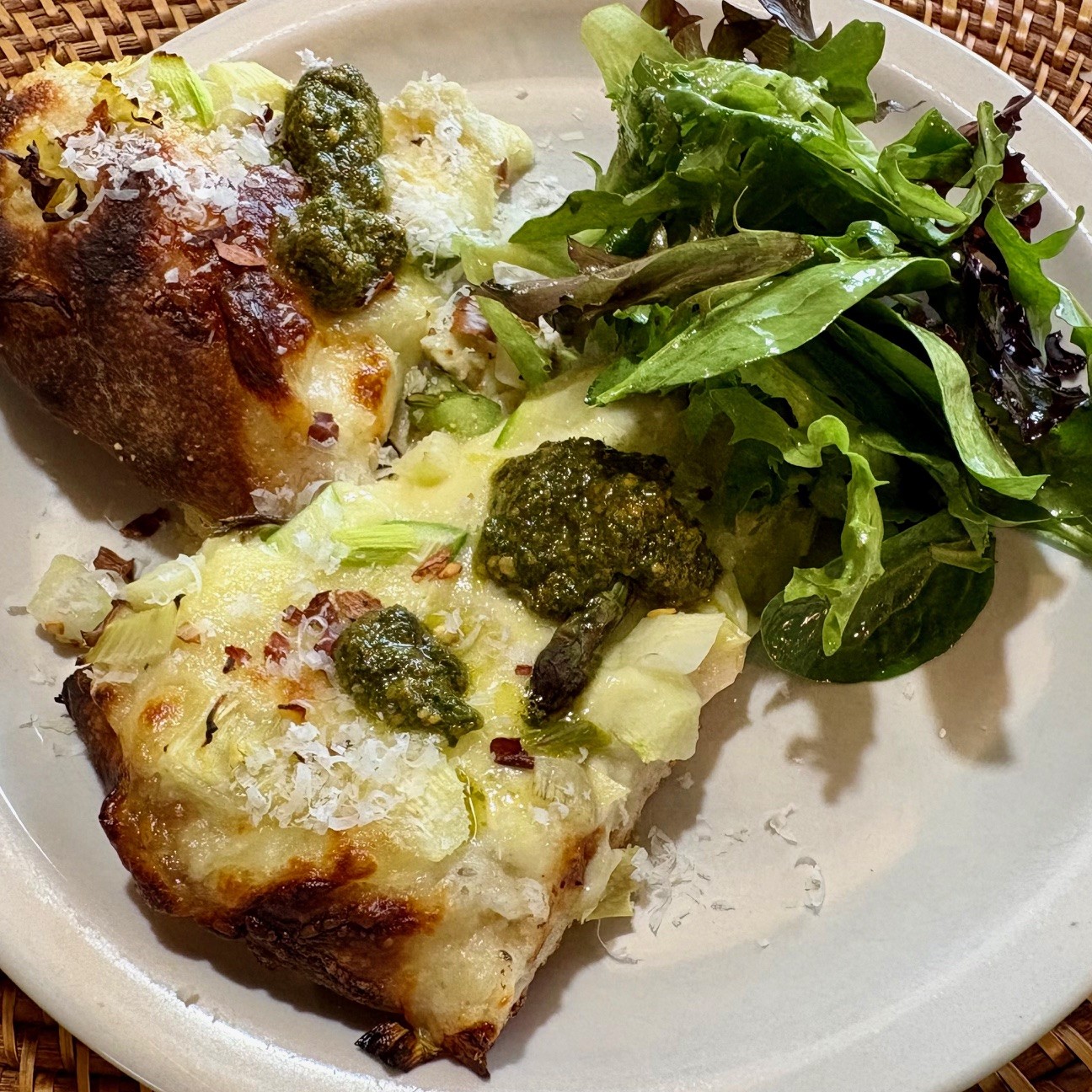 White pizza with garden asparagus and canned artichokes. A garlicky parmesan bechamel for sauce, and both fresh and whole milk mozzarellas. Homemade basil pesto drizzle.