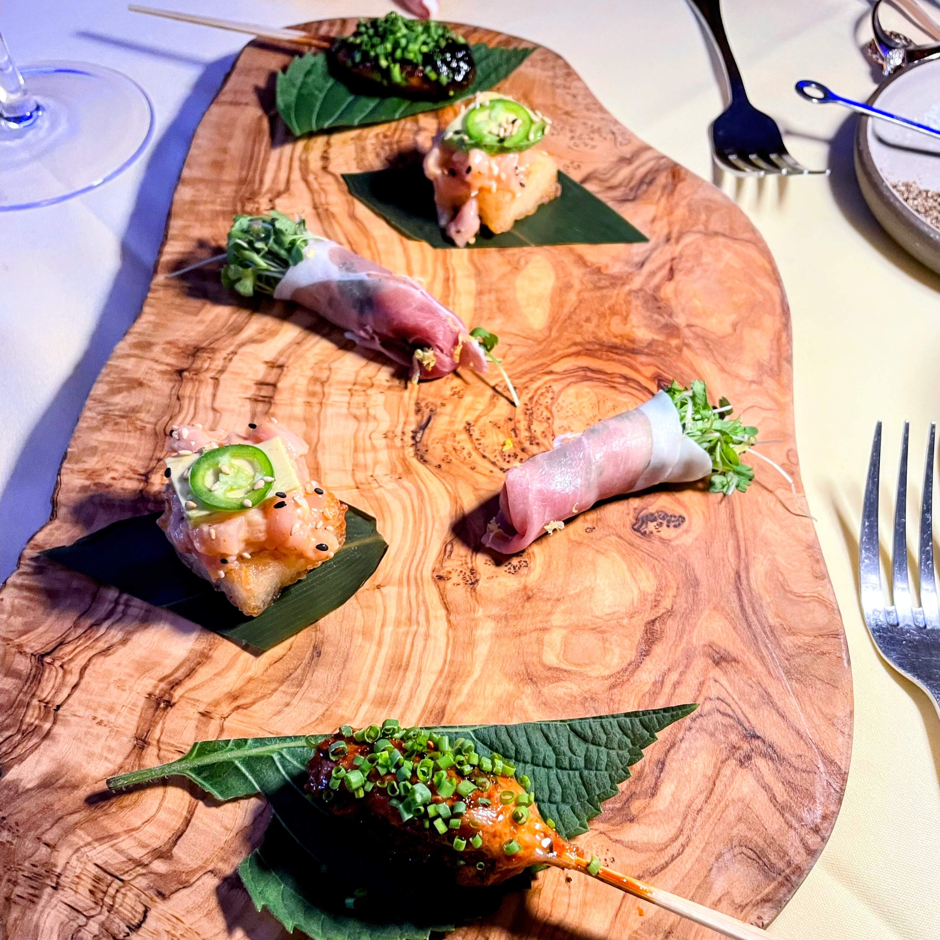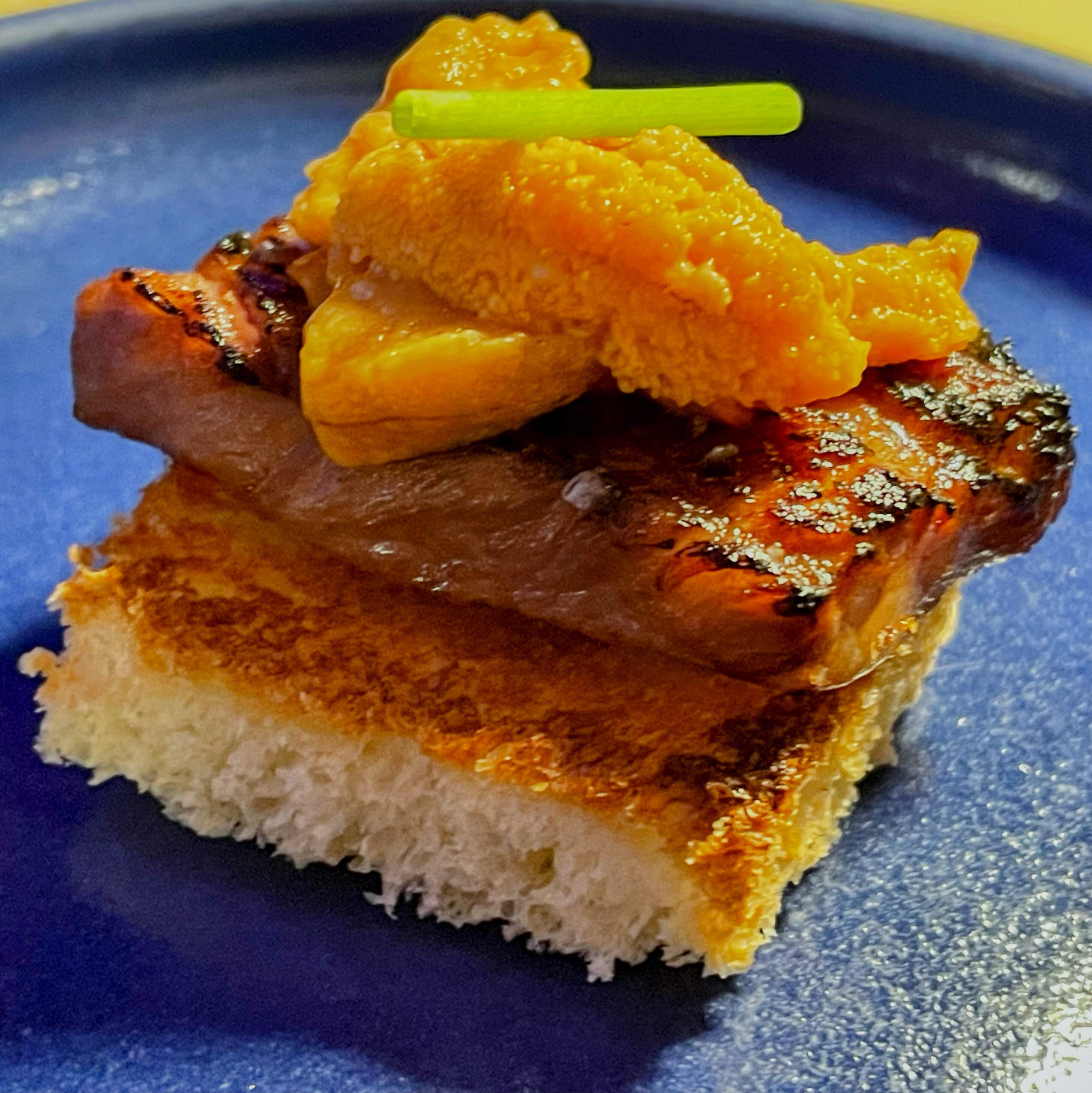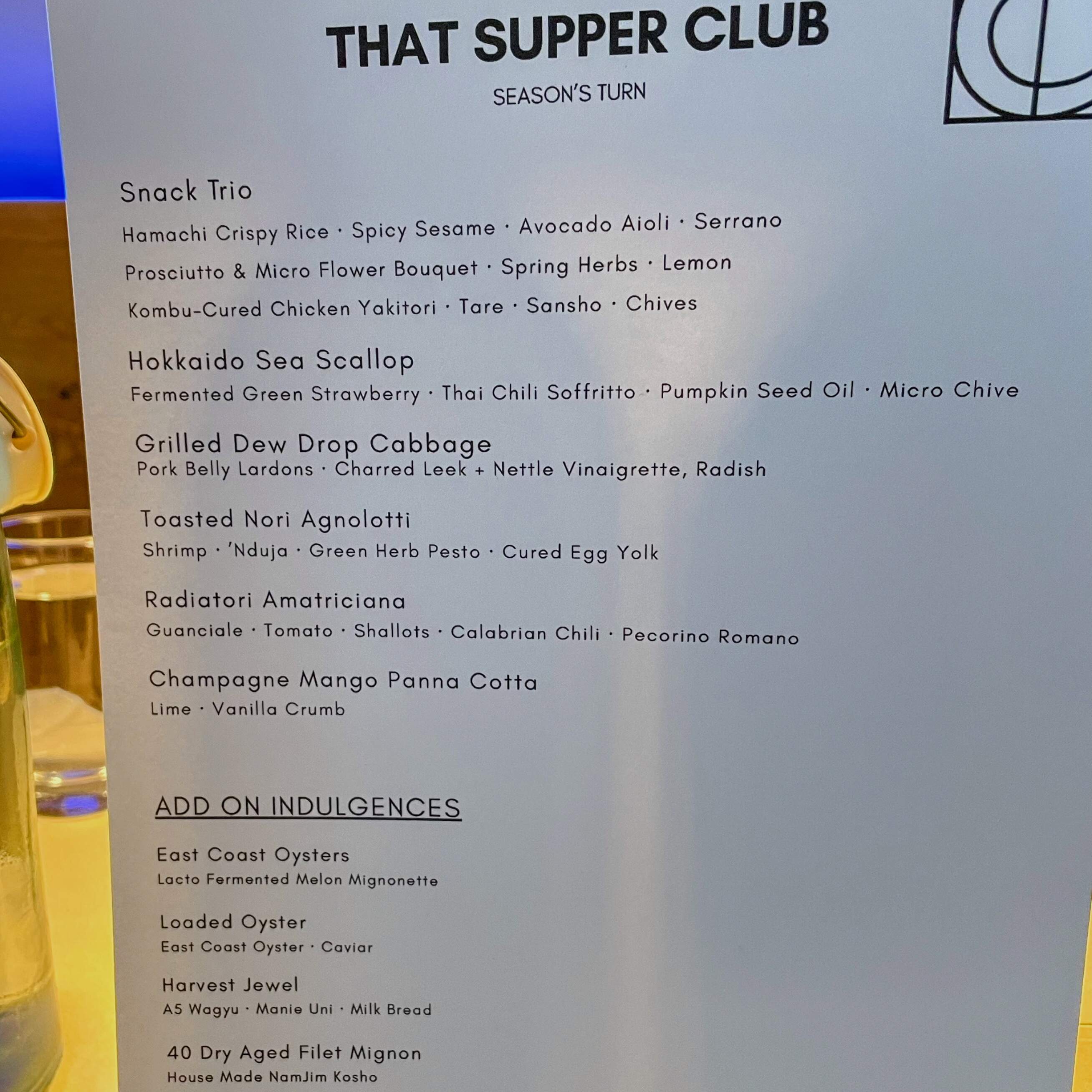 We enjoyed an outstanding anniversary dinner at That Supper Club pop up restaurant in Park Ridge, NJ including grilled dew drop cabbage with chicharrones; radiatori Amatraciana; Hokkaido scallops; A5 wagyu and main uni on toasted milk bread; oysters; prosciutto wrapped around fresh herbs; kombu cured chicken yakitori; hamachi crispy rice; toasted nori agnolotti stuffed with shrimp; 40 day dry aged filet mignon; champagne mango panna cotta for dessert. It all went great with an excellent cabernet and Malbec. The menu at the end gives more details.