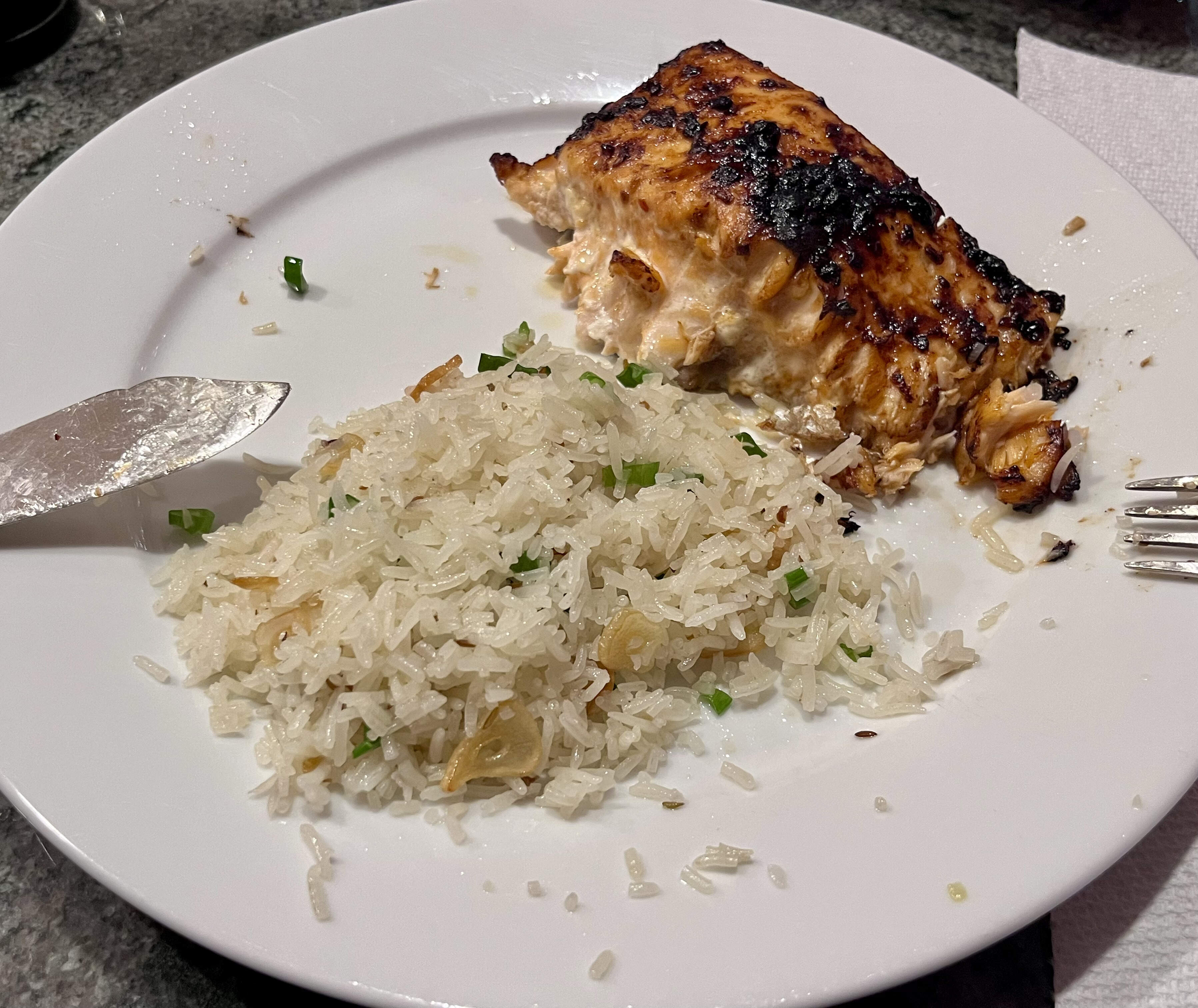 Popped it in the AF for less than 10 min at 400˚F until med-well. Strangely enough, the slathering seemed to entirely disappear during the AF process. All we could taste was the salmon, and since my PIC’s not the biggest fan I’d hoped this combo would make it more palatable for him. I’d only ever made this sauce for dippin’ roti chicken in it. Oh, well.