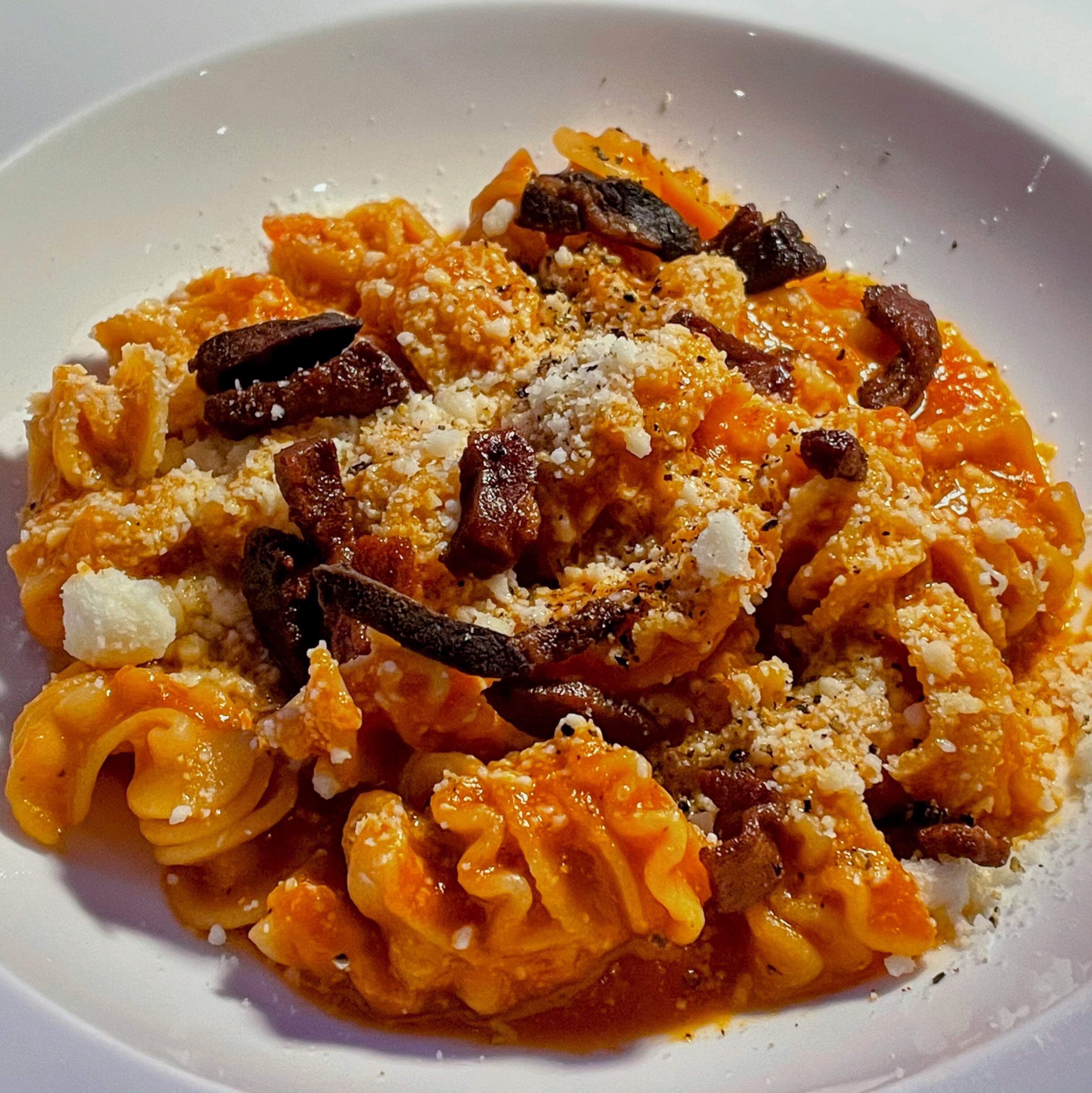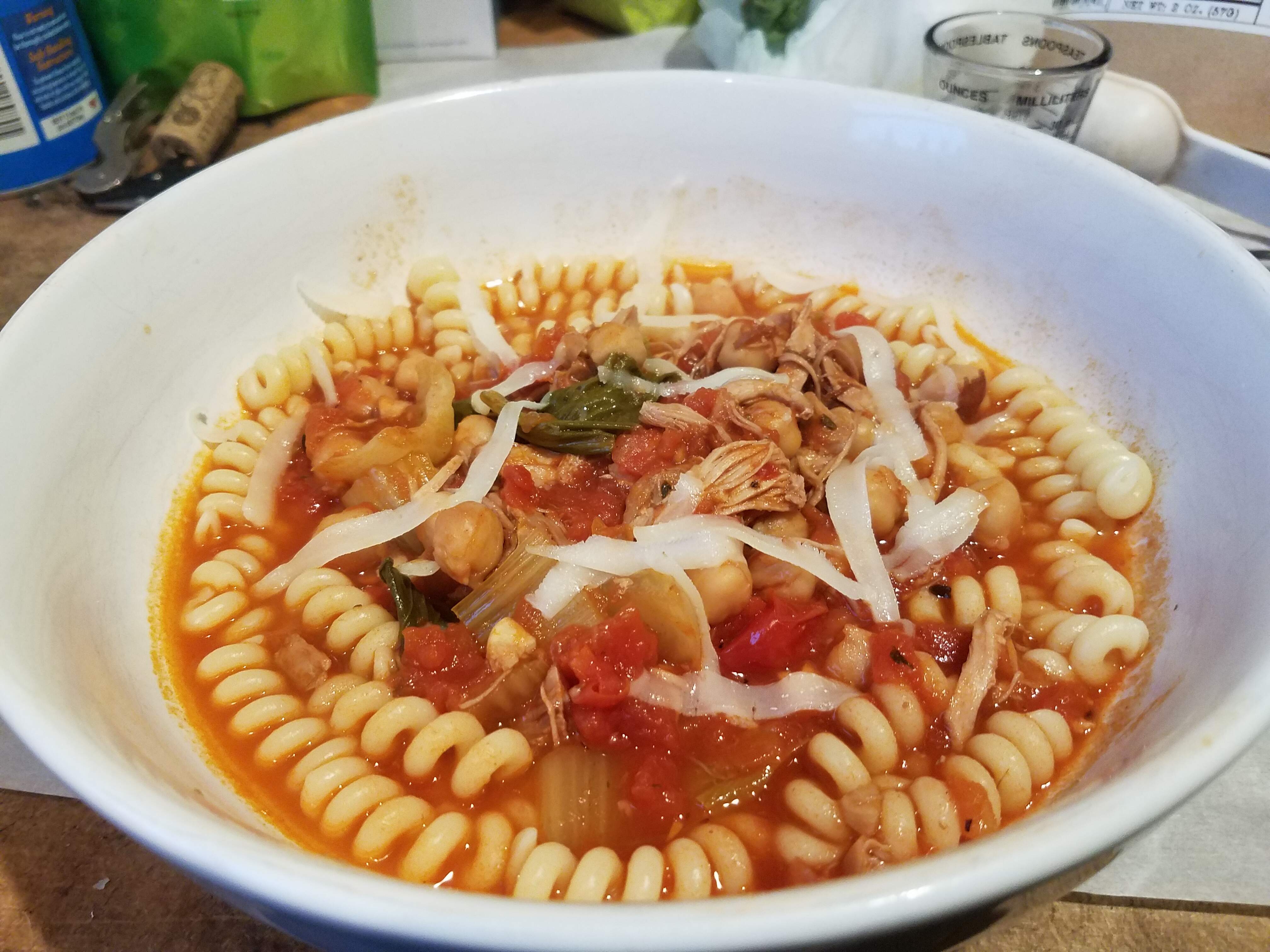 Pasta e fagioli–shredded chicken, garbanzos, bok choy in a light tomato sauce with fusili corti bucati.