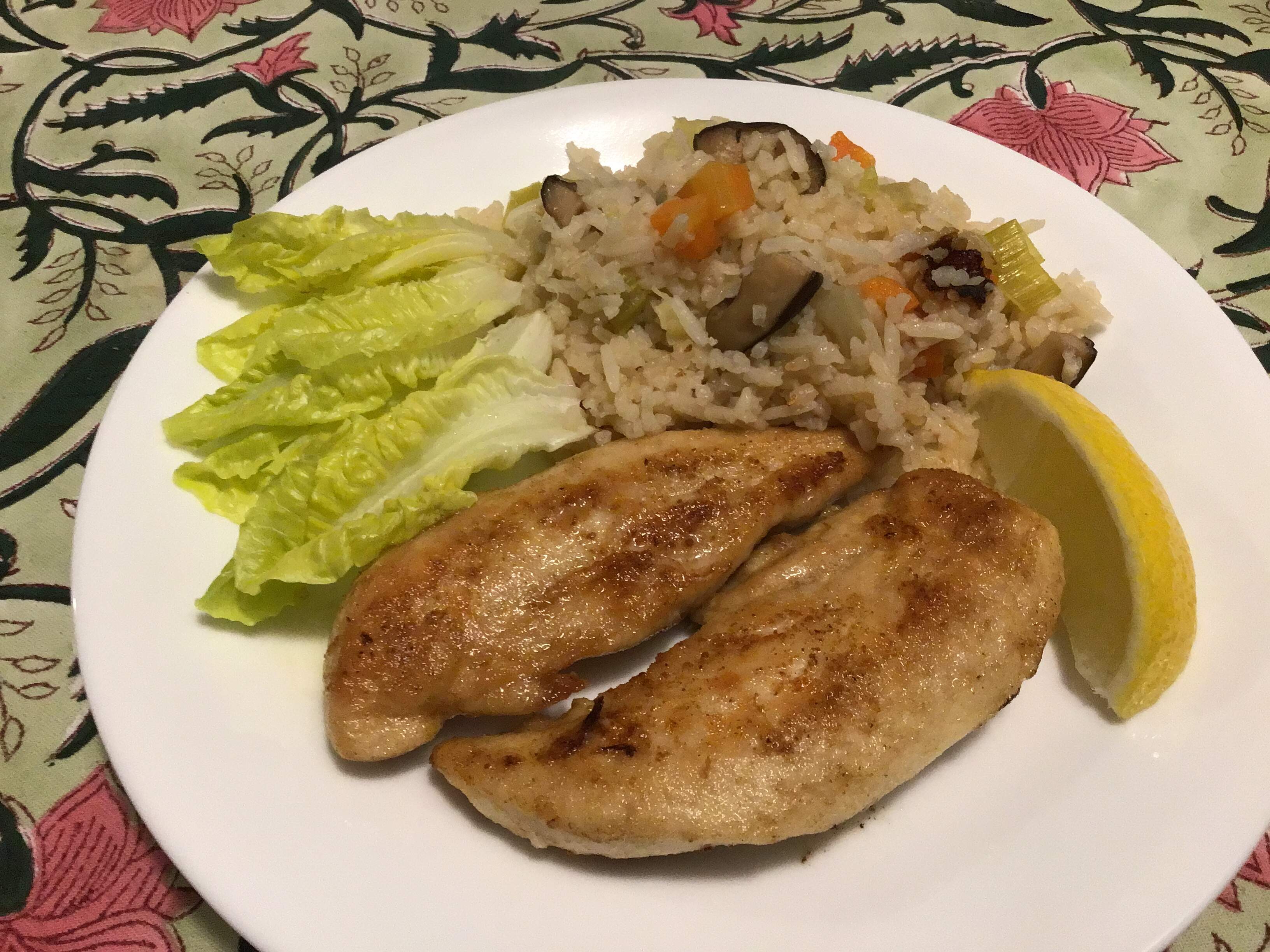 Chicken tenders, confetti rice, hearts of Little Gem.