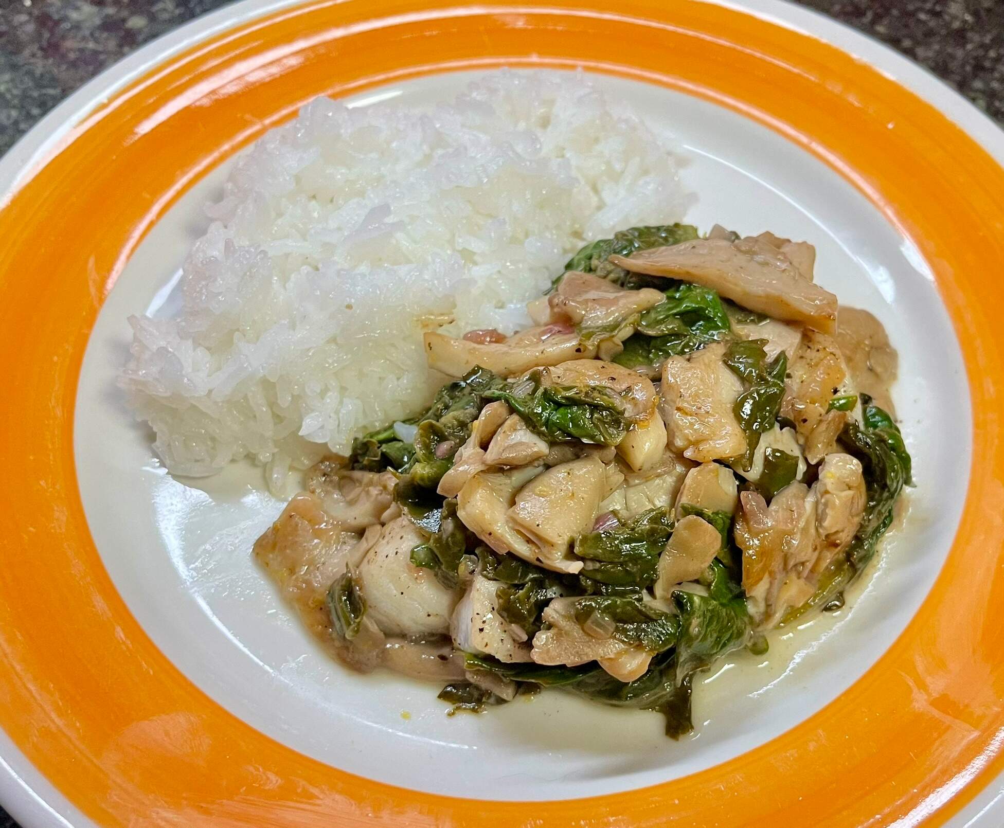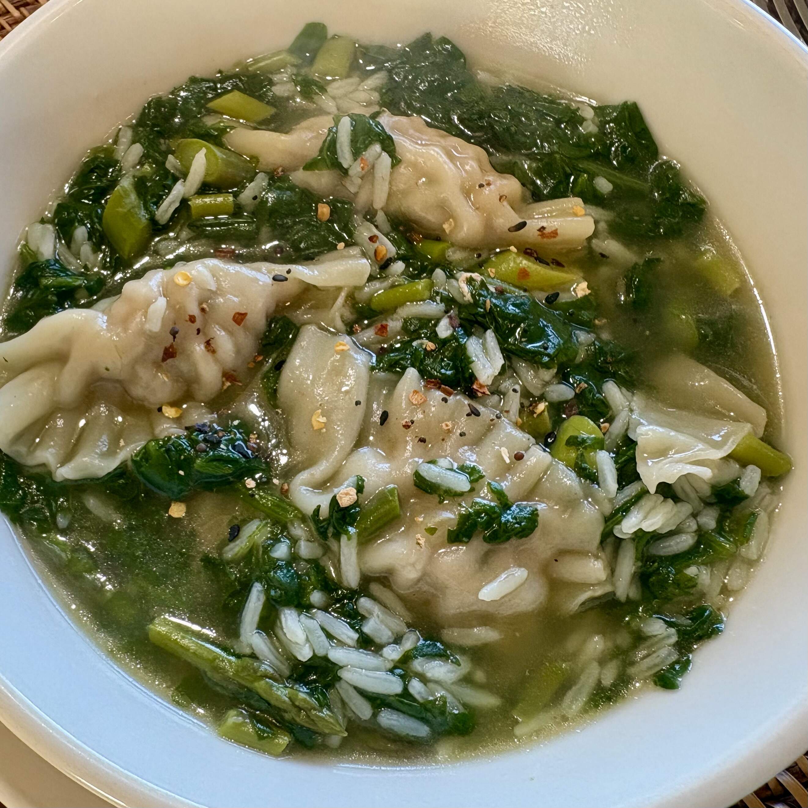 Busy day today, so WFD was a quickie. Pork and cabbage potstickers from frozen in homemade stock with garden veg (spinach, asparagus) and leftover Jasmine rice. A pinch of Japanese 7 spice made it taste like someone actually planned for dinner.