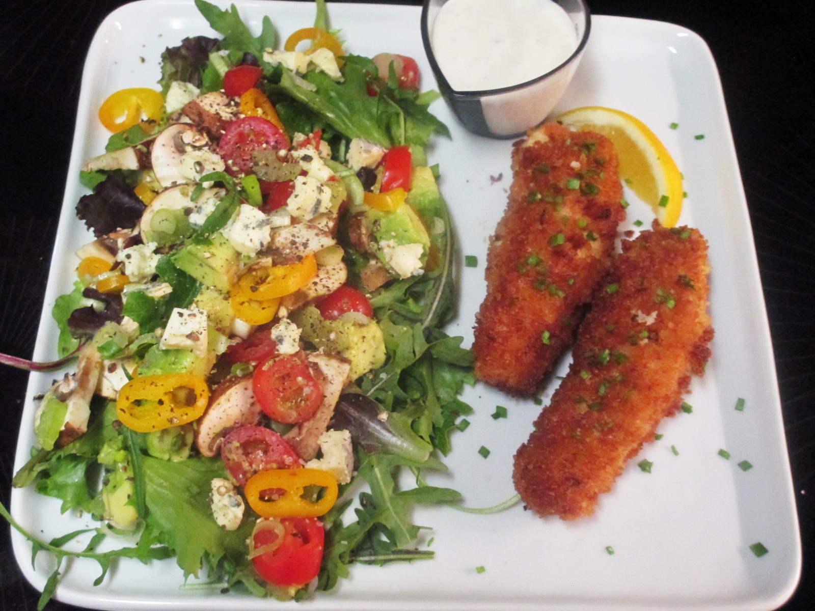 Crispy Sour Cream and Onion Chicken tenders. BA salad of mixed baby greens, baby wild red arugula, green onion, celery, grape tomatoes, mushrooms, avocado, orange mini bell. cambazola, ranch dressing.