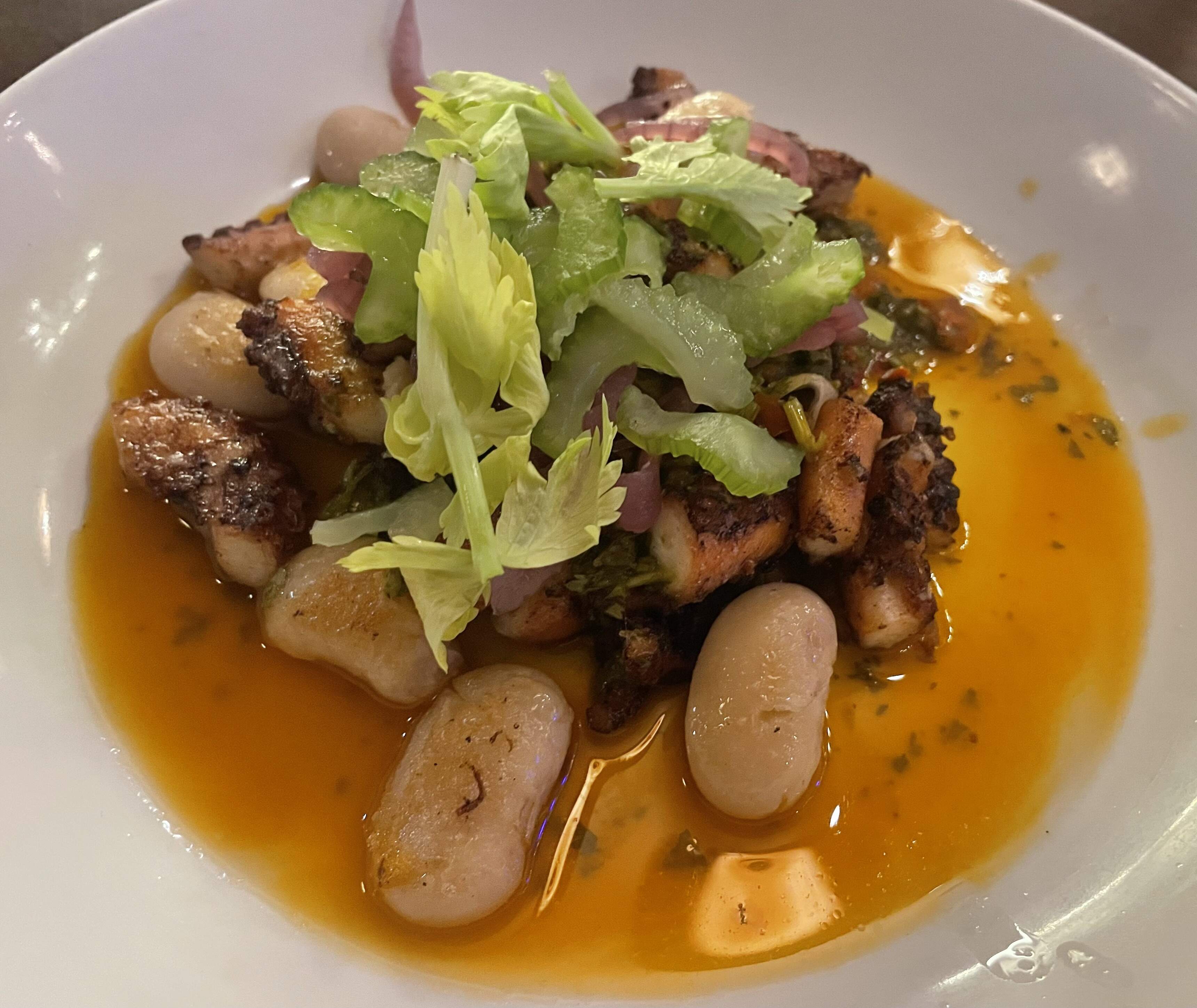 Charred octopus, gigande beans, citrused celery, pickled red onions, lime-cilantro vinaigrette