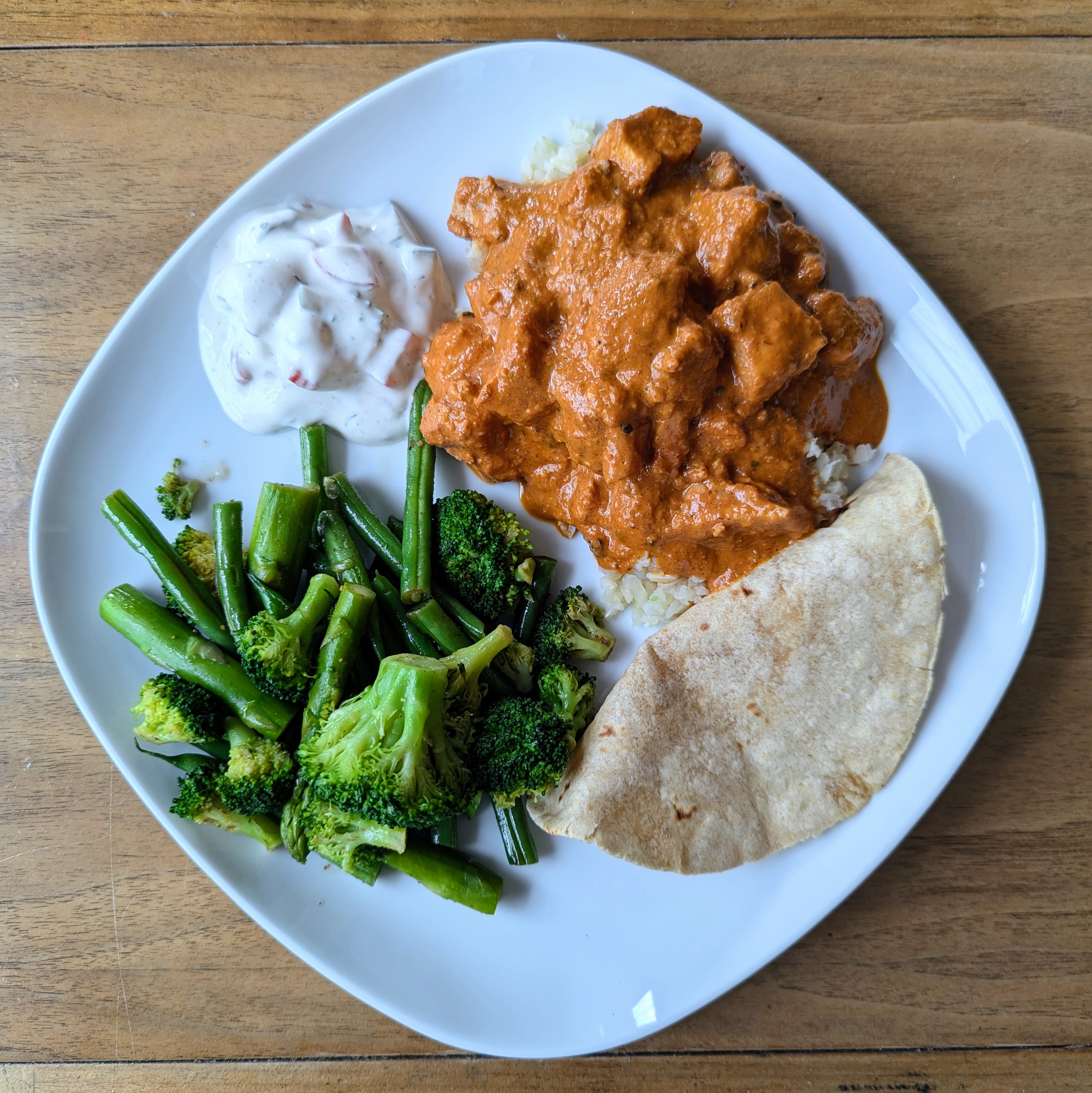 Tonight I made restaurant-style butter chicken served with whole wheat roti, cauliflower rice, and sauteed blanched green veg medley with chaat masala and butter. Some raita on the side, which wasn’t really necessary but I built it on the base of some leftover tzatziki that needed using. My husband grilled and smoked the chicken over charcoal, which lent a nice smokiness. Everyone seemed happy.