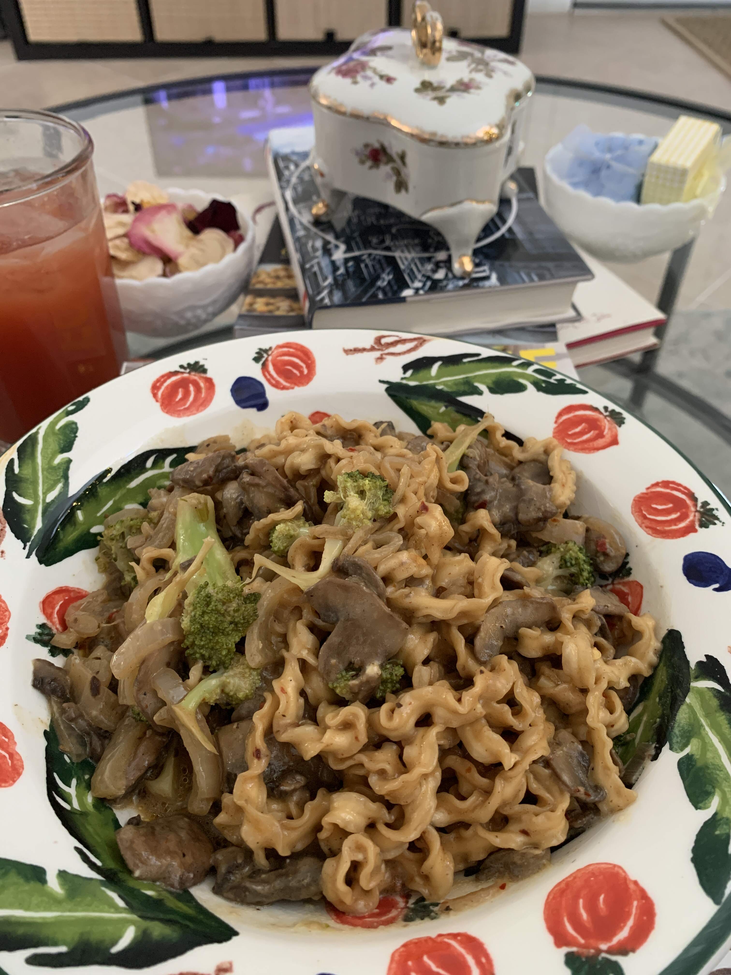 Squiggly knife cut noodles from Trader Joe’s cooked minimally in chicken broth and then mixed with sauce made from mushrooms, shallots, yellow onion, salt, pepper, RPF, garlic, grapeseed oil and butter with some broccoli thrown in at the end to steam.