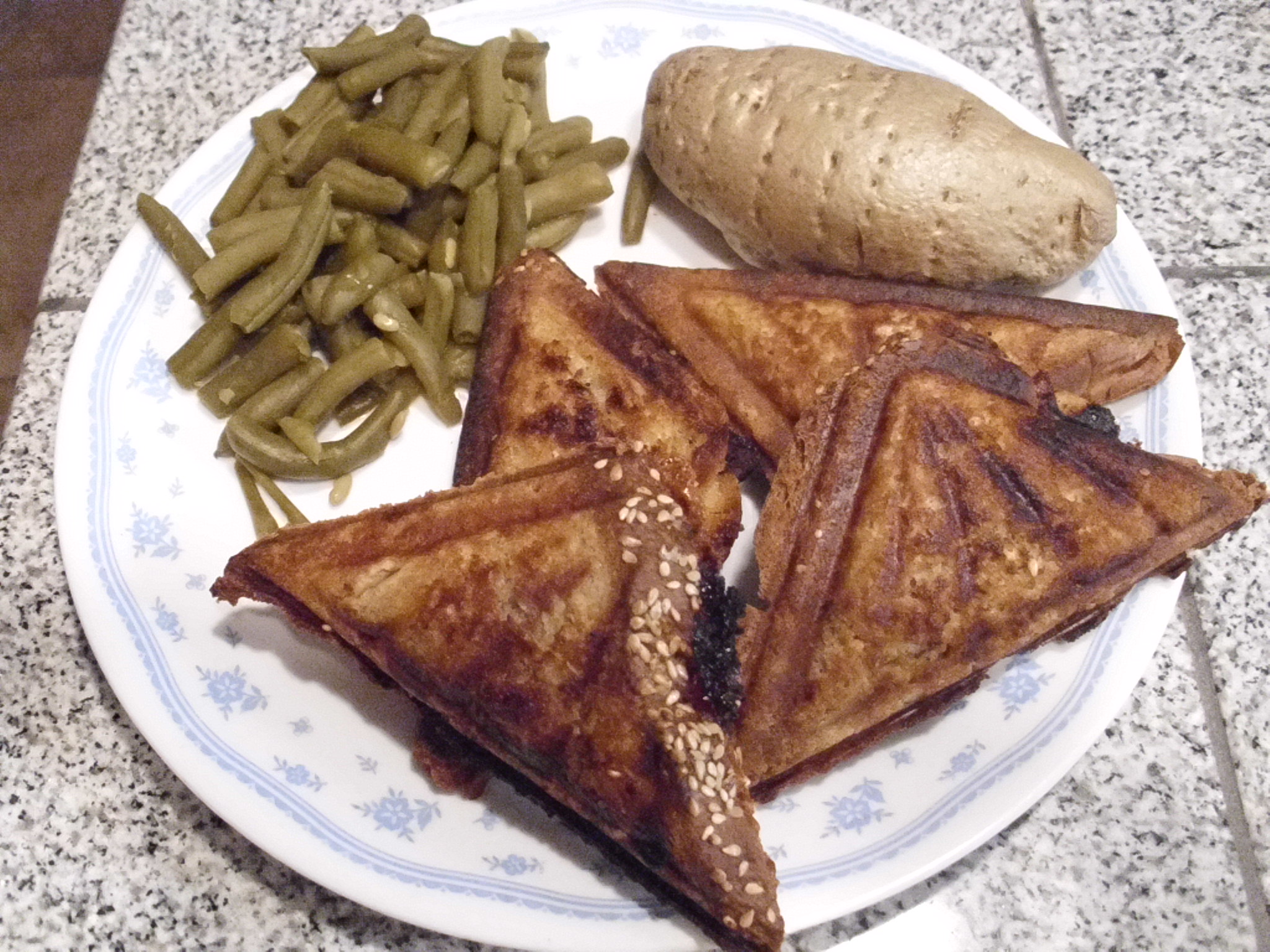 In a continuing effort to use up leftovers in the freezer, I served some leftover hot pockets. Baked Potatoes and green beans rounded out this oddball dinner.