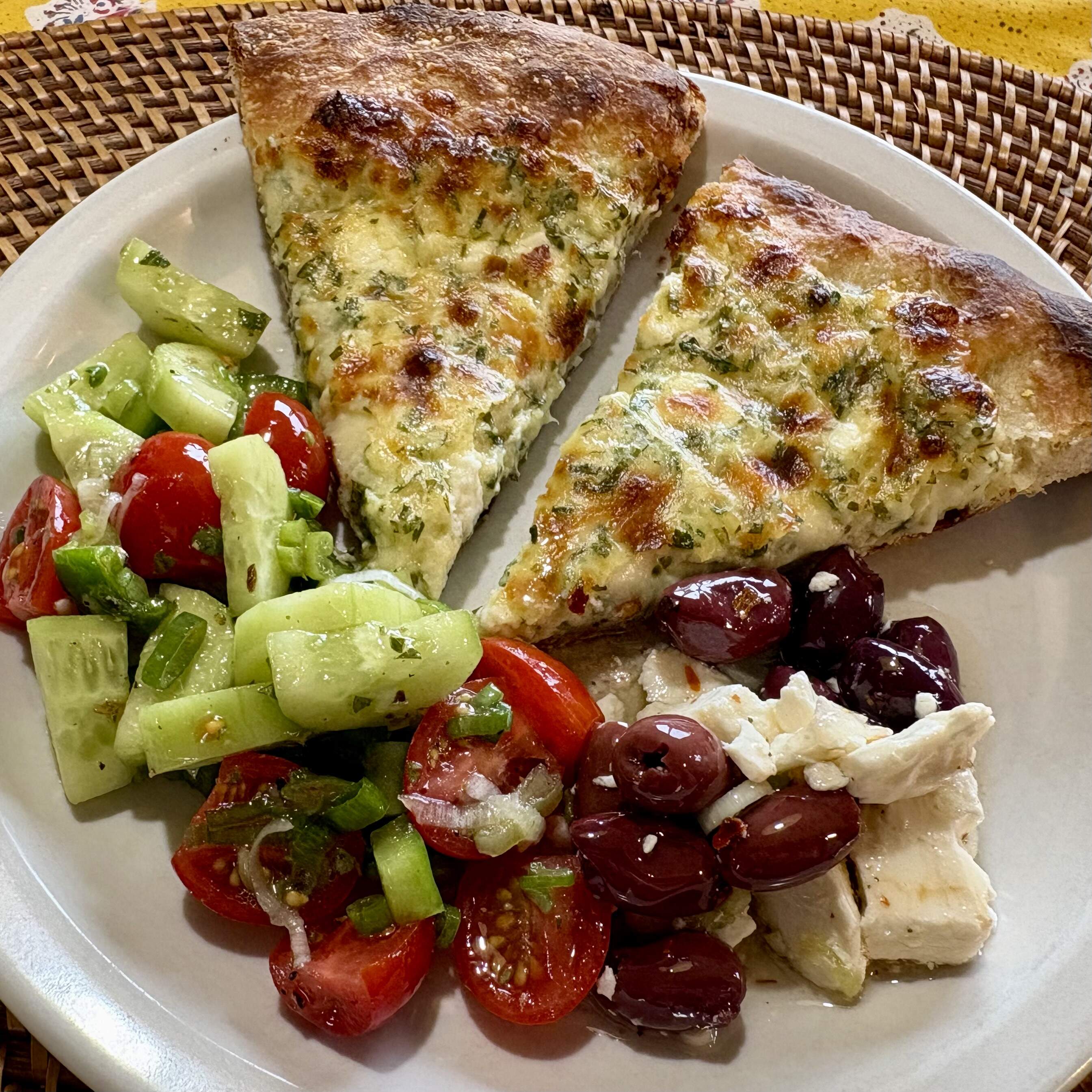 Khachapuri Tarkhunit – round style. The filling is cheese-and-egg based with lots of fresh herbs and a pinch of flour - I used just-picked chives, tarragon, and parsley from the garden. Marinated olives and feta on the side. Med-pepper salad with fresh oregano in the vinaigrette. Spring is here!