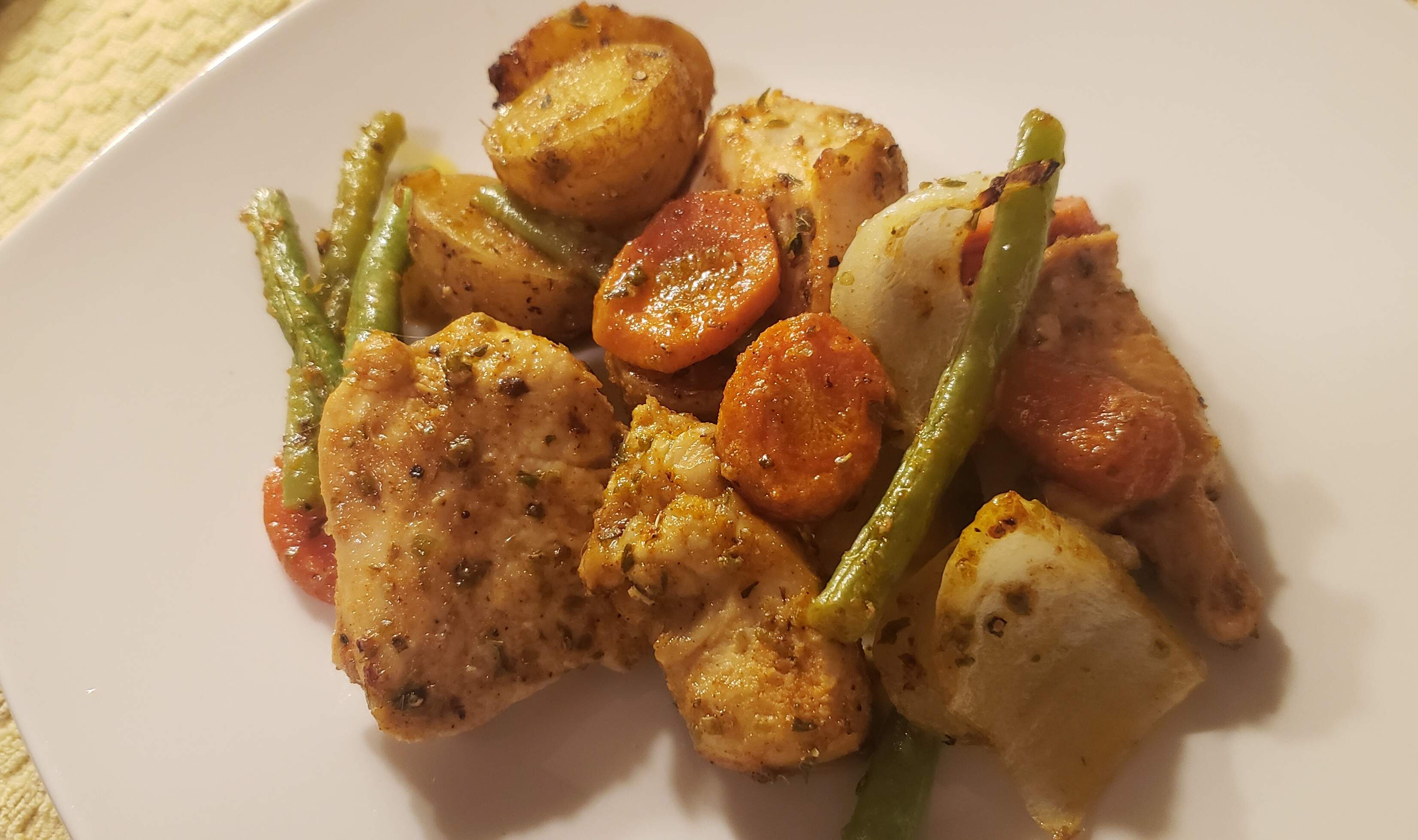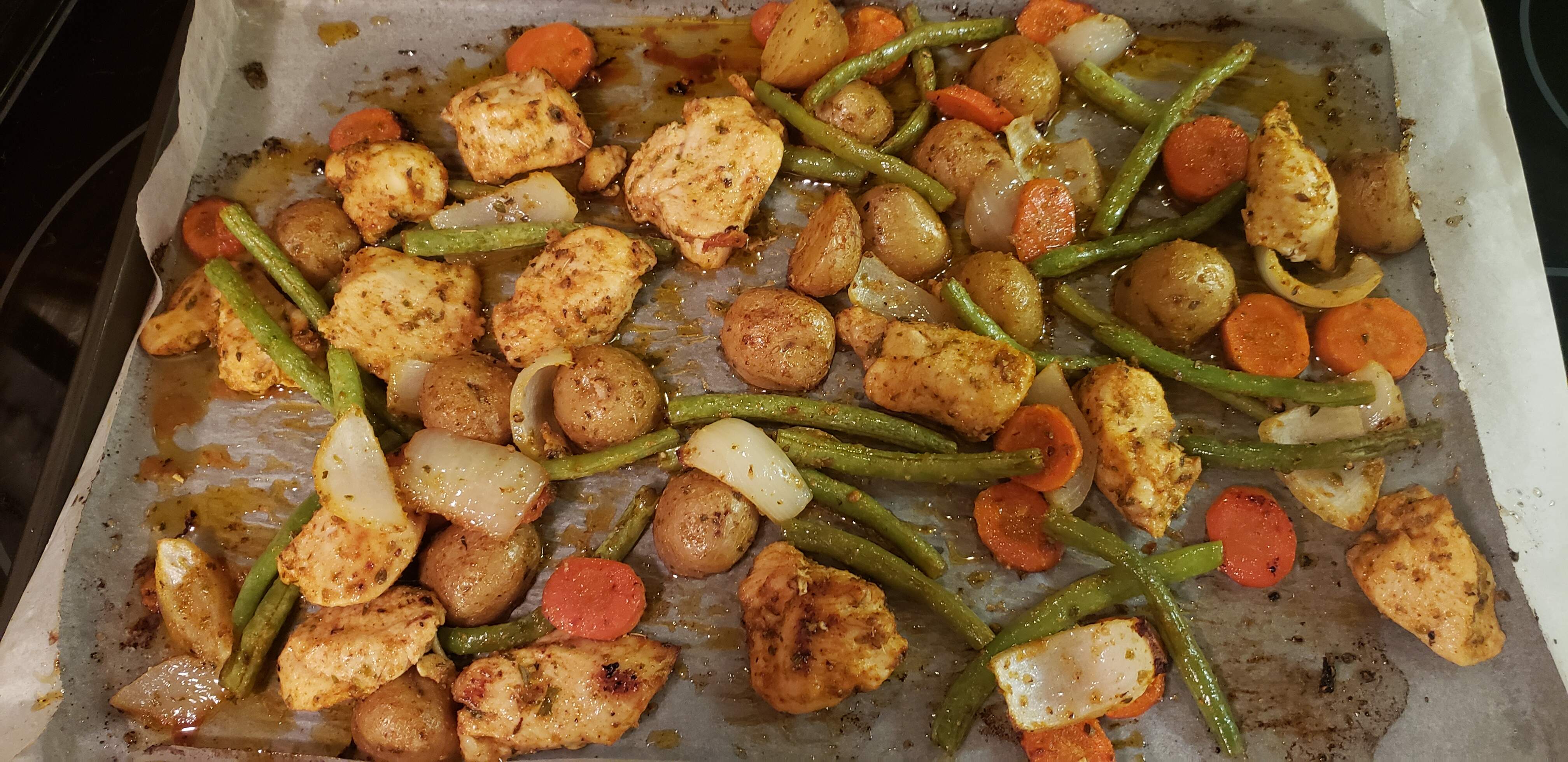 Sheet pan chicken and veg tonight…chunks of b/s chicken breast, sliced carrots, onions, green beans, and halved baby potatoes were all tossed with a combo of olive oil, s/p, garlic powder, paprika, oregano, some lemon juice and lemon zest (the beans and onions were tossed separately after the other ingredients and held out for the first part of cooking).