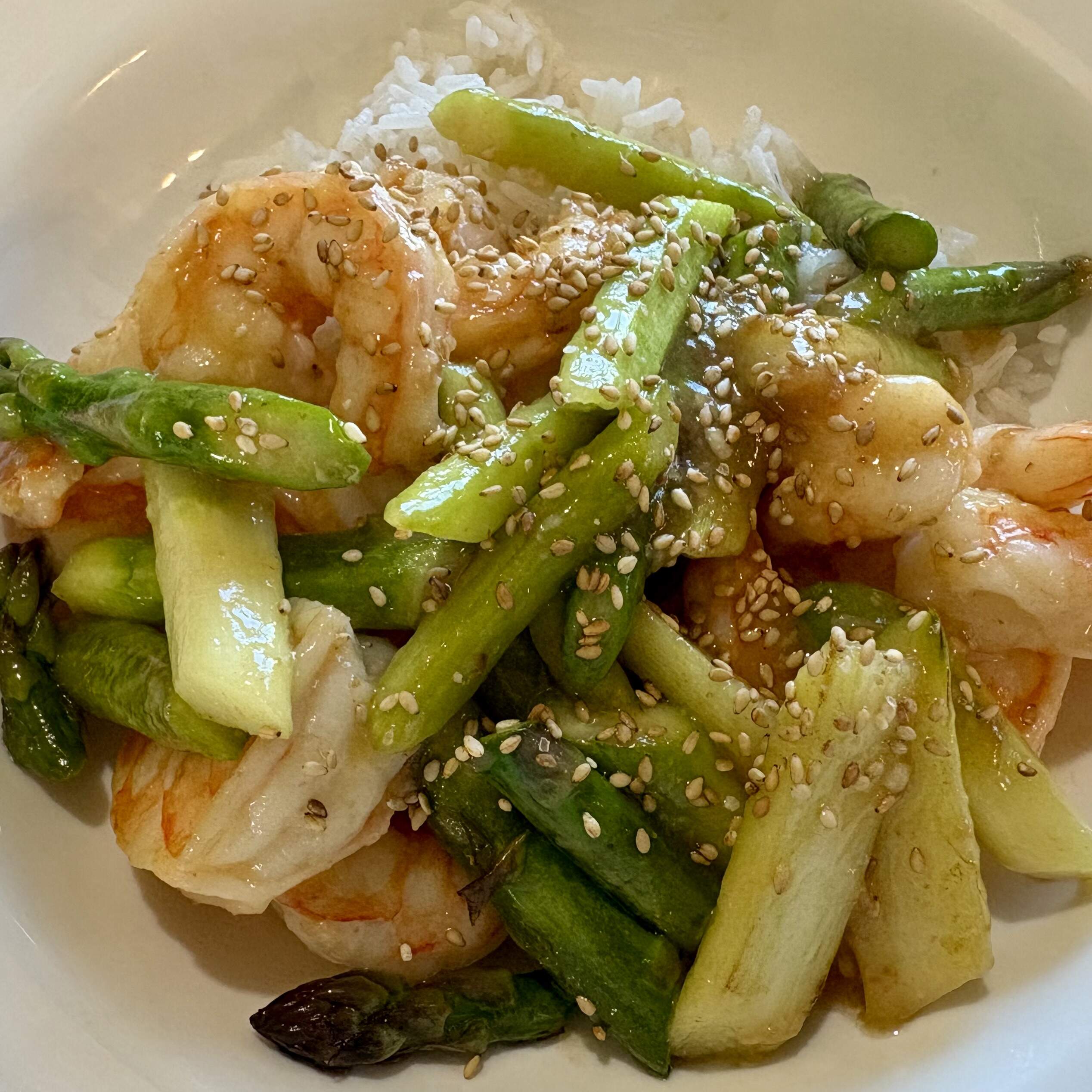 Stir-fried gulf shrimp with garden asparagus over rice. Cider vinegar, mirin, and a sprinkle of sugar make the sauce. No leftovers.