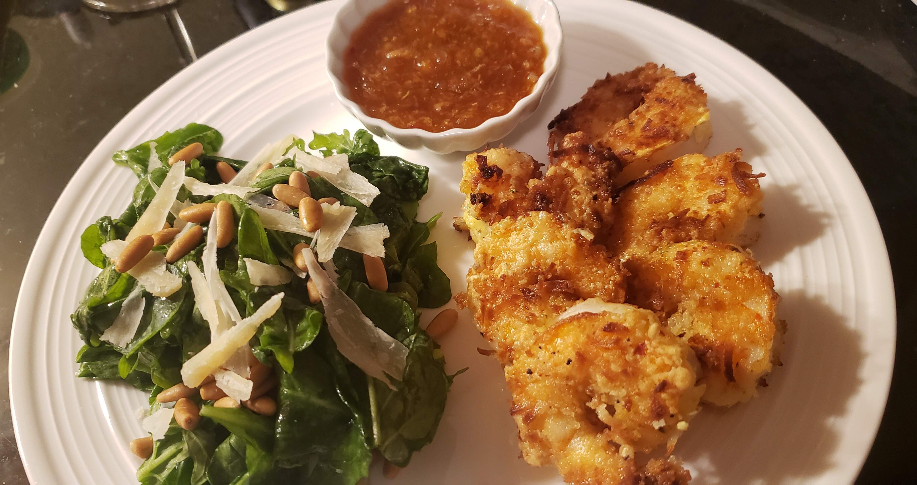 Had a craving for coconut shrimp, so it was for dinner tonight, with a dipping sauce of blood orange preserves, Thai sweet chili sauce, lime juice, and lime zest. Side was an arugula salad with toasted pine nuts and shaved Parm-Reg, and a vinaigrette of olive oil, lemon juice, Dijon mustard, honey, and s/p.
