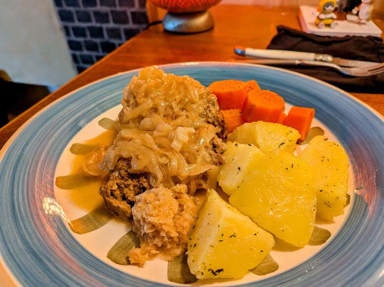 For me, BF made another tofu/cabbage dish, this time with peanut butter from a recipe i sent him. Was good but not as good as the last one I made (different recipe), so probably not a repeat. For himself, reprised meatloaf, with onion gravy, more buttery taters, and carrots. Good for a rainy SF night.