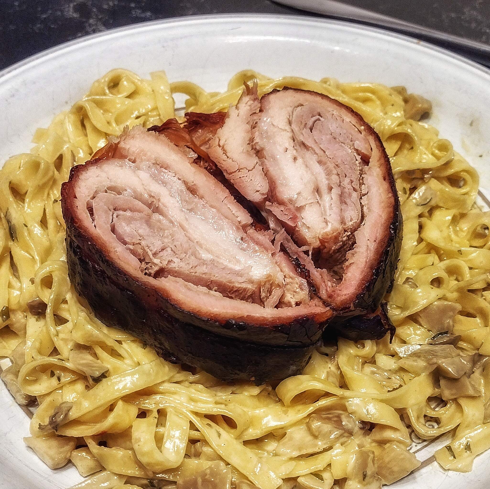 Roast porchetta, wild mushroom, tarragon and mustard cream tagliatelle.
