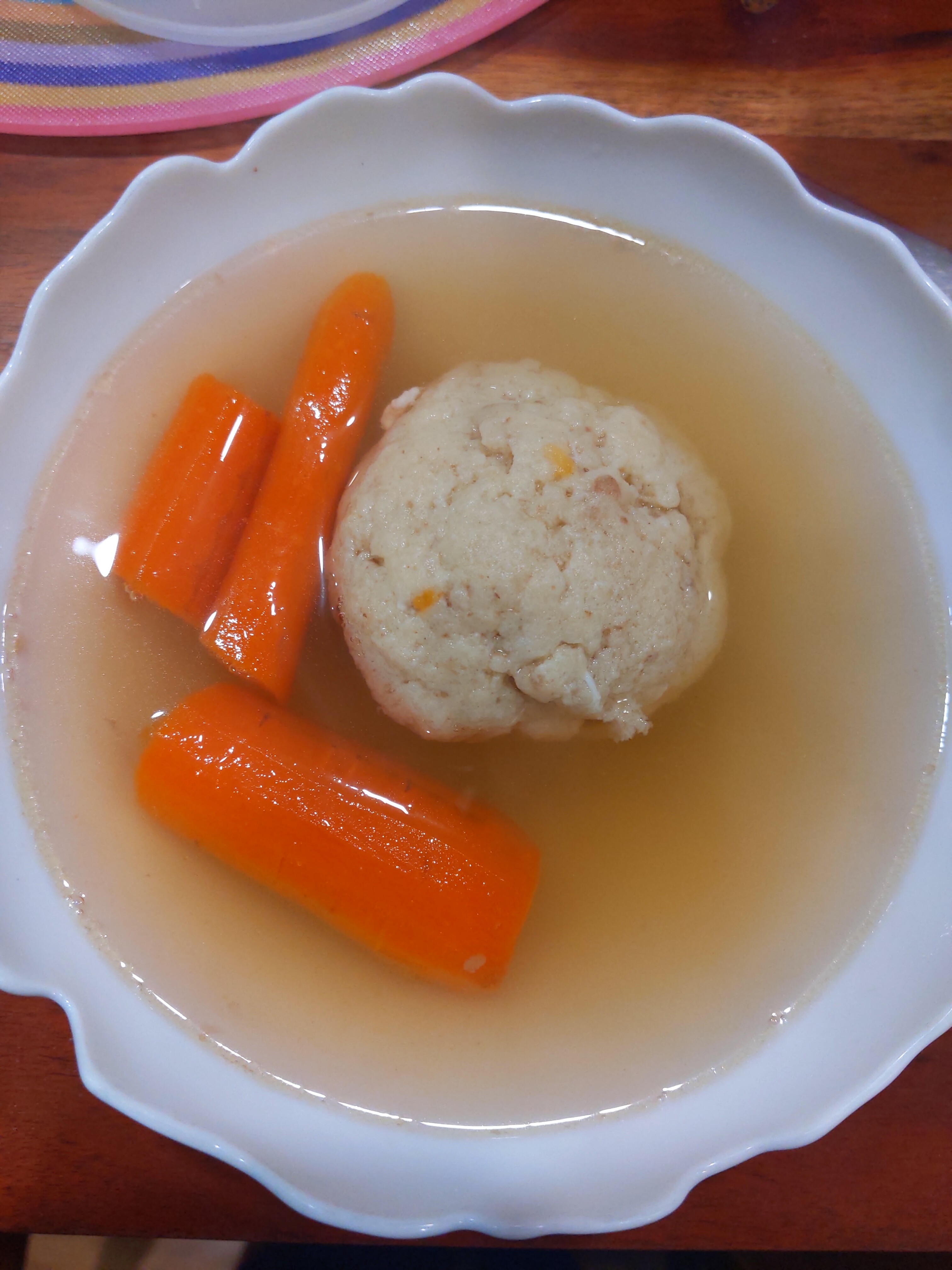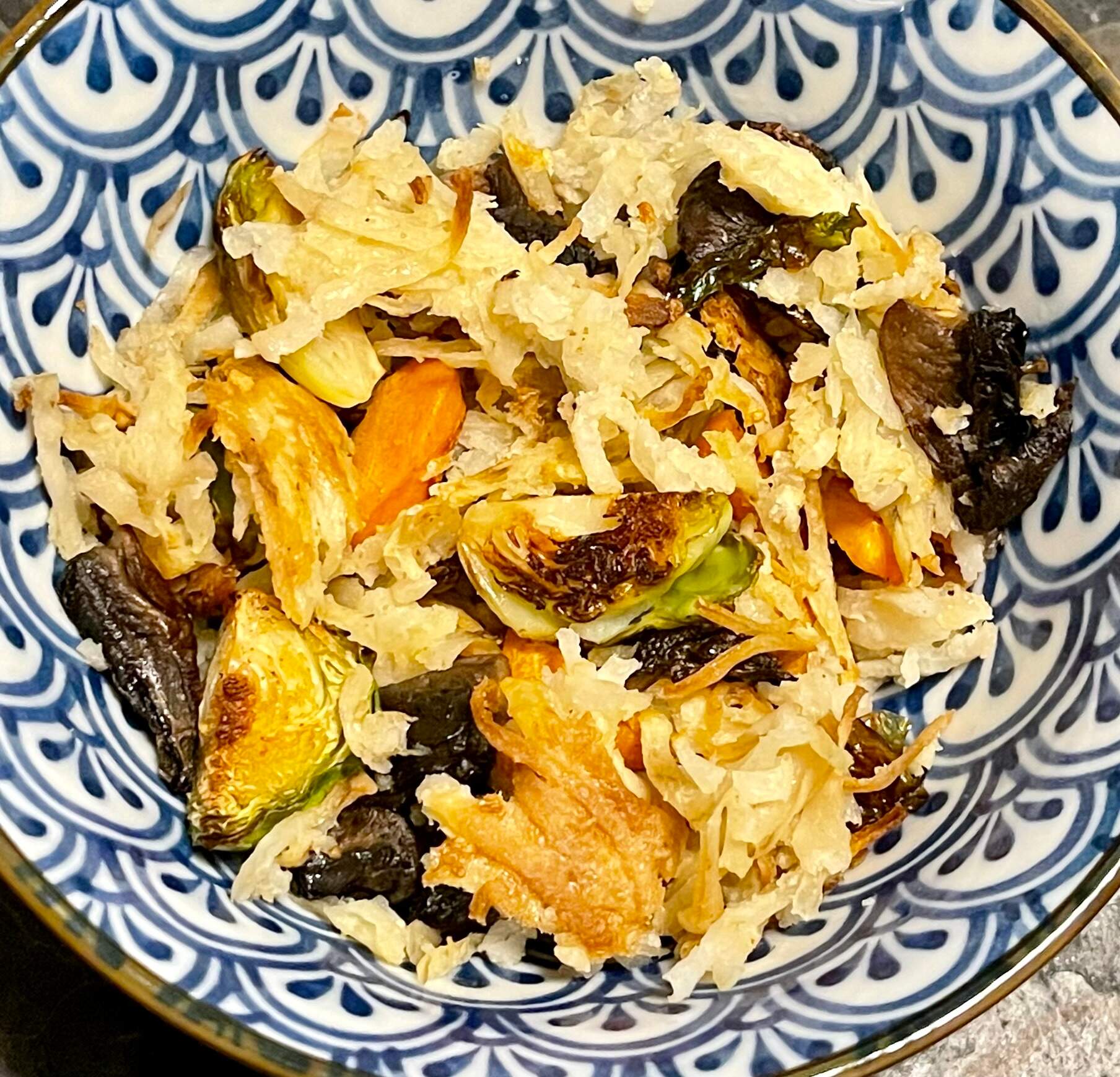Hello! And welcome to This Is What You Have in the House, Deal With It. One Brussels sprout. Half a portabello mushroom. A length of carrot. Potato kugel left over from a seder which was kind of a long time ago!
