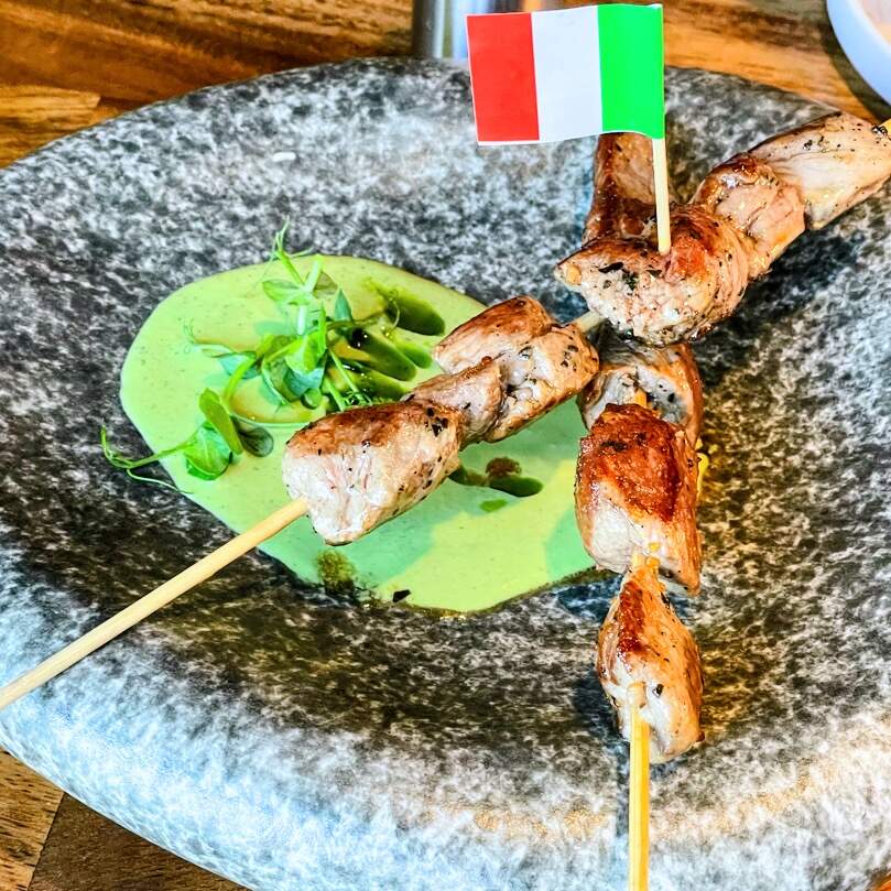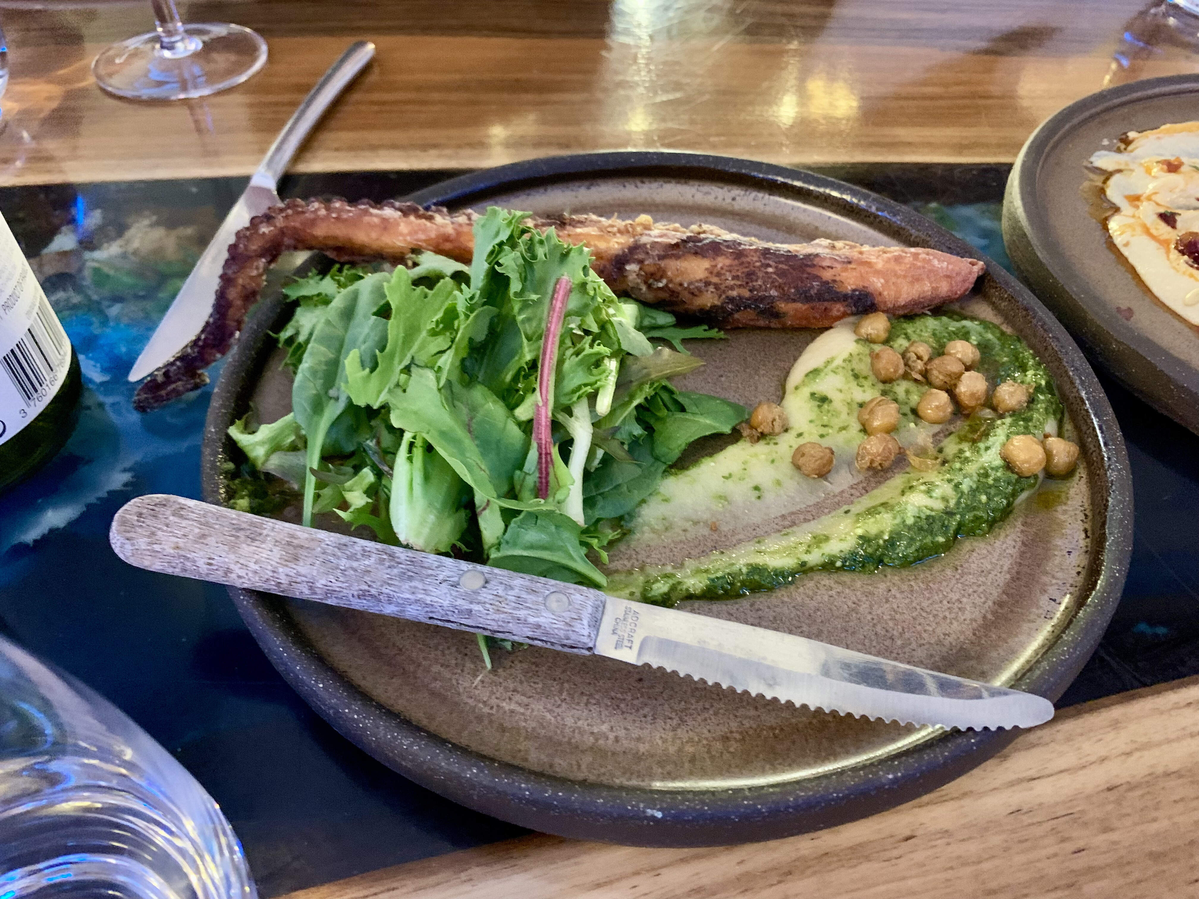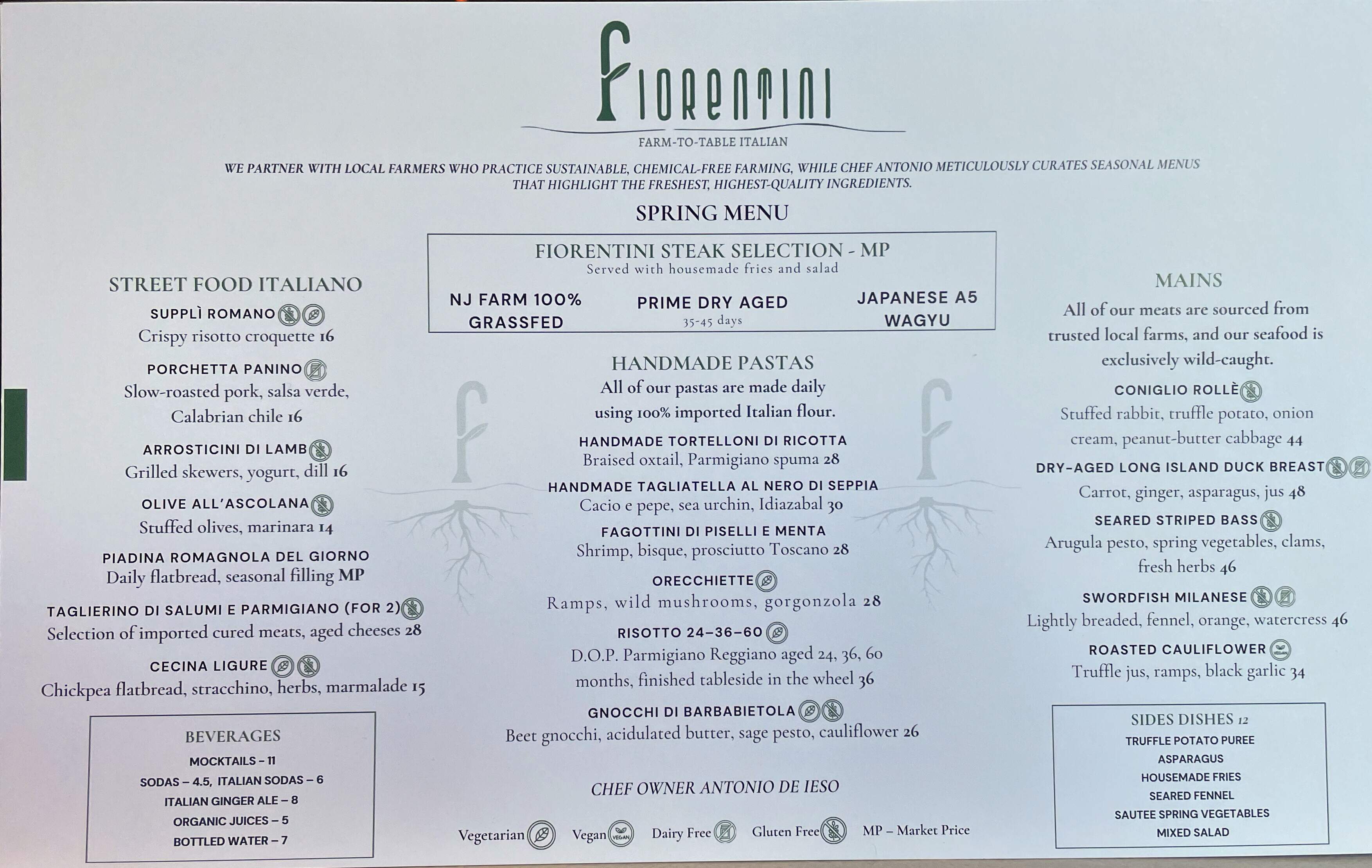 We enjoyed another outstanding dinner at Fiorentini, in Rutherford, NJ, including orrechietti with ramps, wild mushrooms, and gorgonzola; roasted cauliflower with truffle jus, black garlic and ramps; swordfish Milanese; porchetta panino with Calabrian chili; crispy risotto croquette; 24, 36, 60 month parmigiano reggiano risotto prepared in the risotto wheel; lamb skewers. It all went great with a couple of excellent cabernets.