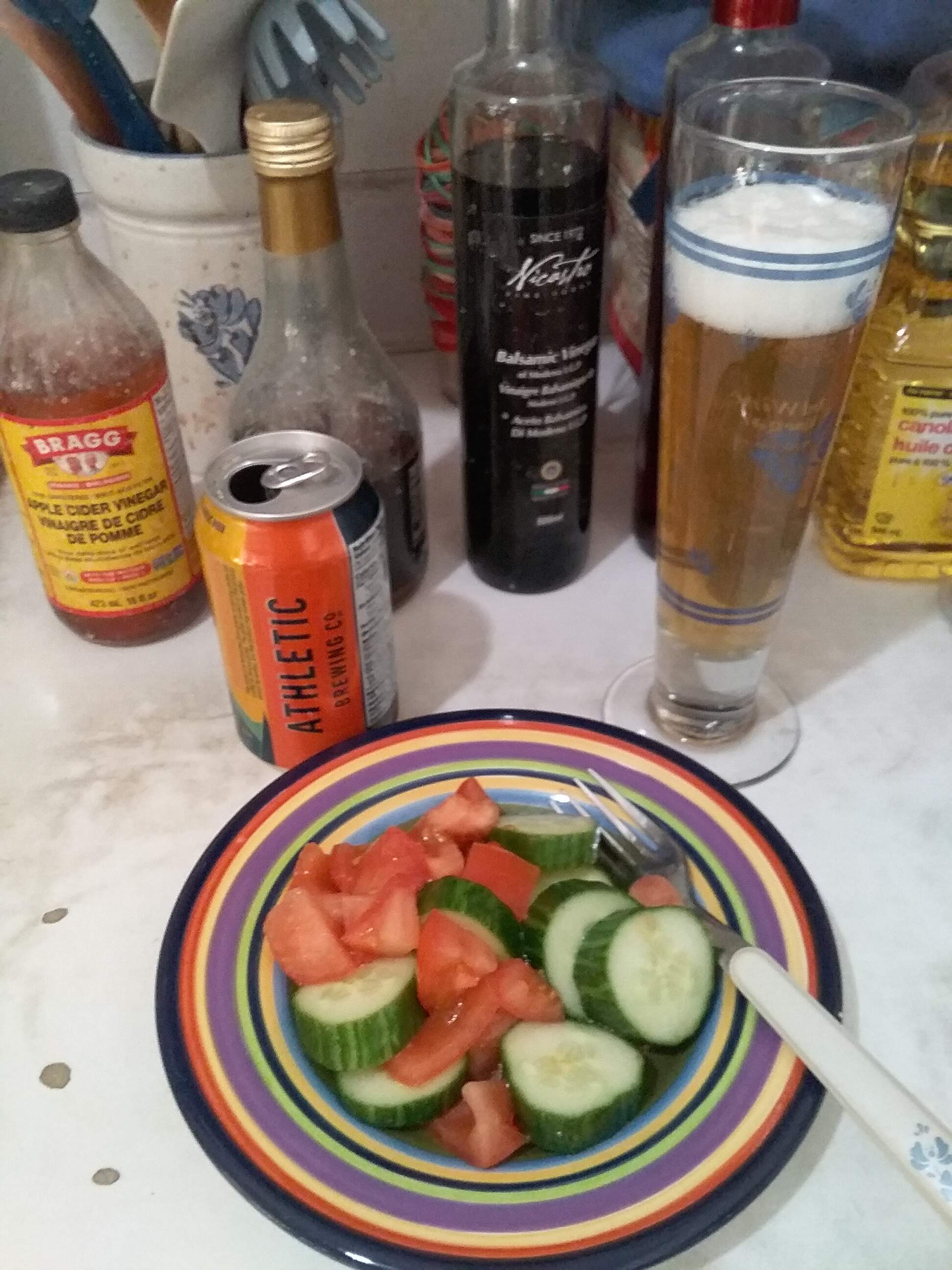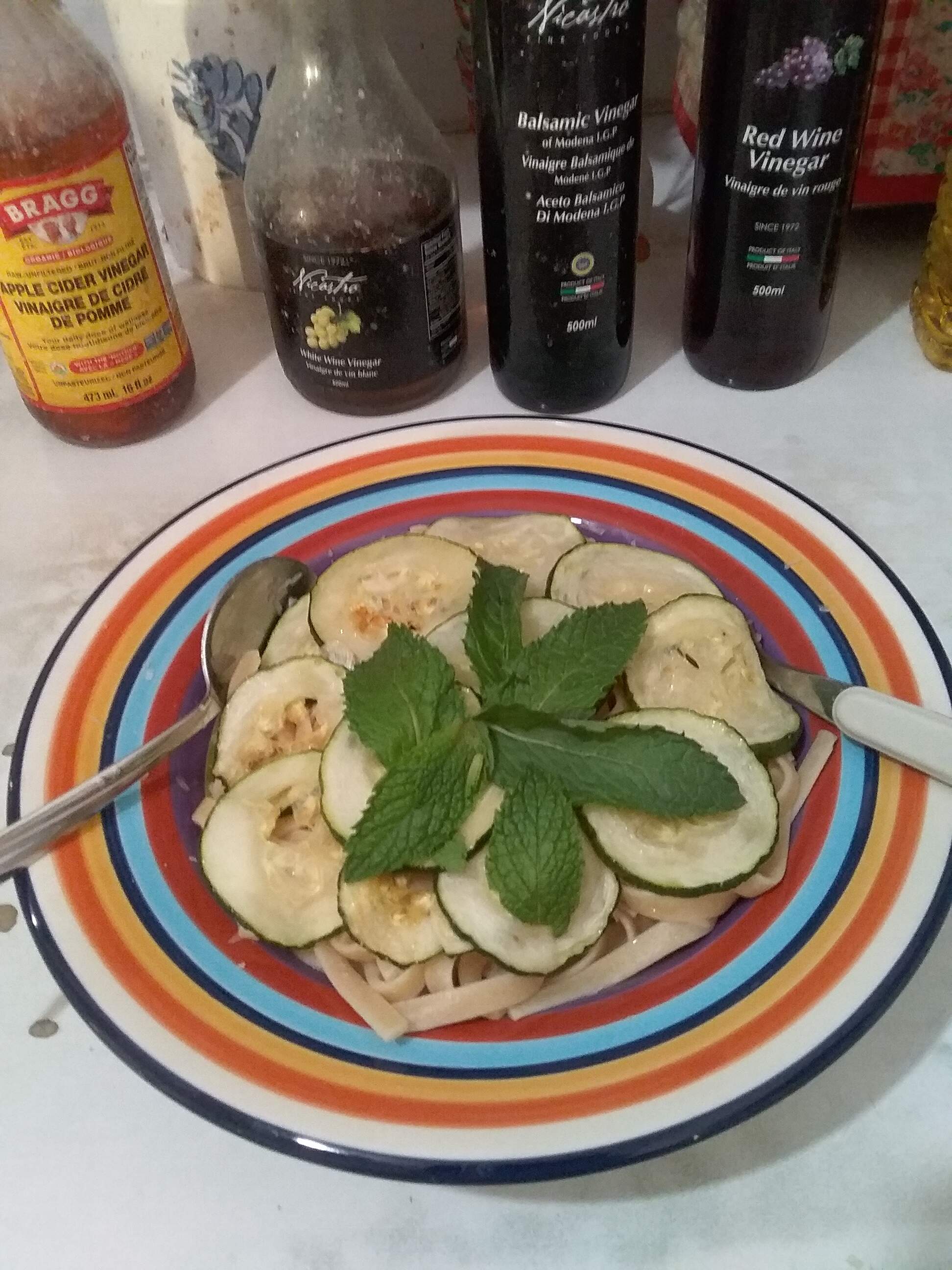 Dinner tonight was a cucumber tomato salad, linguine with zucchini and mint and some fudge and black currant tea.