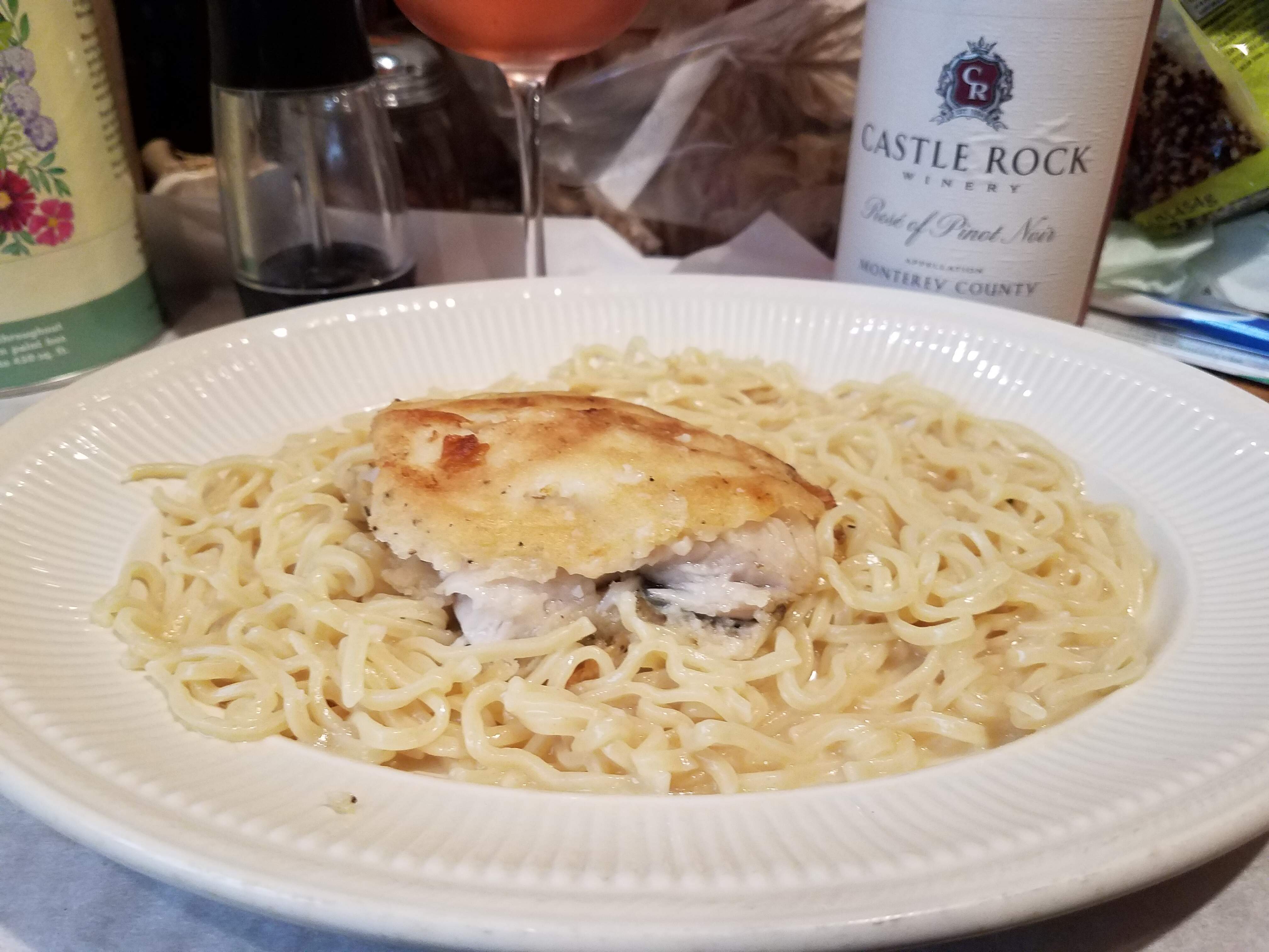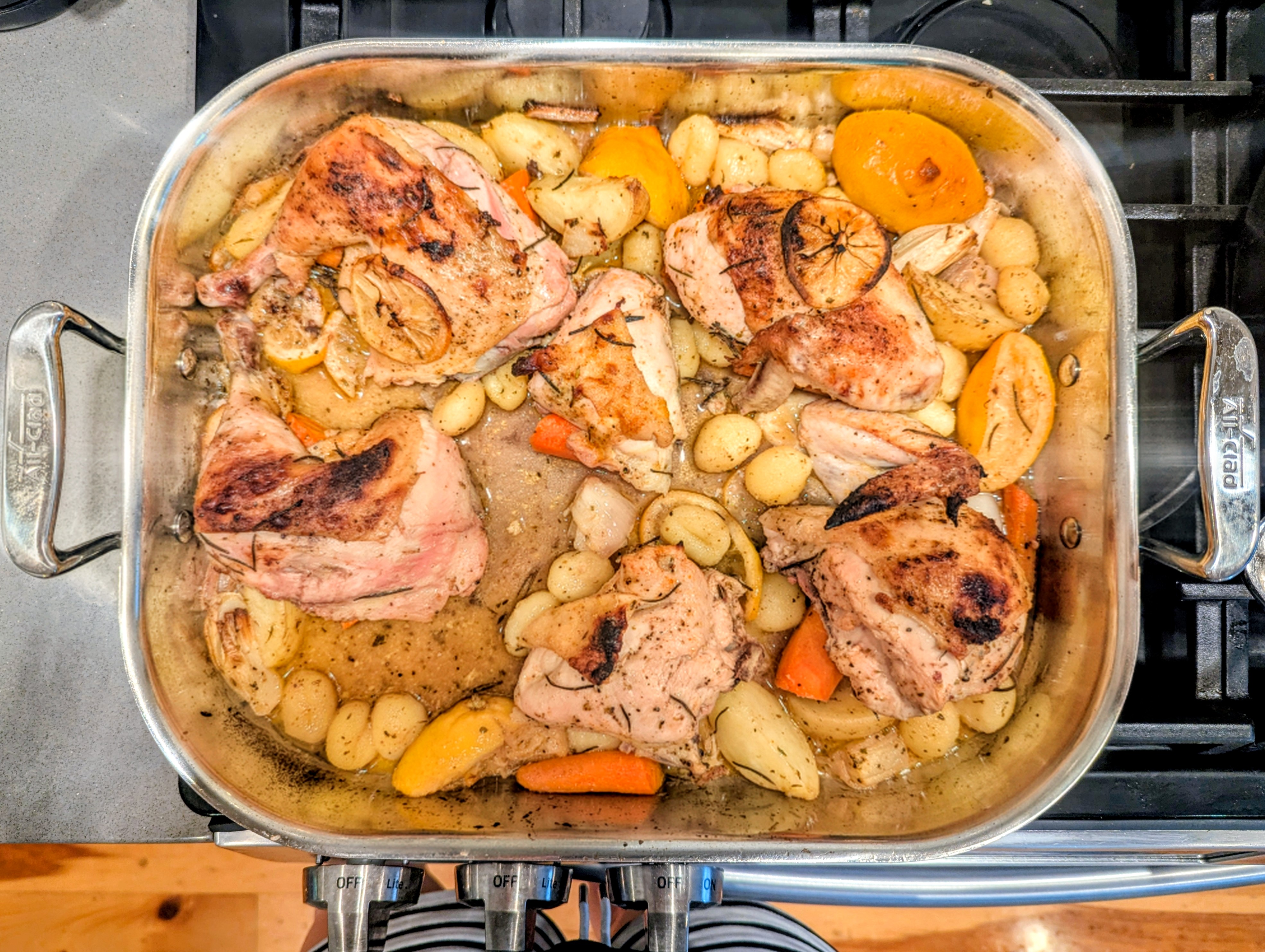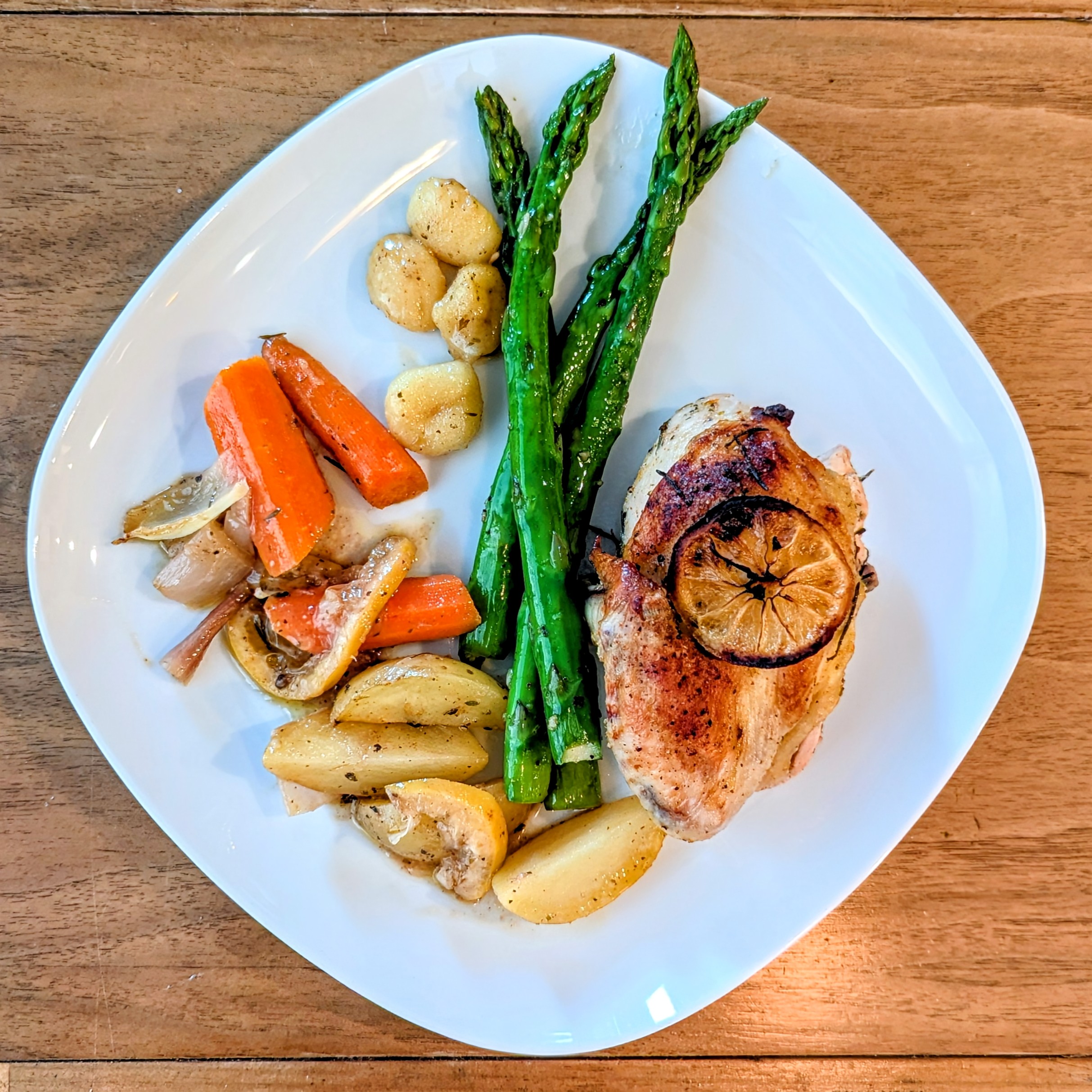 First night home after Tampa and first time cooking in a week. I made roasted lemon-rosemary chicken pieces (that I previously broke down from a small chicken). Cooked over shallot, carrot, and yellow potato (and a handful of gnocchi) and the pan sauce slightly thickened with Wondra. Garlic-butter asparagus for green.
