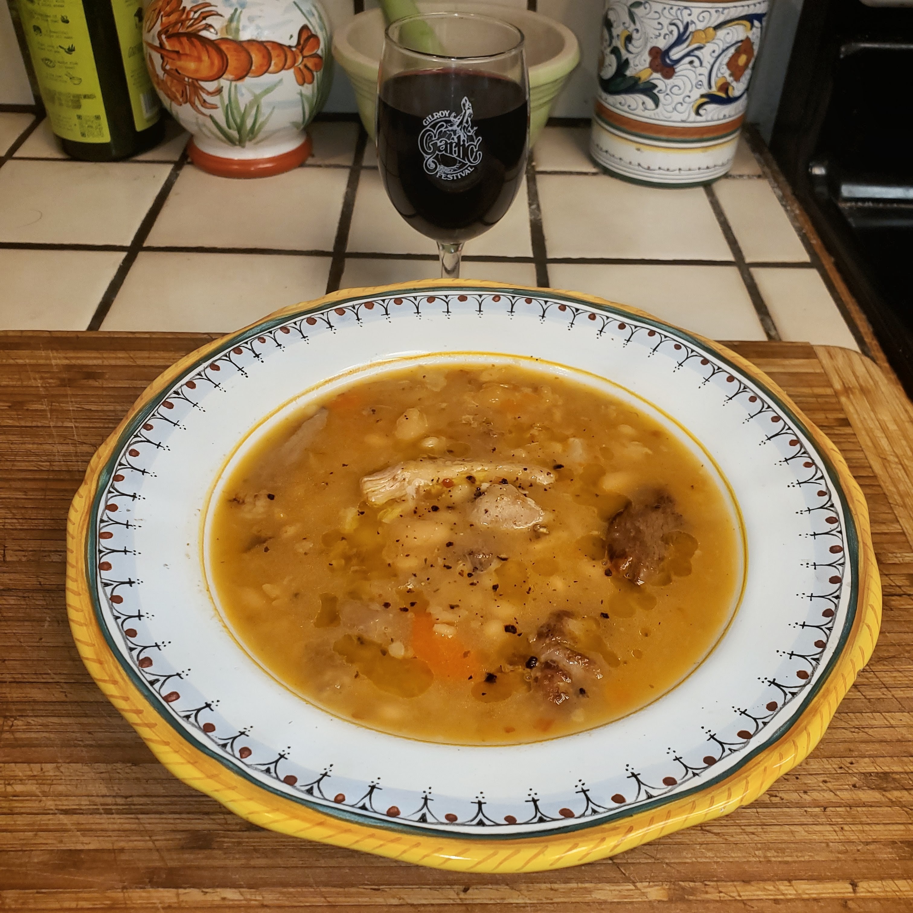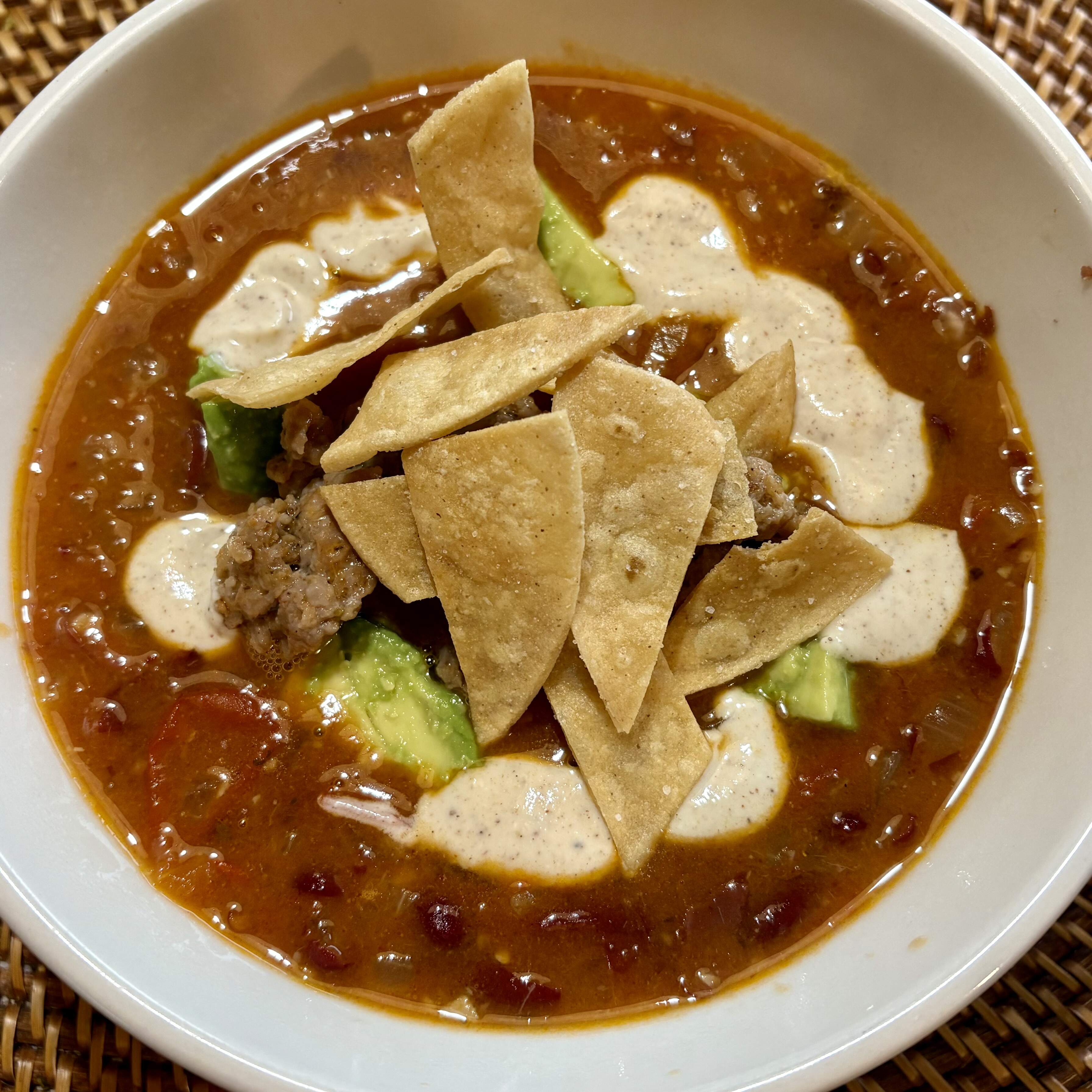A repeat of NYT’s Sopa Tarasca (spicy bean soup with chipotles and tomatoes). Served with fried tortilla chips, diced avocado, Spanish chorizo crumbles, and a heavily seasoned lime-habanero-yogurt crema.