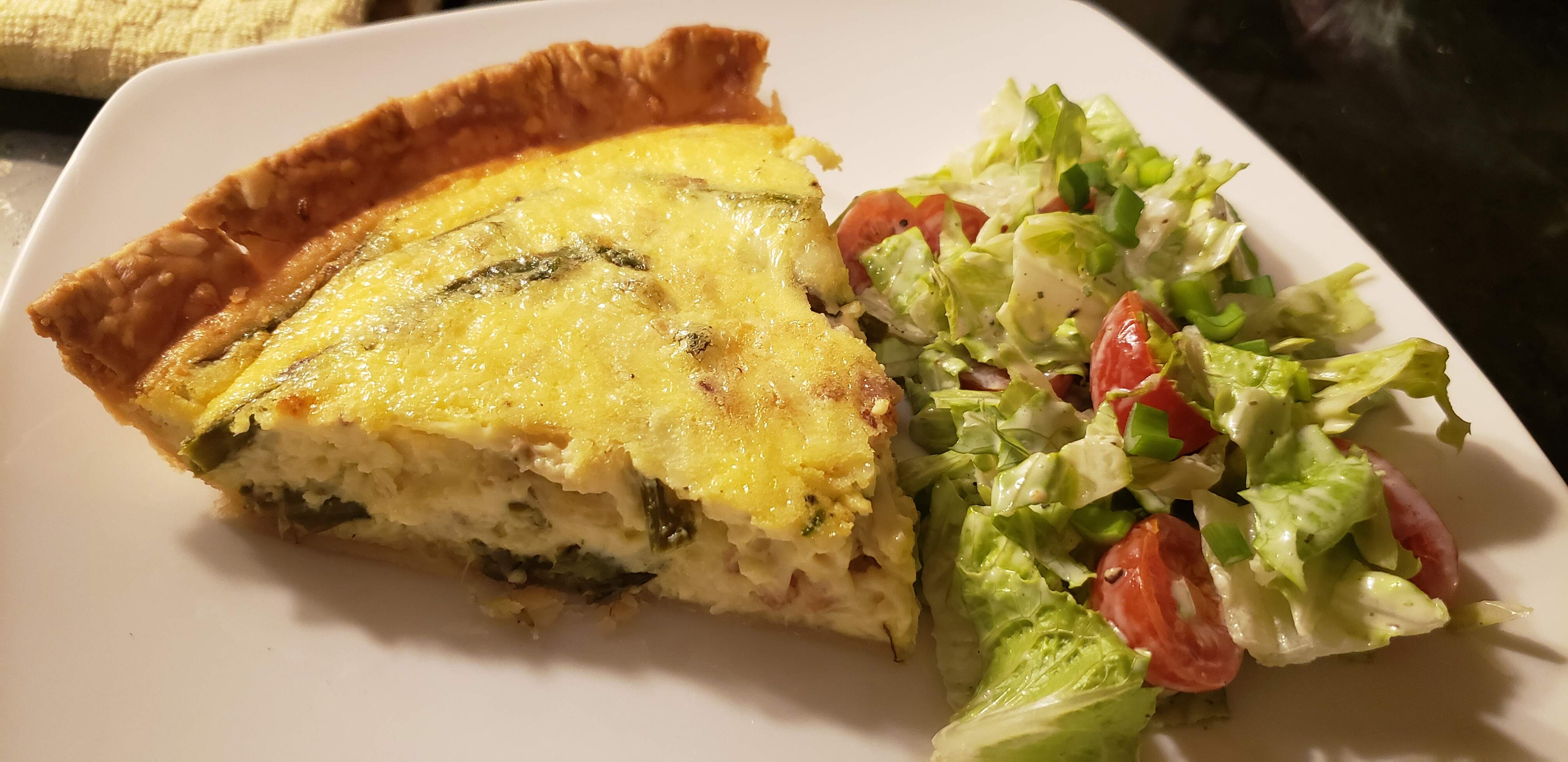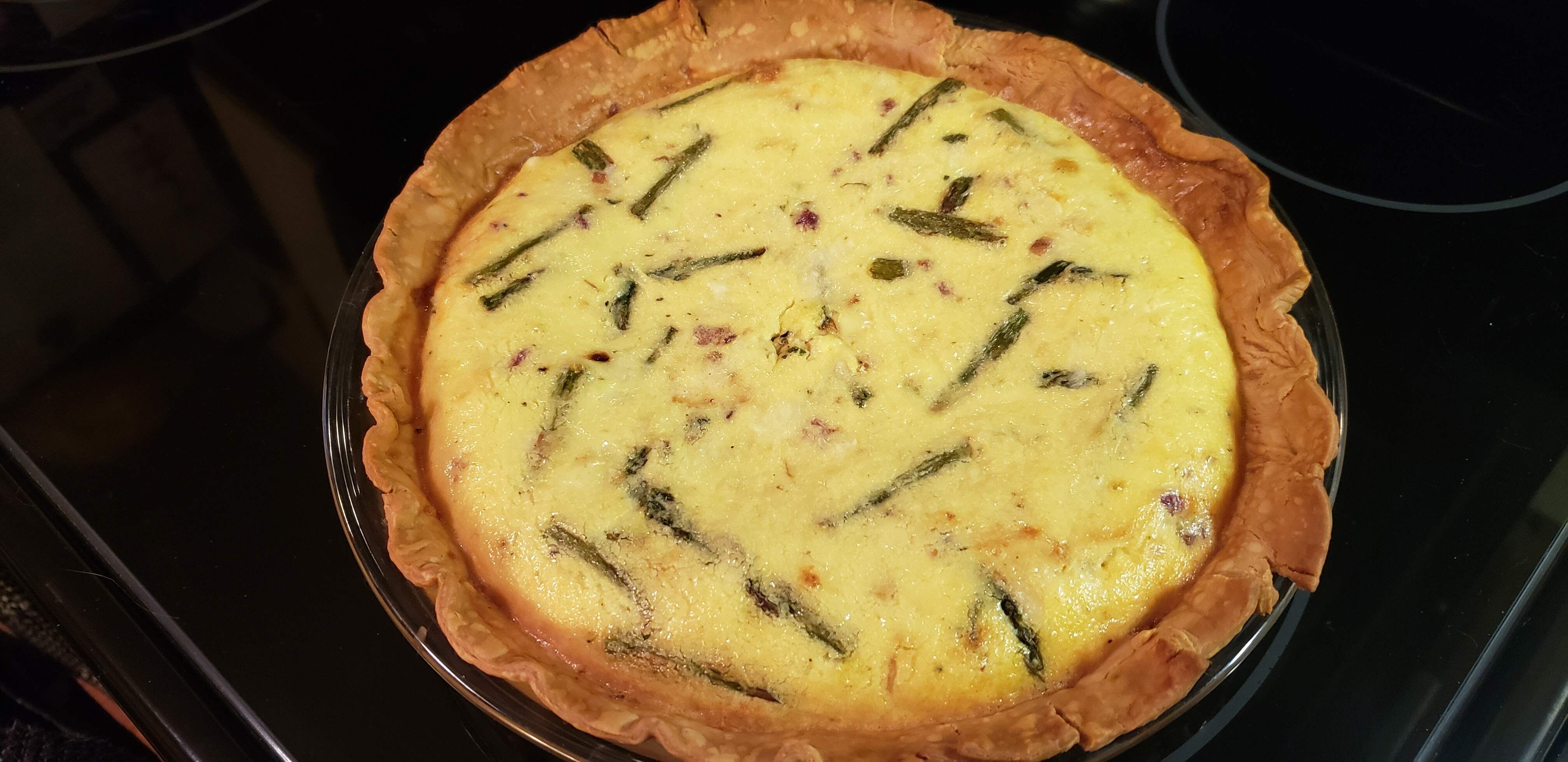 Roasted asparagus, pancetta, and caramelized onion quiche with small knobs of grated Monterey and Pepper Jack cheeses, and some Gruyere thrown in for good measure.