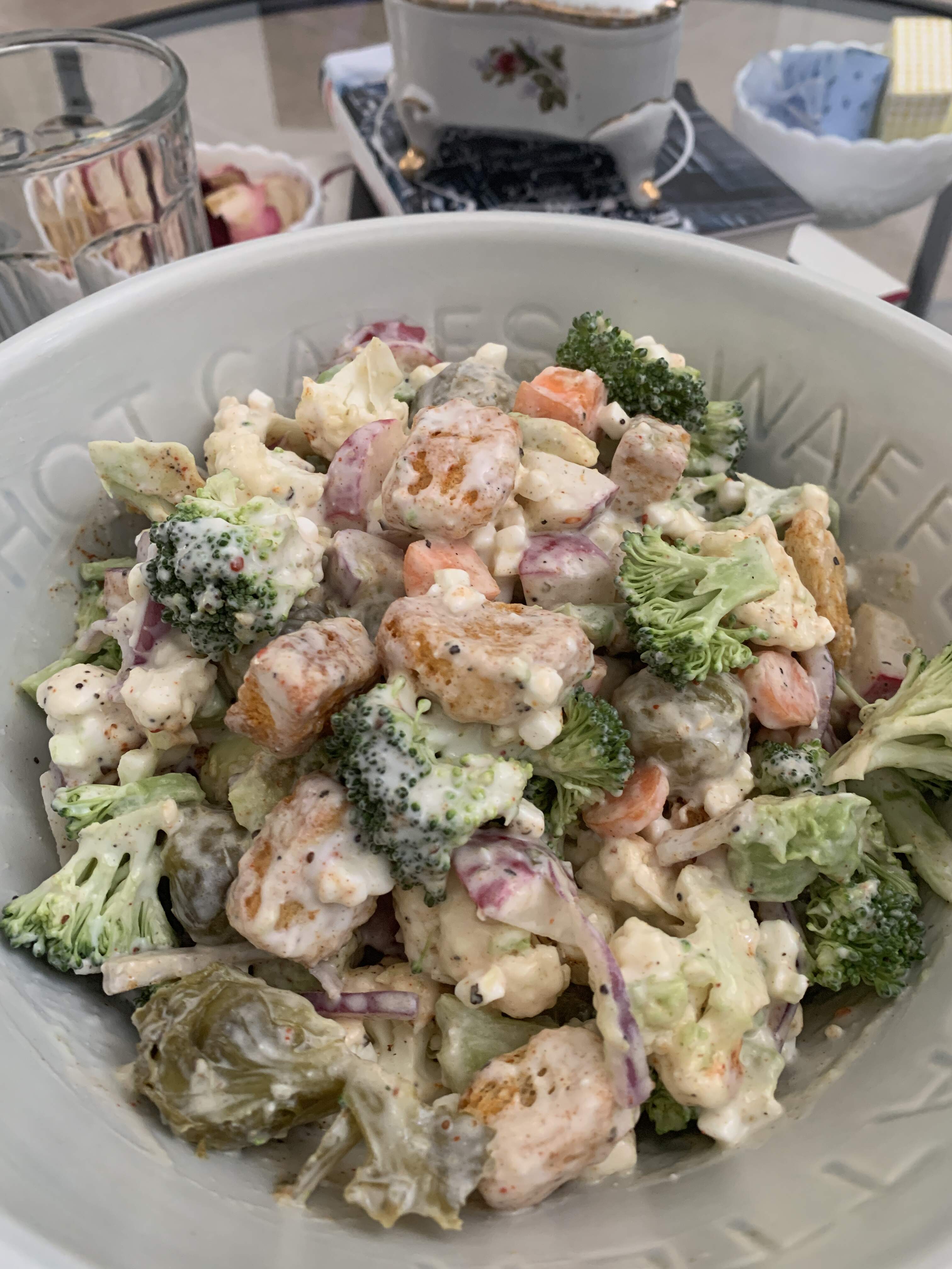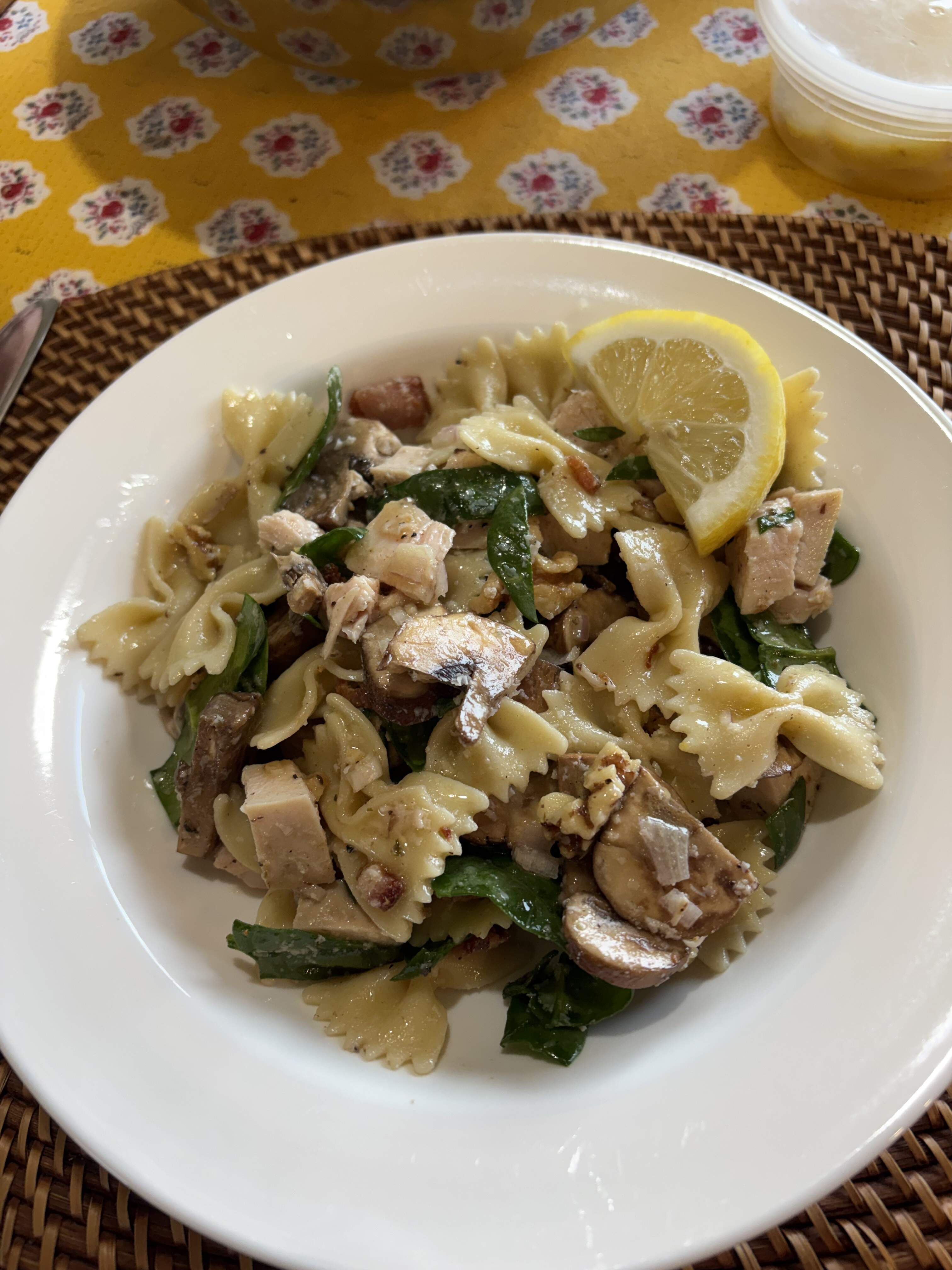 Pasta salad with bowties, garden spinach, bacon, mushrooms, walnuts, shallots, parm, and leftover Amalfi chicken. Tossed in a standard vinaigrette, and leftover lemon-chicken sauce passed on the side. Good stuff.