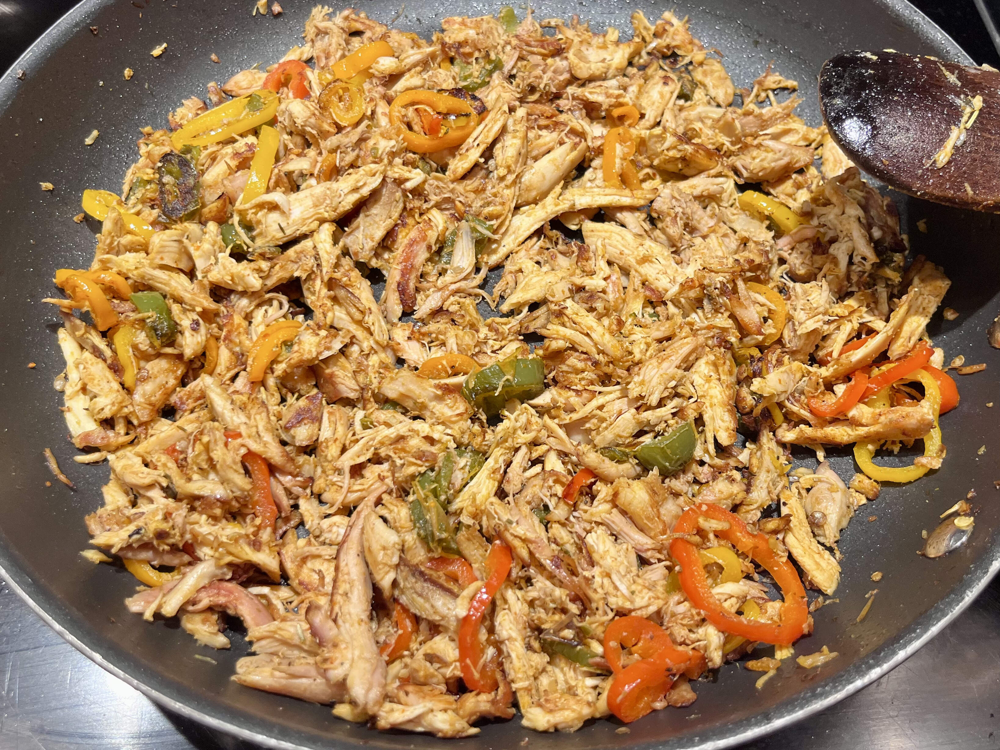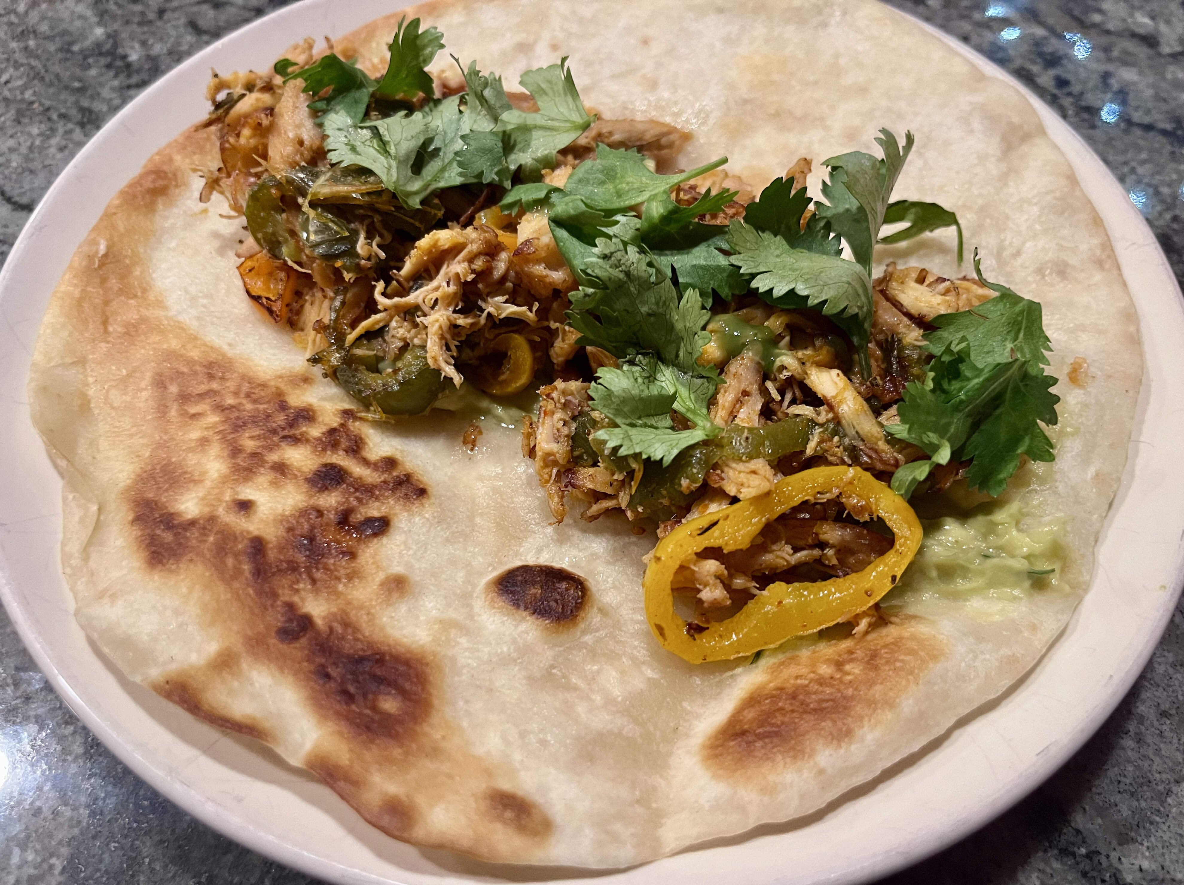 I threw in the last of the 2 “hot-but-yer-lying-bruh” hallapeenos to add those alongside a trio of sliced mini peppers, providing kronch for the chicken tacos I made with seasoned (cumin, smoked paprika, Penzey’s Northwoods) roti chicken. Es Taco Toozday, cabrones