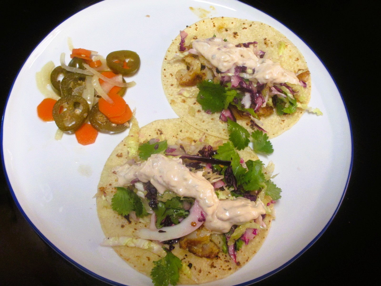 “Es Taco Toozday” here too. Cod with cabbage slaw and chipotle tartar sauce. Bread and butter jalapenos with carrot and onion. Sangria.