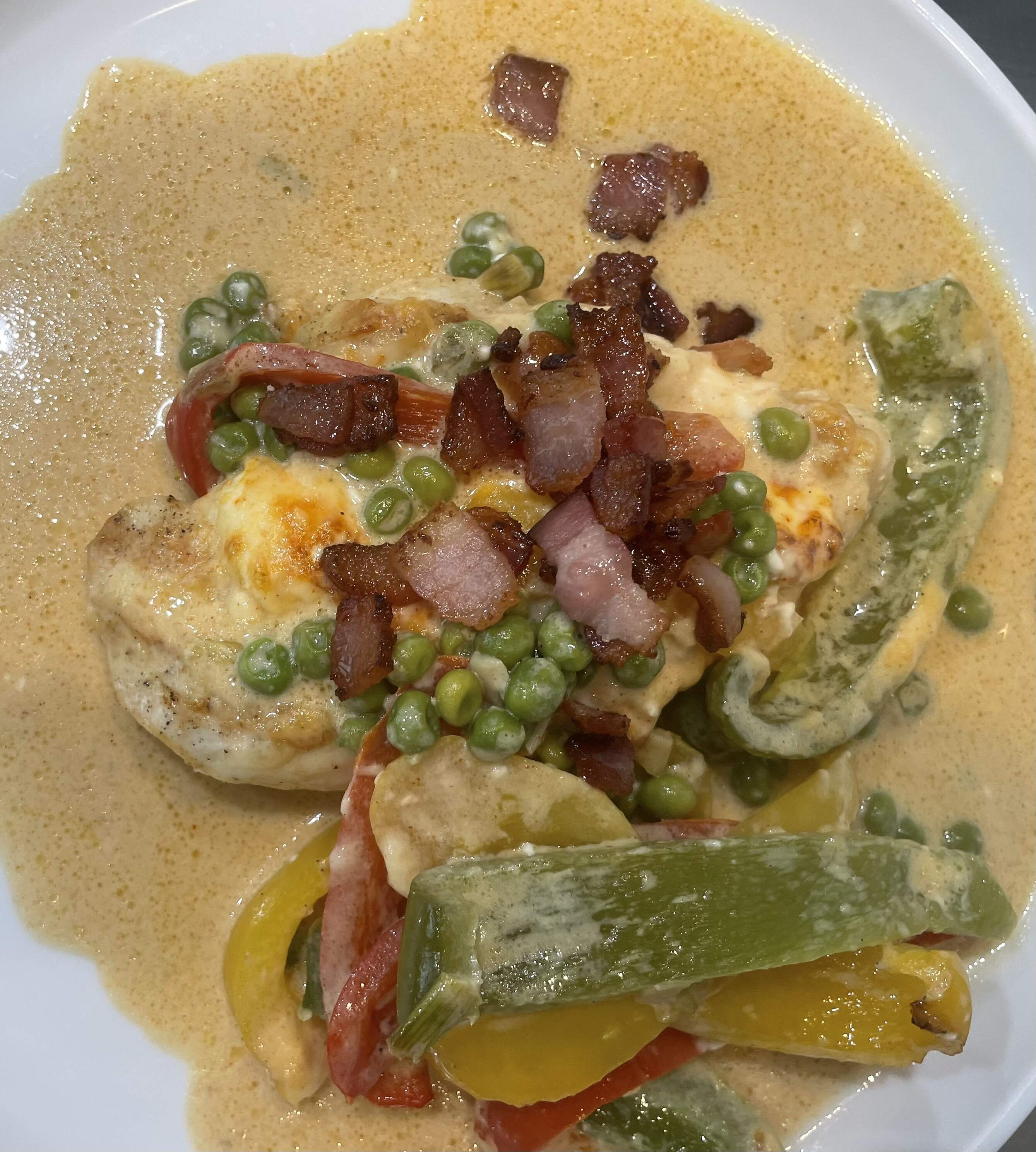 Chicken Breast with Bell Peppers - chicken breasts are quickly seared. Red, green and yellow bell peppers, scallions and peas are sautéed and briefly cooked in vegetable broth and some heavy cream. The vegetables mixture is poured into a casserole dish and topped with chicken breasts. Each chicken breast is covered with a cream cheese-milk-smoked paprika mix and topped with grated cheddar. Finished in the oven for 15 minutes and topped with some crispy bacon