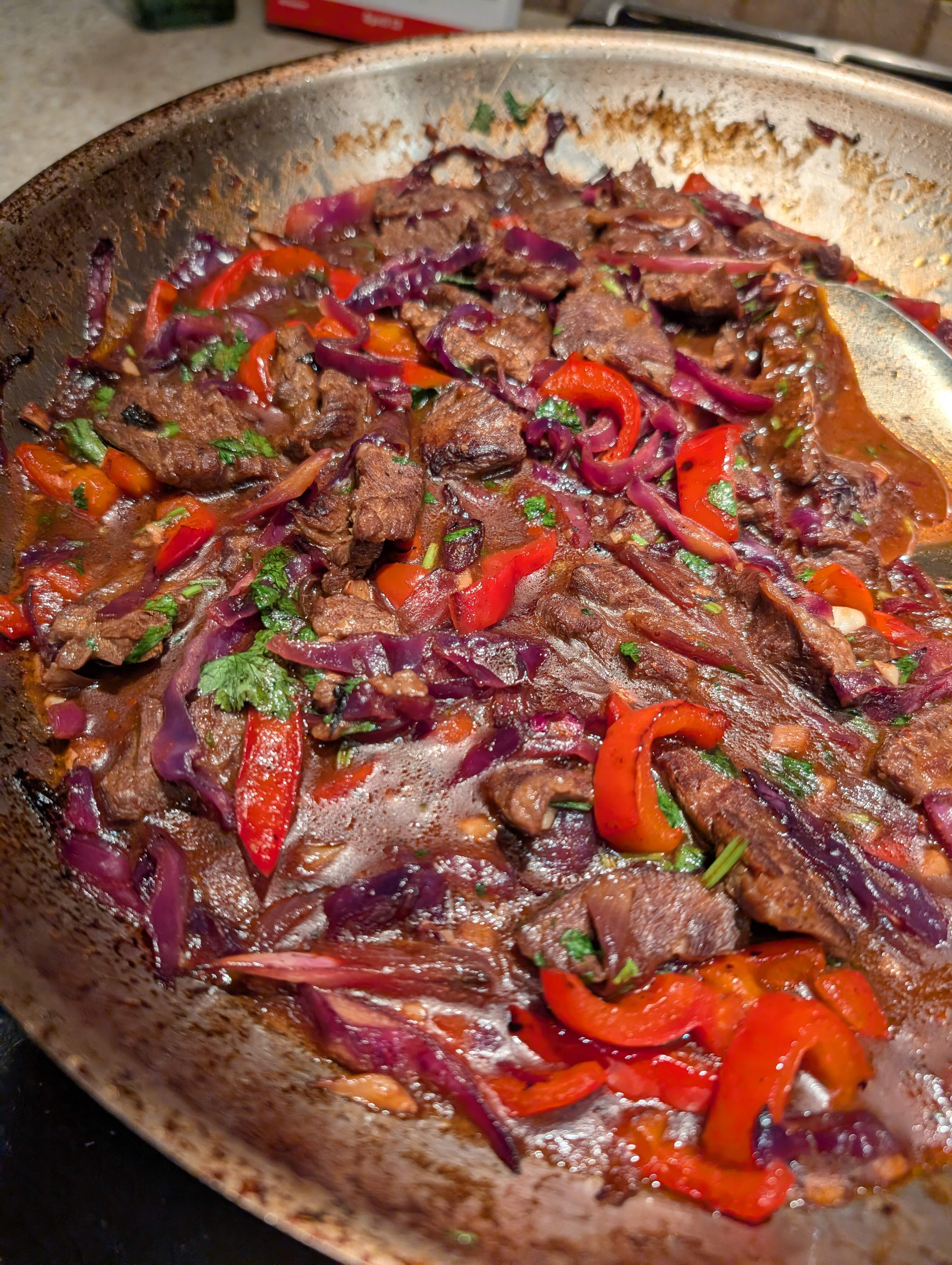 Beef stir fry with red cabbage, red bell pepper, red onion and lots of cilantro for a hit of green.