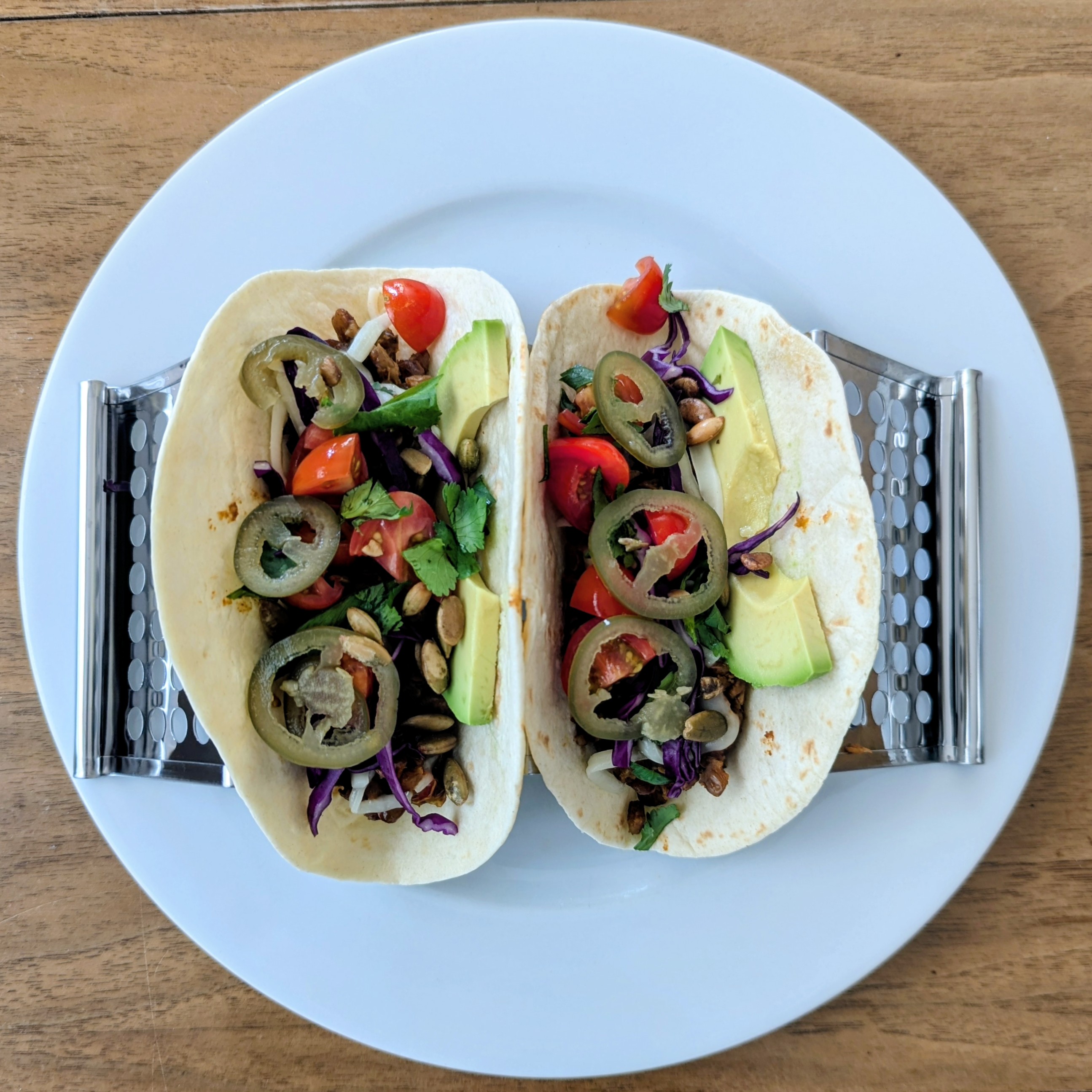Instant Pot lentil tacos with queso quesadilla, red cabbage, pickled jalapeños, avocado, pepitas, and tomatoes. Hot salsa added post photo.