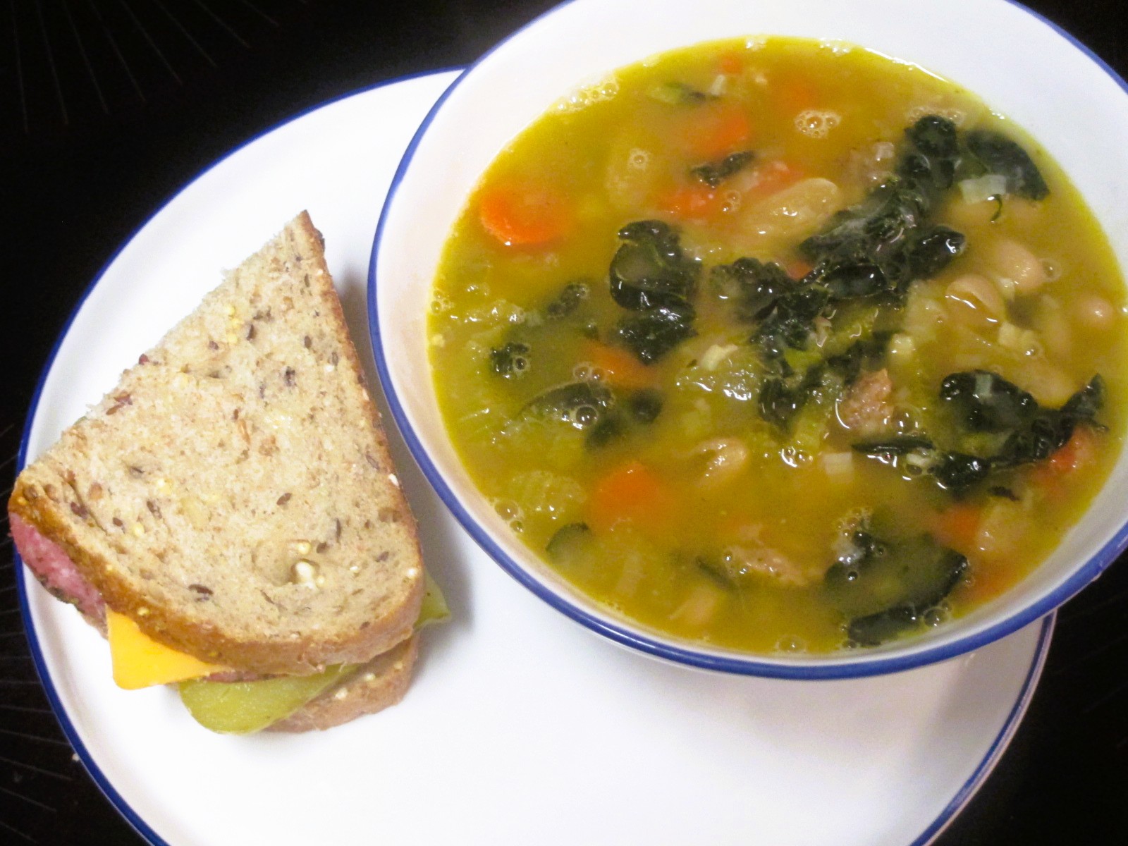 I wasn’t very hungry. Bean and sausage soup from the freezer, the other half of the salami, cheese and pickle sandwich I had for lunch.