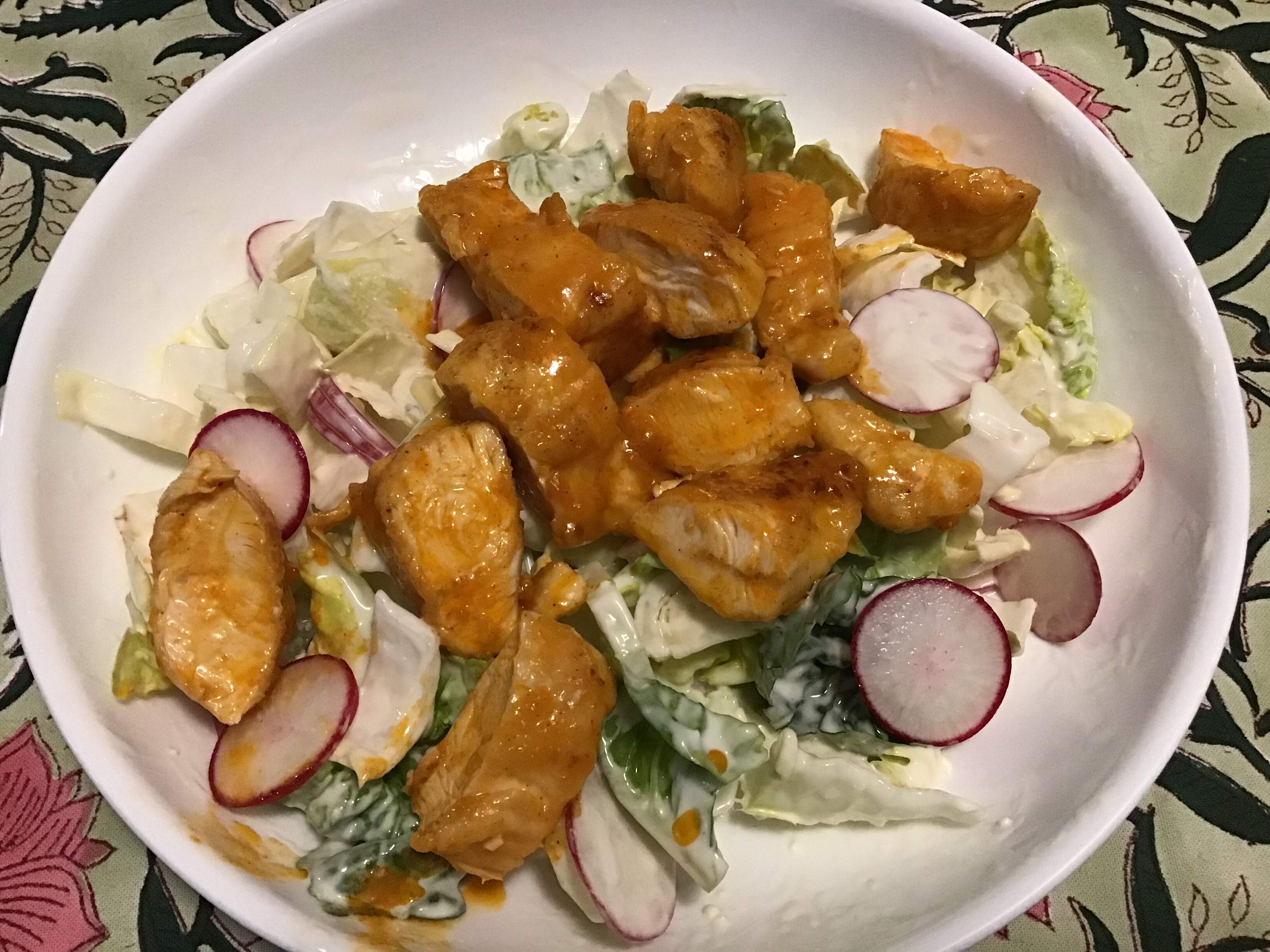 Big blue cheese salad with buffalo chicken. Memo to self: make more dinner salads, they make you happy. And if you wash the lettuce early in the day they are easy.