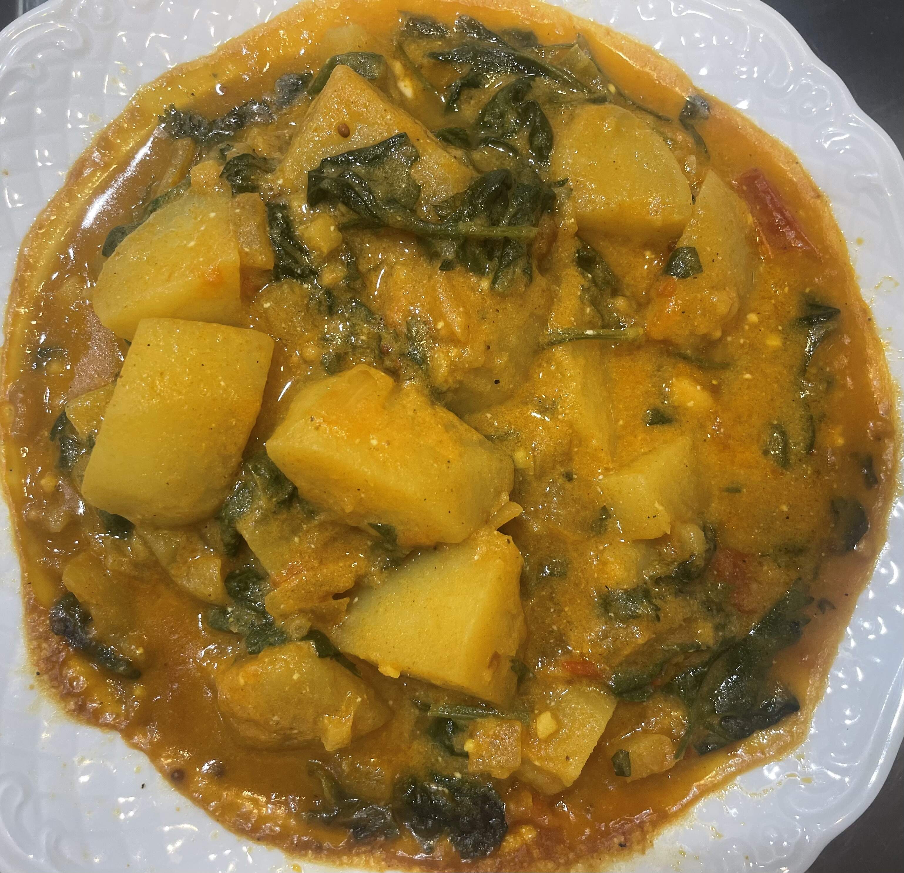 Vadouvan Potato Curry with Spinach and Yogurt from an essen & trinken magazine recipe - potatoes, vadouvan curry powder, ginger, garlic, shallots, tomatoes,tomato paste and serrano chili are cooked in a vegetable broth coconut milk mixture. Baby soinach is added towards the end and finished with yogurt, cilantro and mint