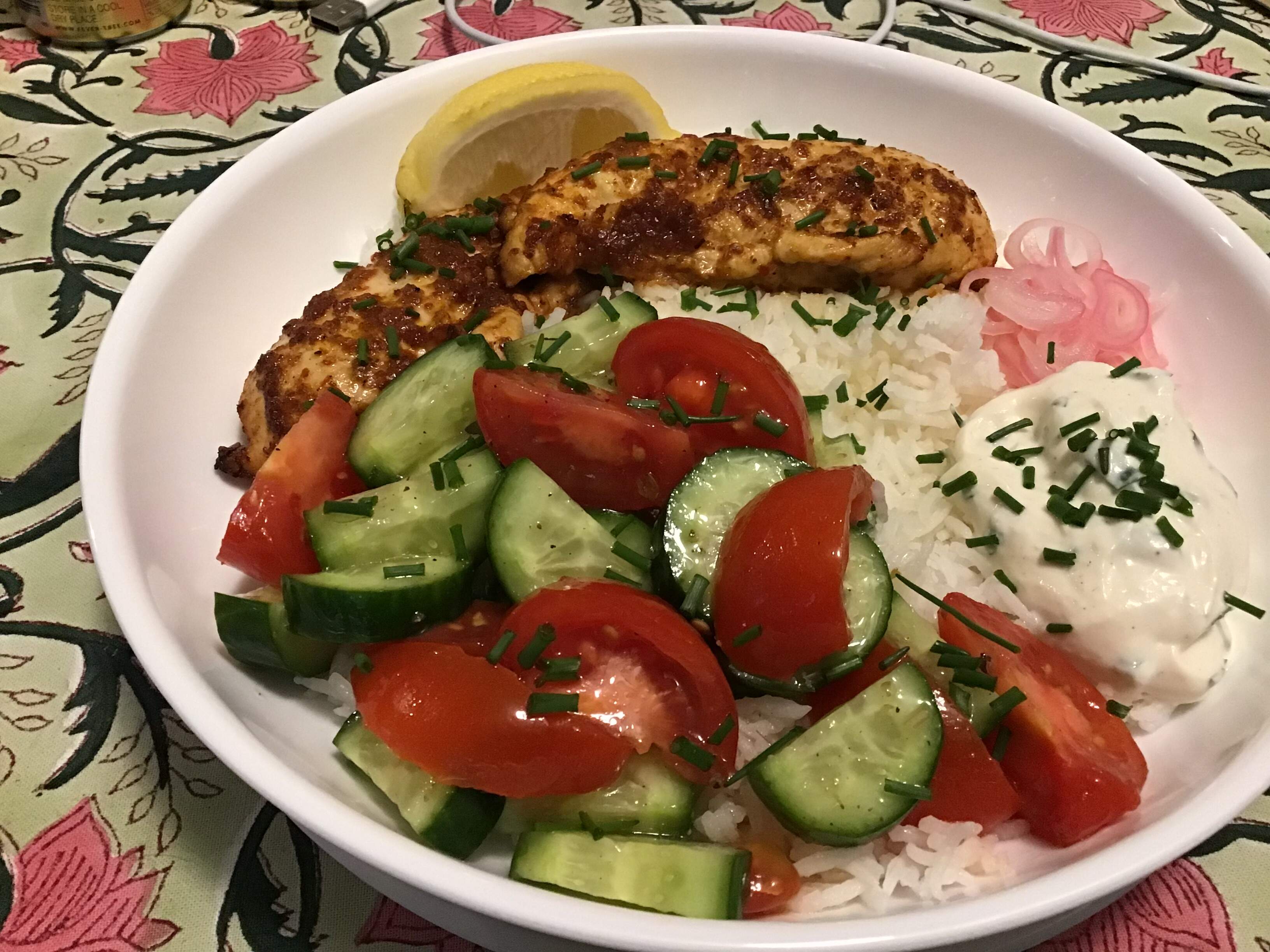 Harissa chicken rice bowl. First garden chives of the year.