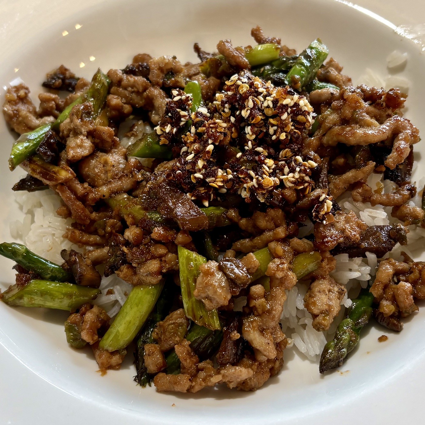 Pork and asparagus stir fry over rice. Since I didn’t have quite as much asparagus as I would have liked, I raided our pasta salad fixings for a couple of cremini mushrooms. Didn’t hurt.